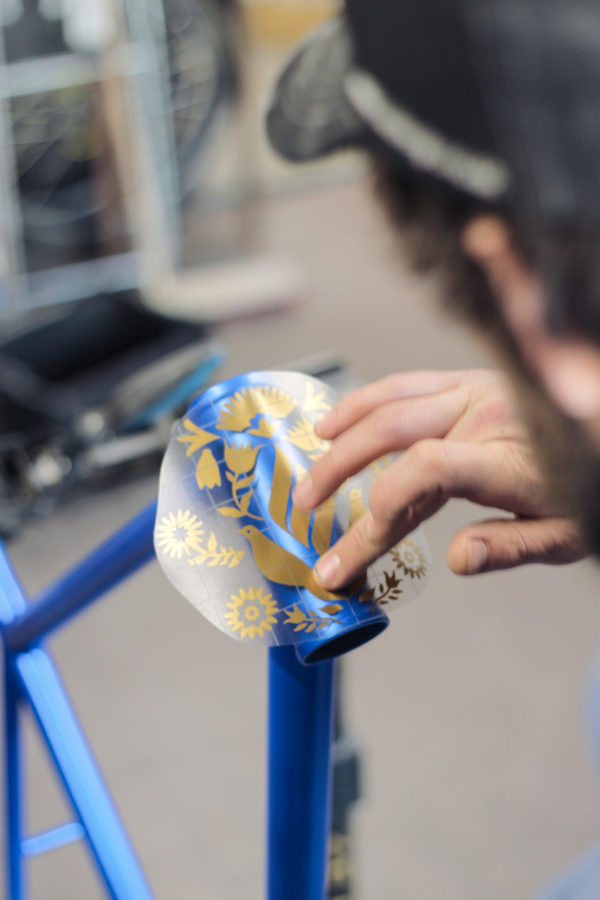 la petite histoire Préparation du travail de peinture du vélo de Bike Polo de Devora, réalisée grâce à de multiples masques. Une peinture et des motifs inspirés par des broderies indigènes appelées “Otomí”. Des broderies historiquement réalisées dans les montages d’Hidalgo au Mexique, d’où viennent les origines indigènes de Devora (drapeau mexique) PHOTOS