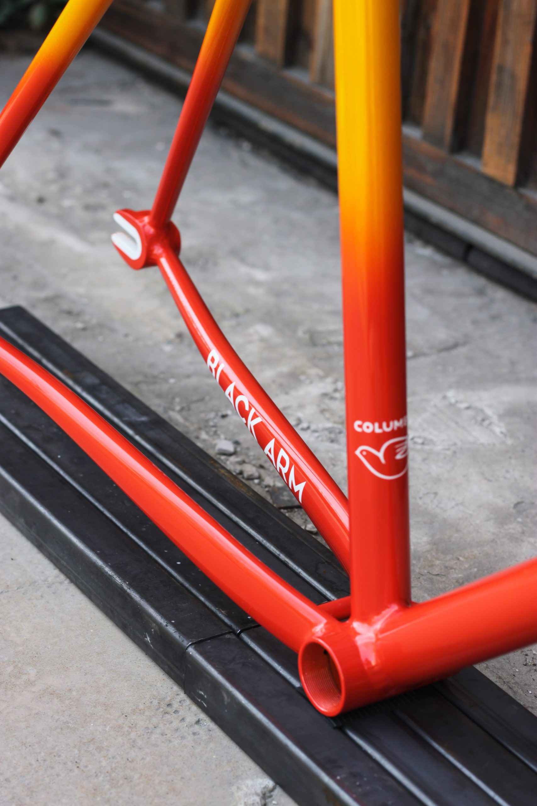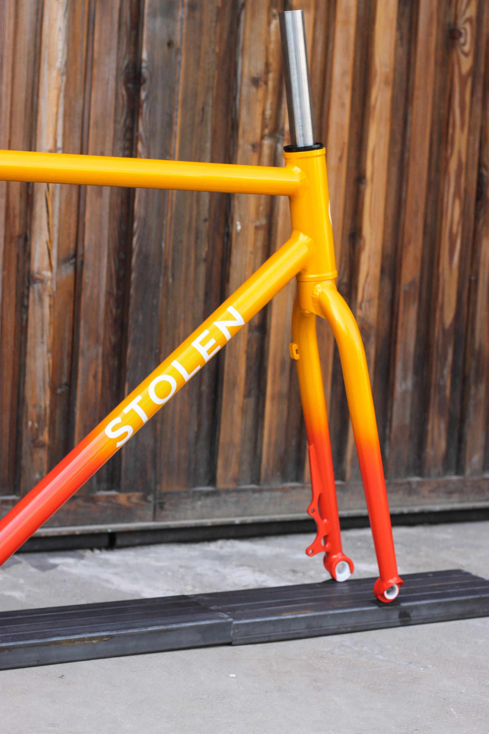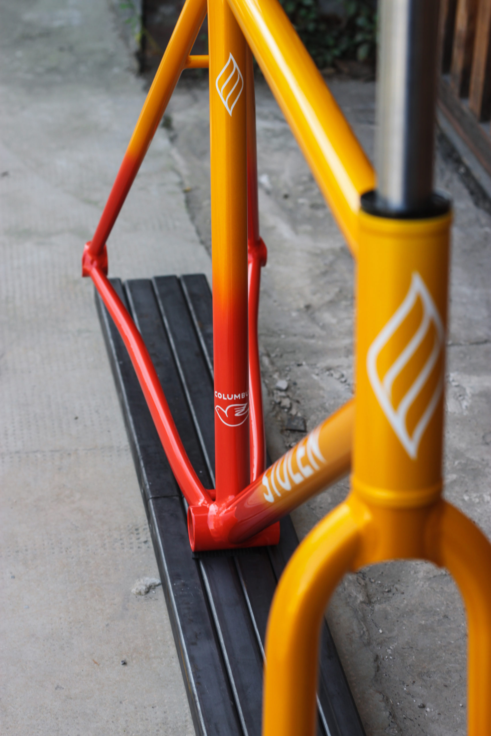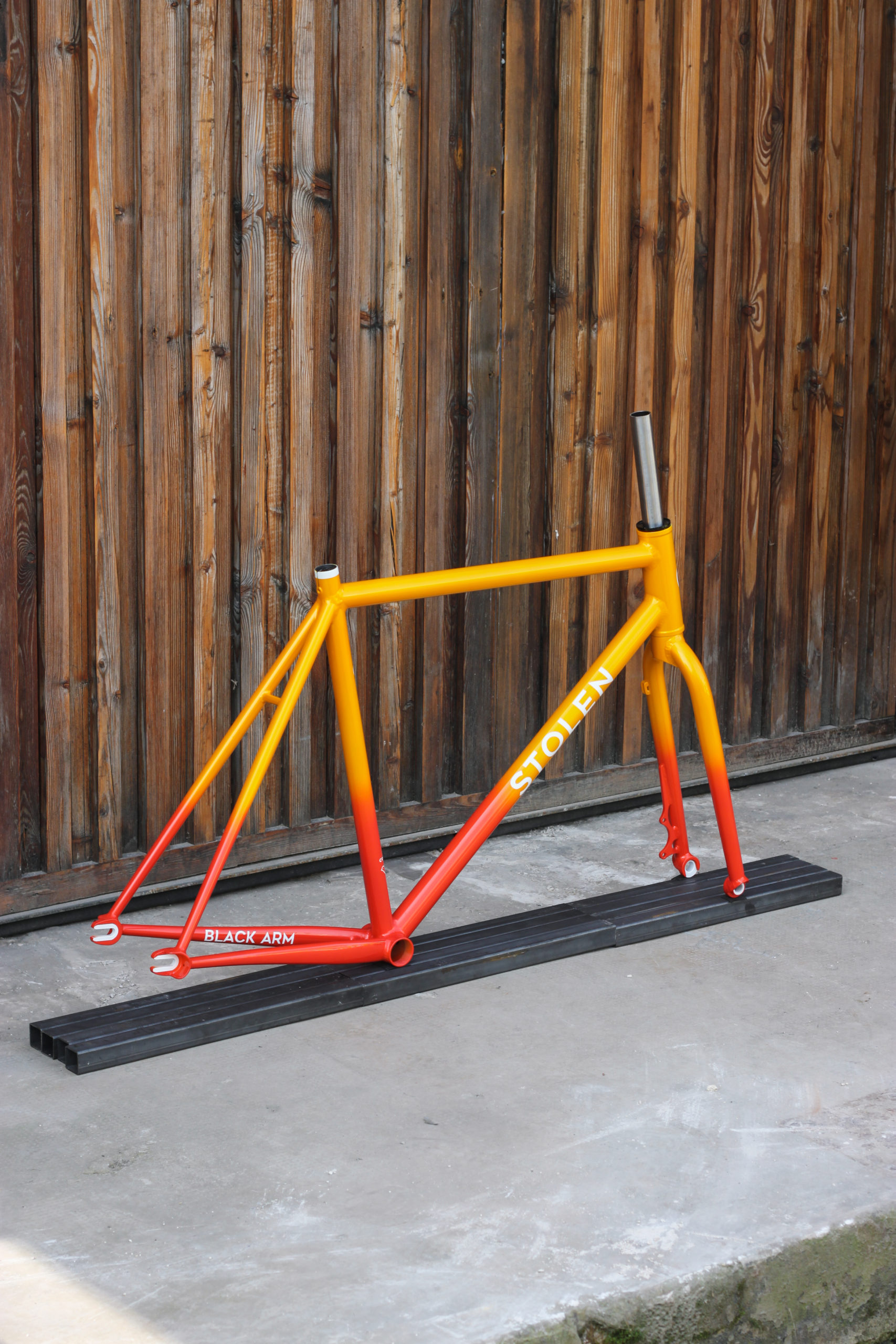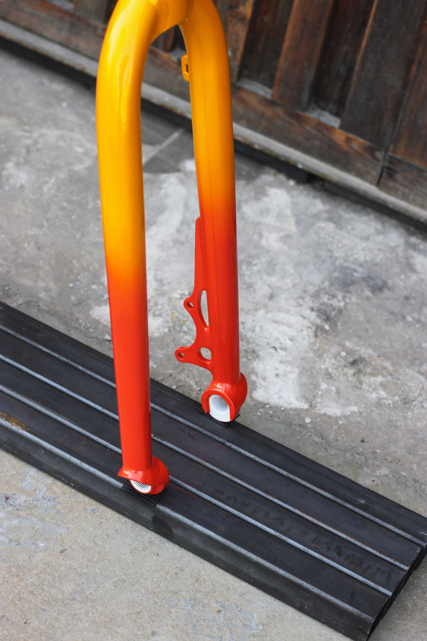 Polo bike for Bastien in 27.5” with our new standard geometry and classic finishes including Paragon tapered steerer and 15mm thru-axle. Bastien chose a lovely colorway which turned out great, orange to yellow sunrise fade with white graphics. This frameset looks great, can’t wait to see it built up!