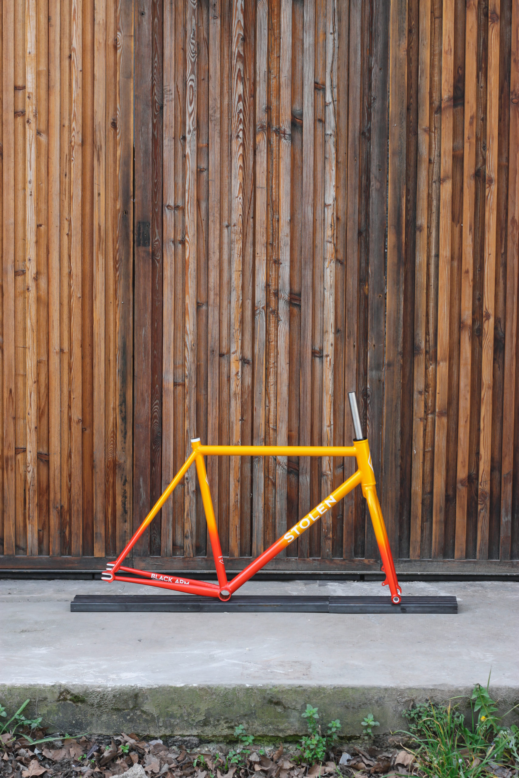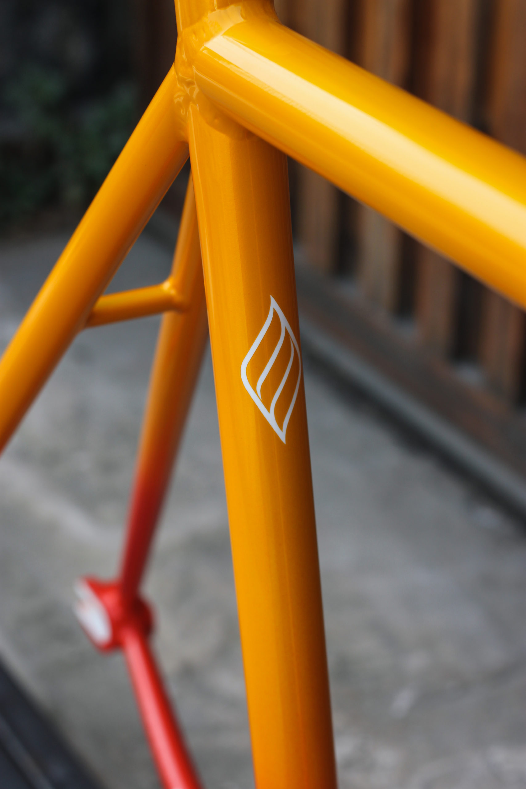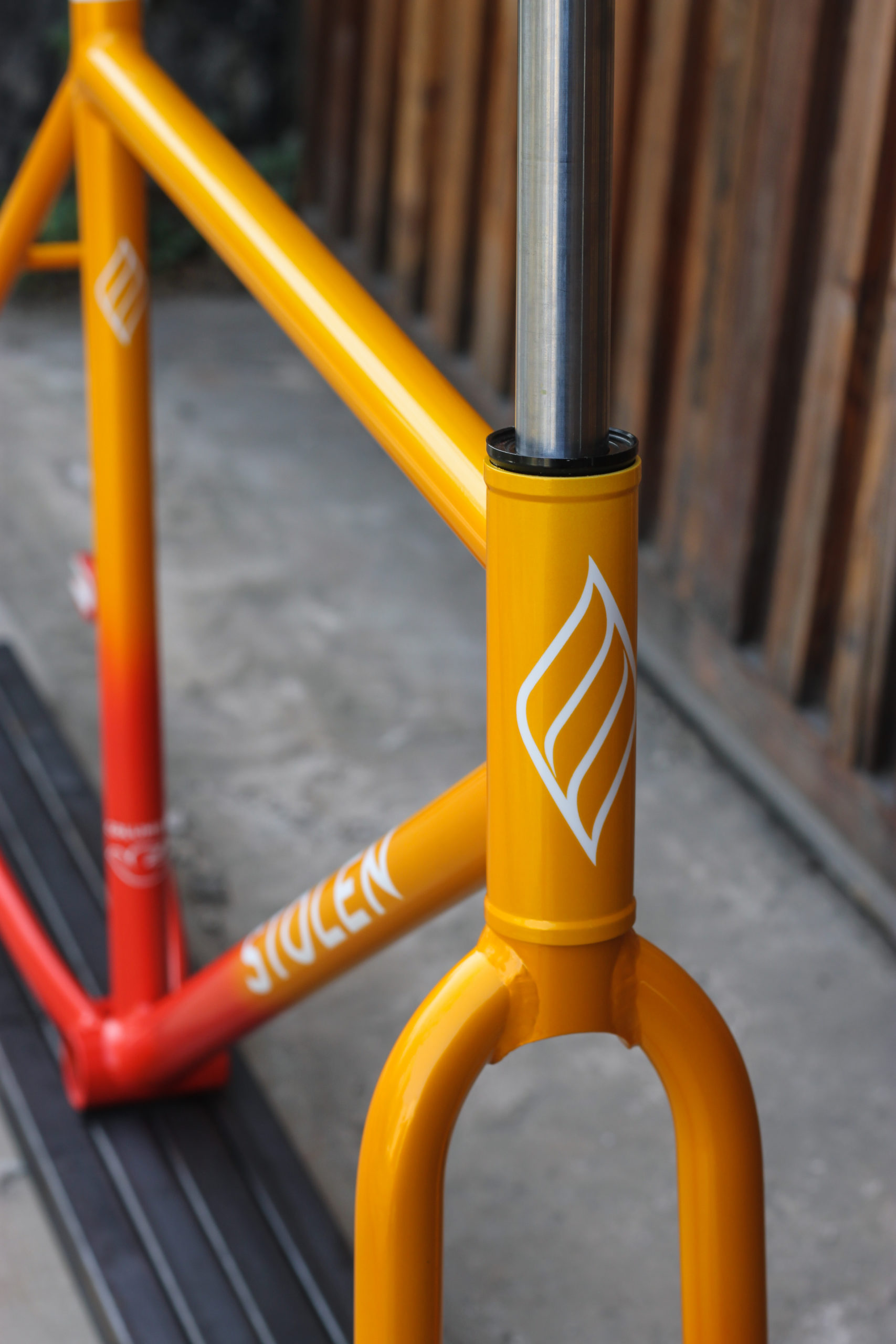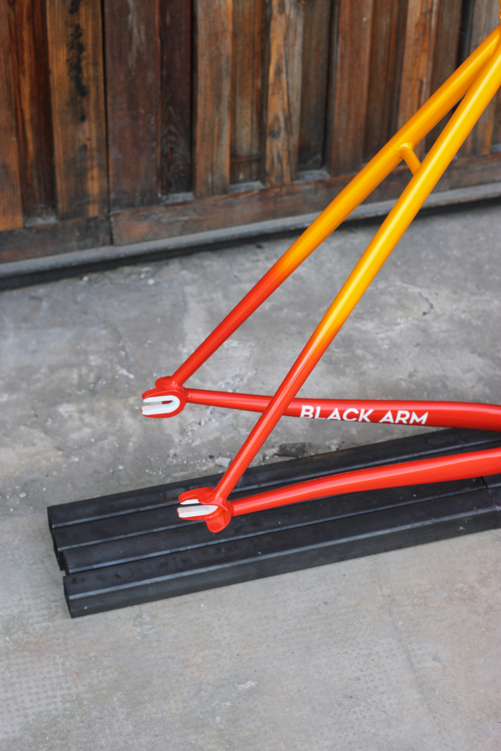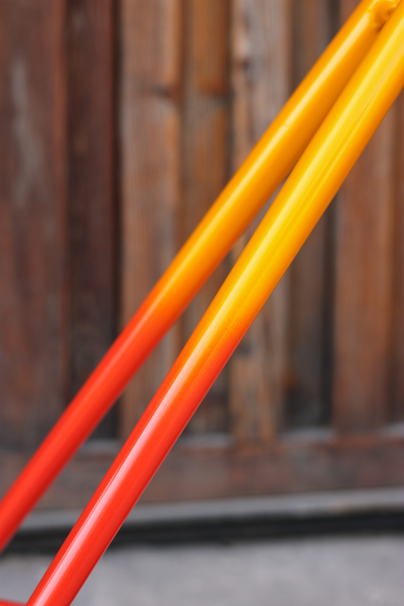 Polo bike for Bastien in 27.5” with our new standard geometry and classic finishes including Paragon tapered steerer and 15mm thru-axle. Bastien chose a lovely colorway which turned out great, orange to yellow sunrise fade with white graphics. This frameset looks great, can’t wait to see it built up!