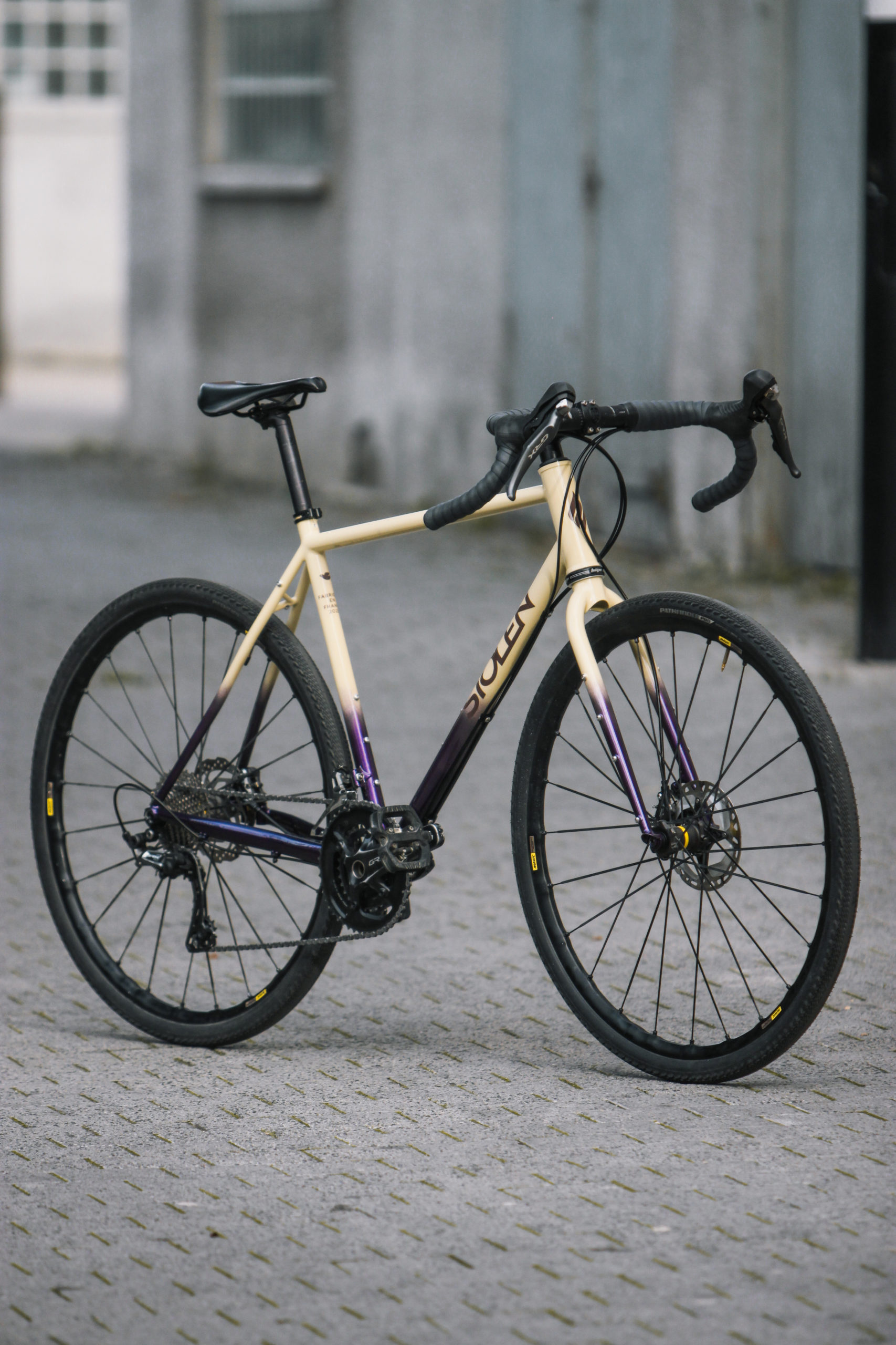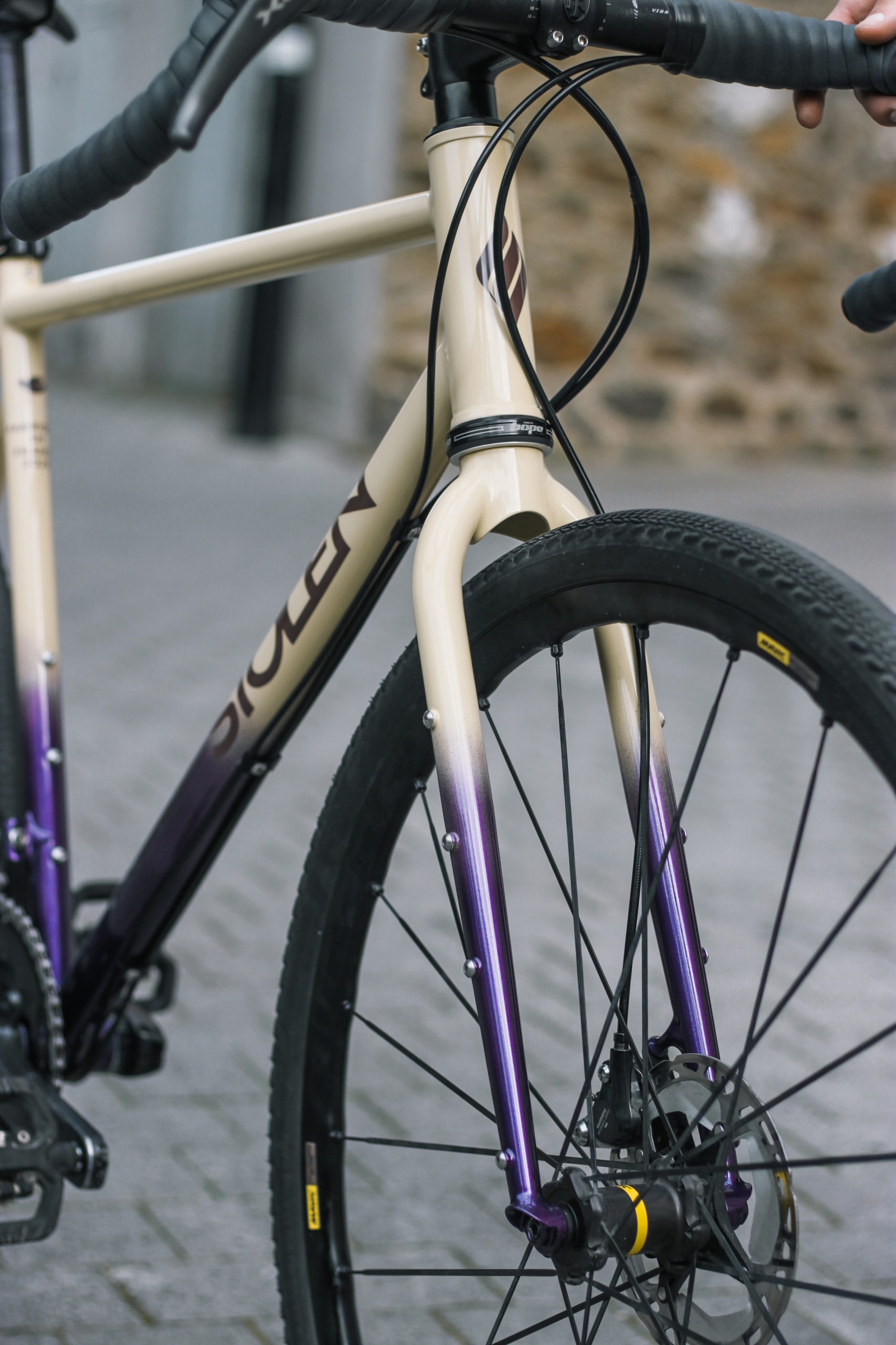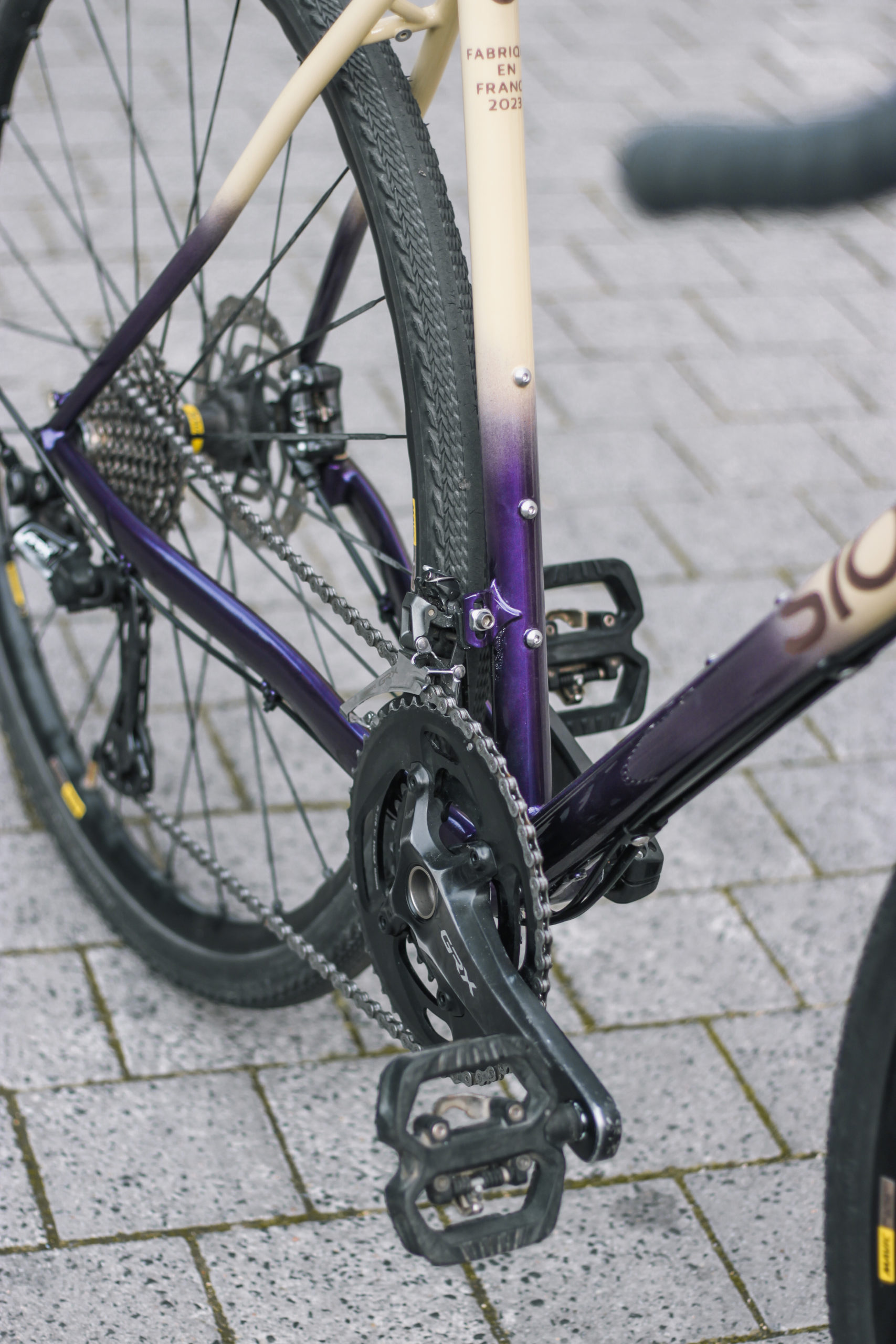 Shimano GRX groupset + Mavic all road wheelset from Rudy’s previous bike. Stylish pale cream to metallic purple fade paintjob.