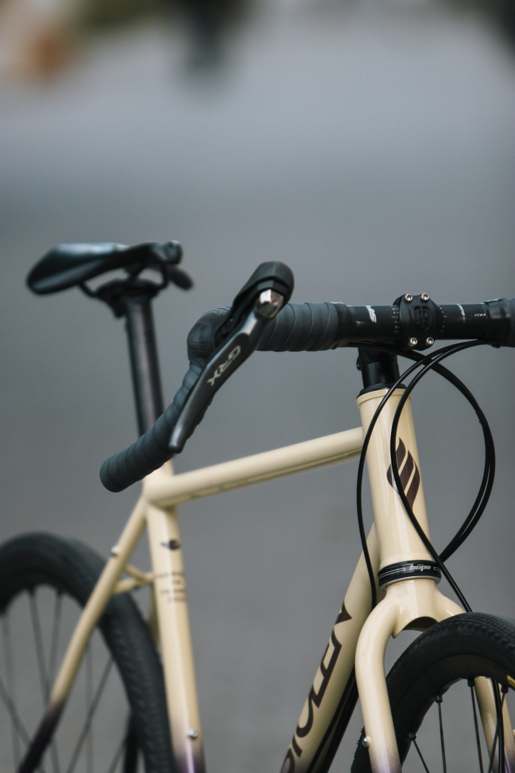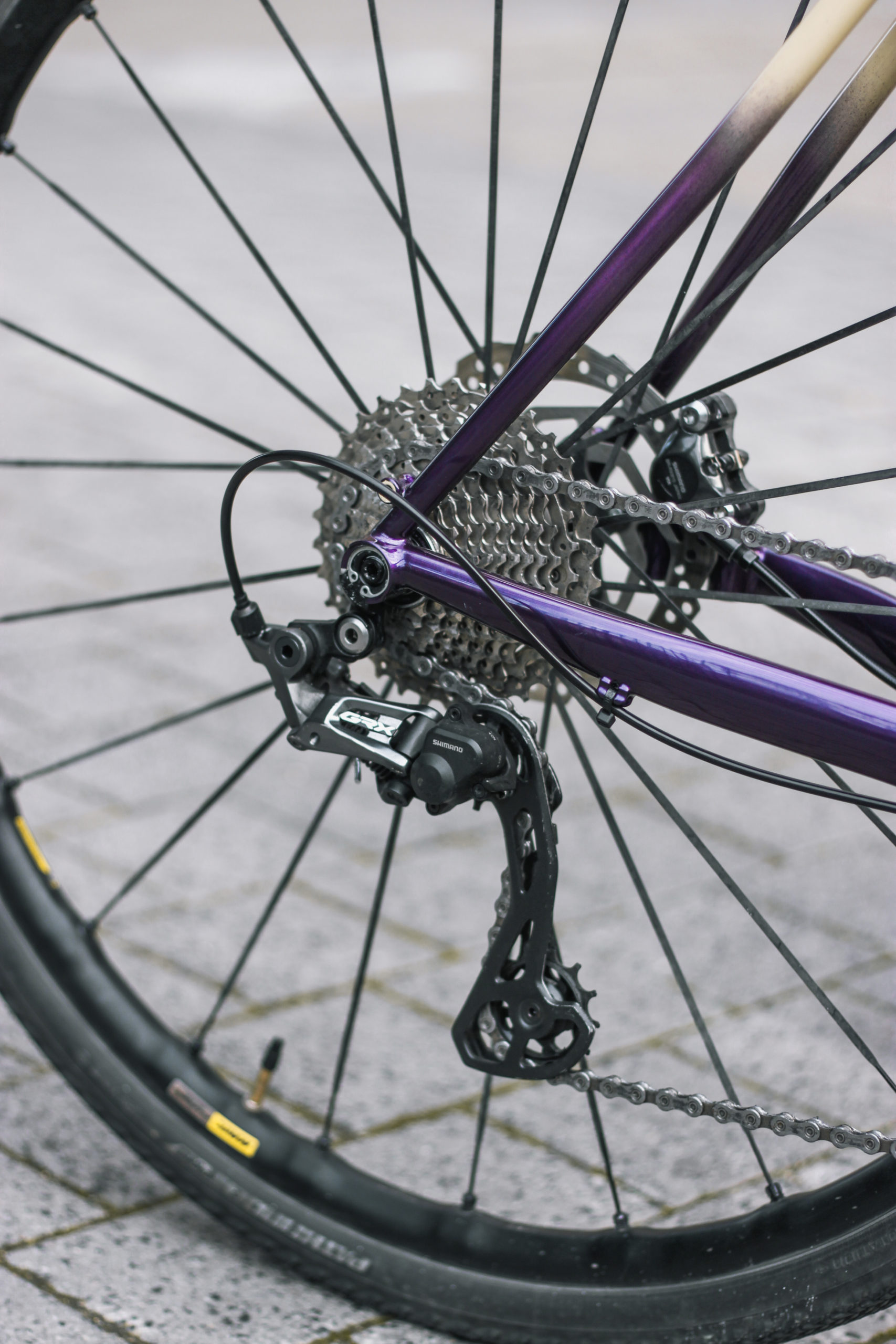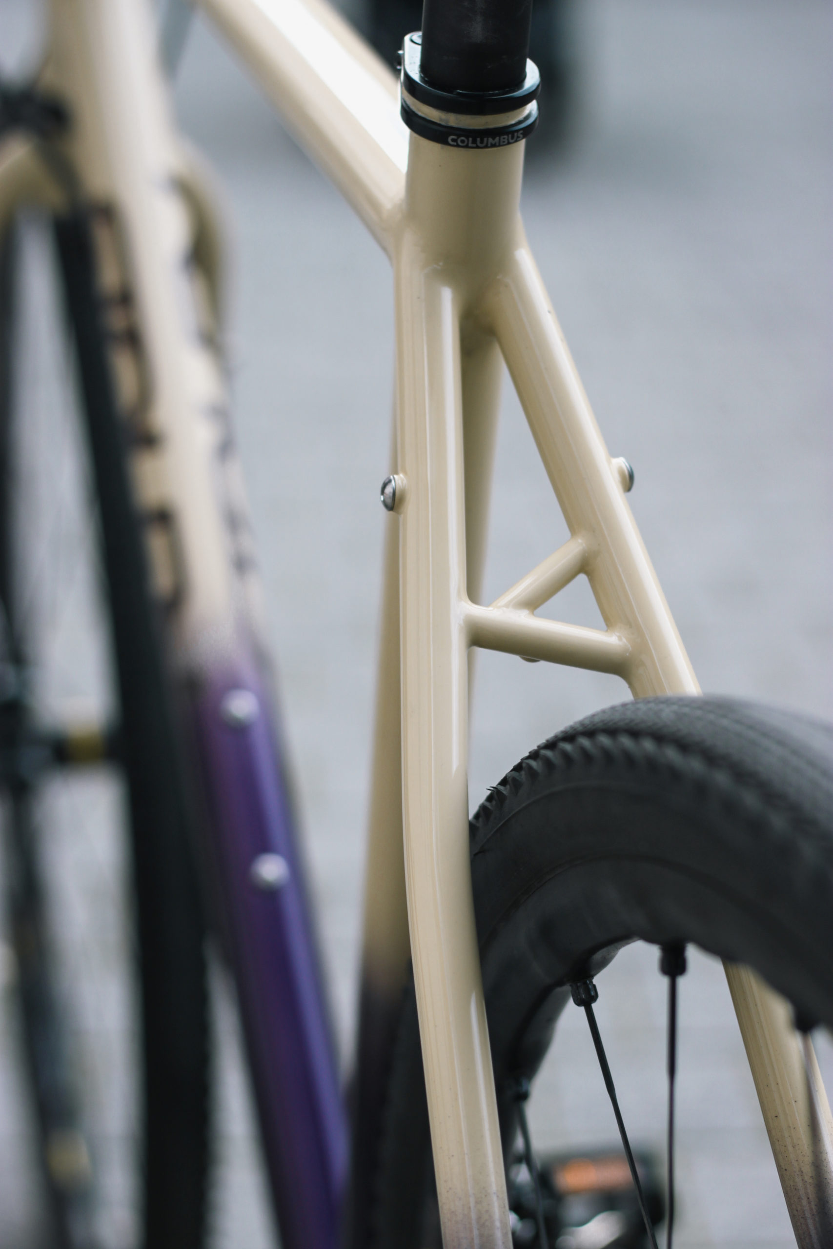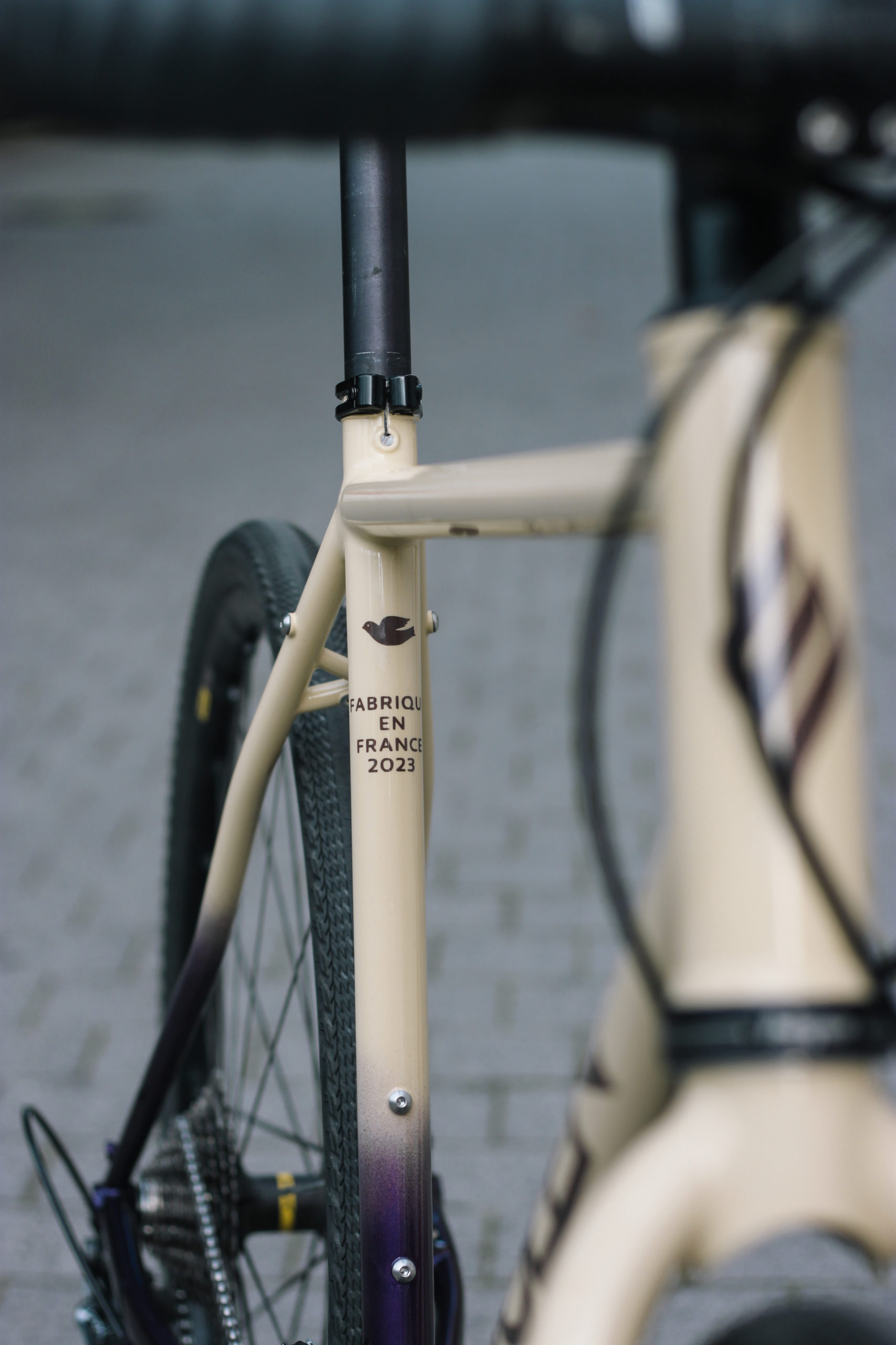 Shimano GRX groupset + Mavic all road wheelset from Rudy’s previous bike. Stylish pale cream to metallic purple fade paintjob.