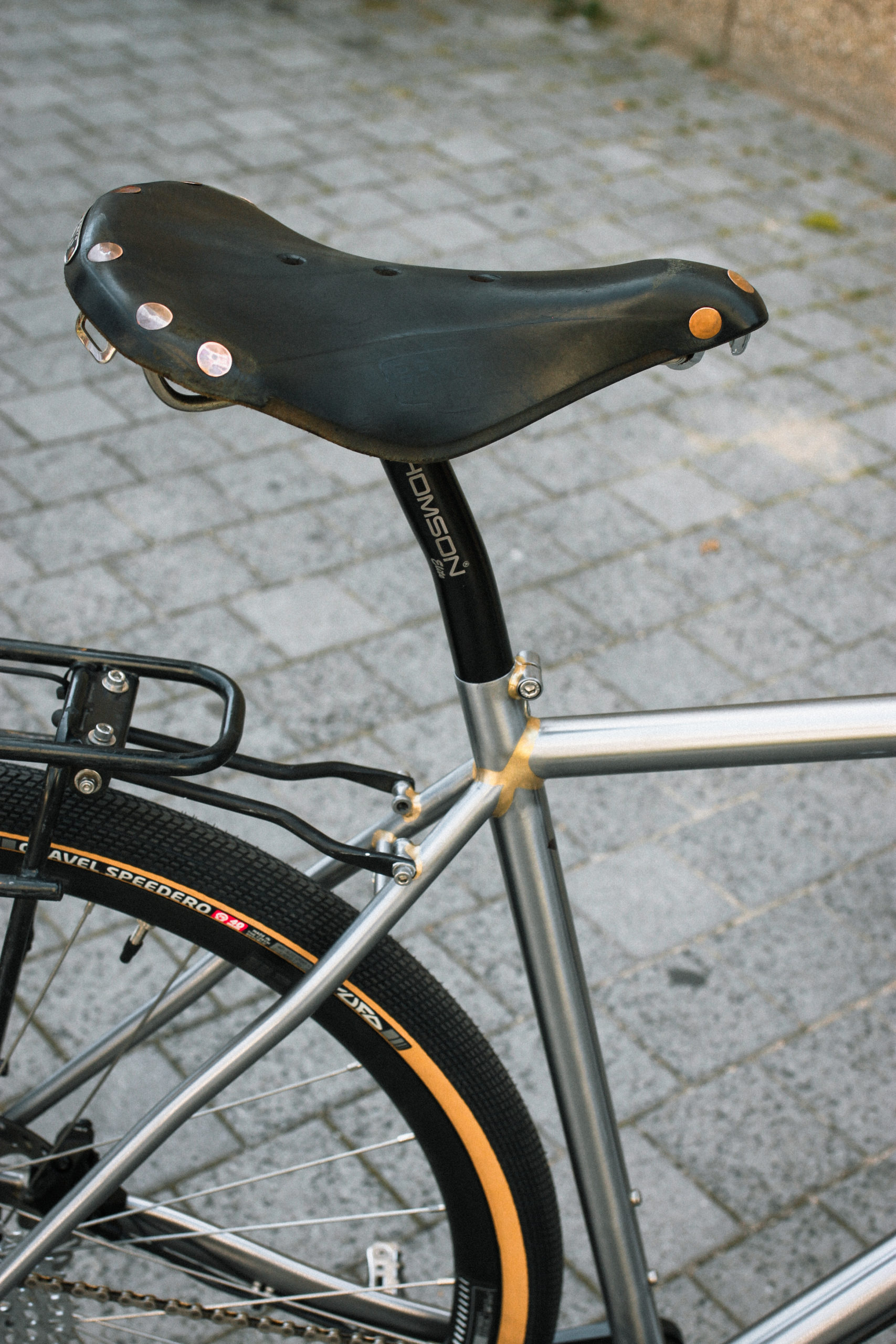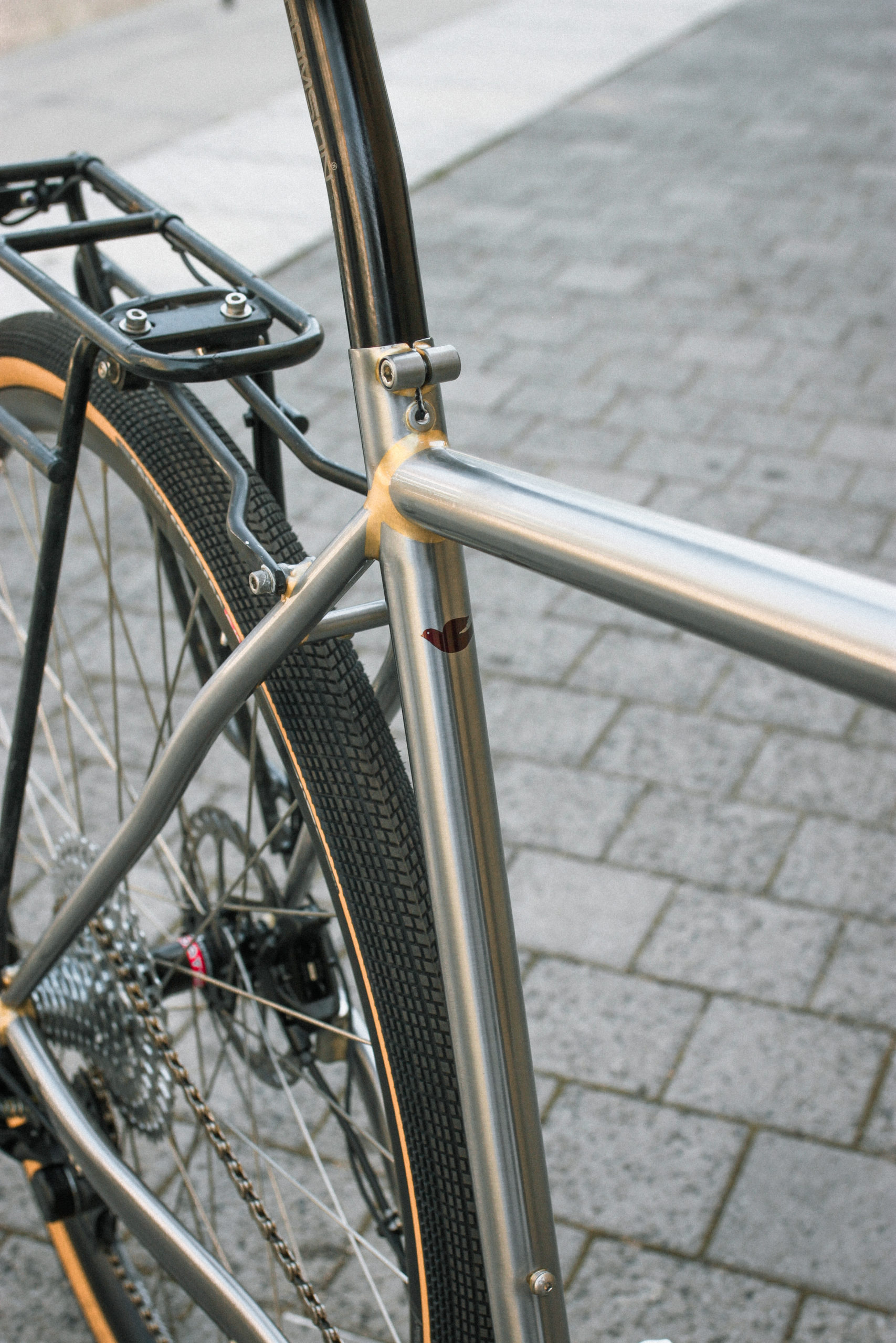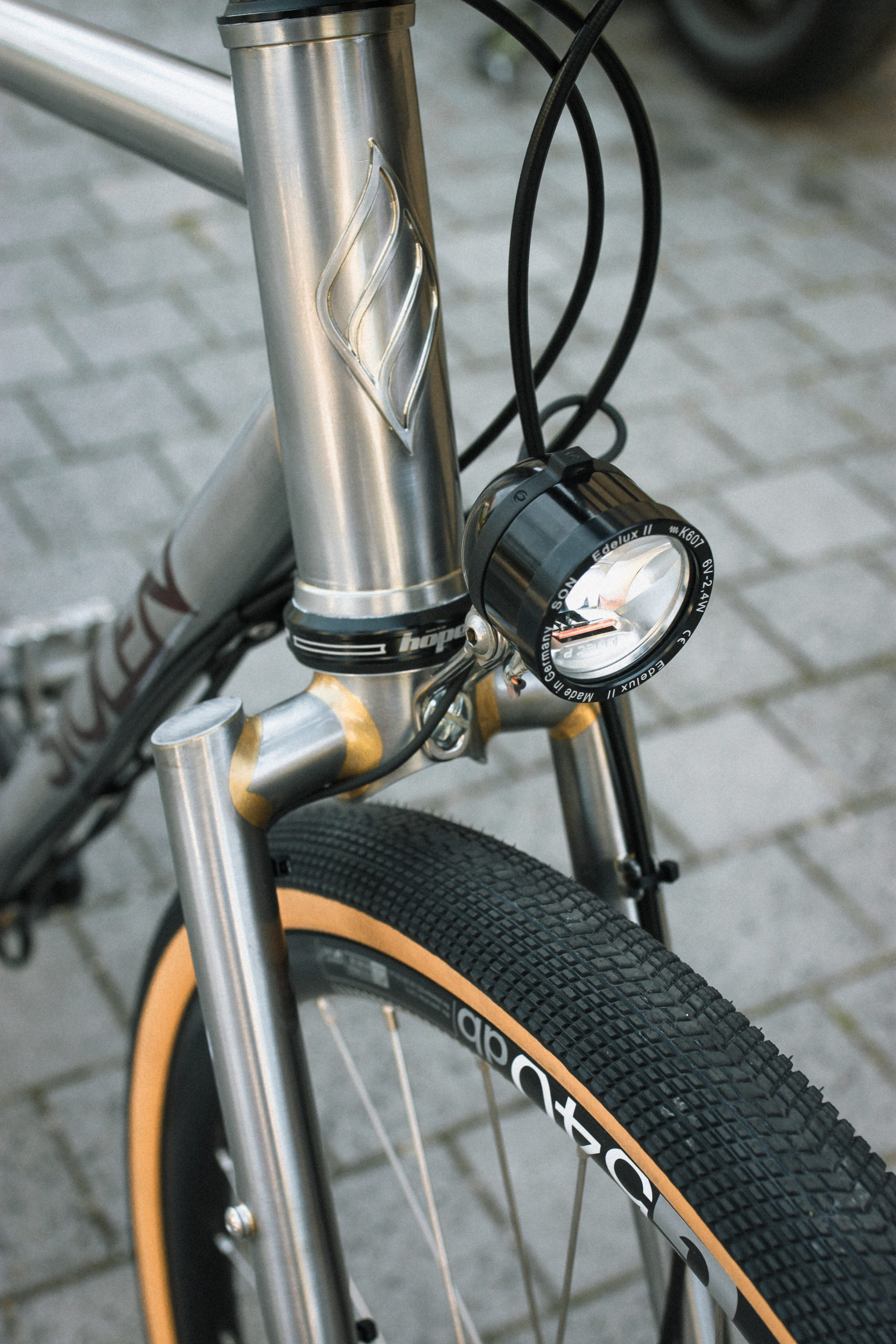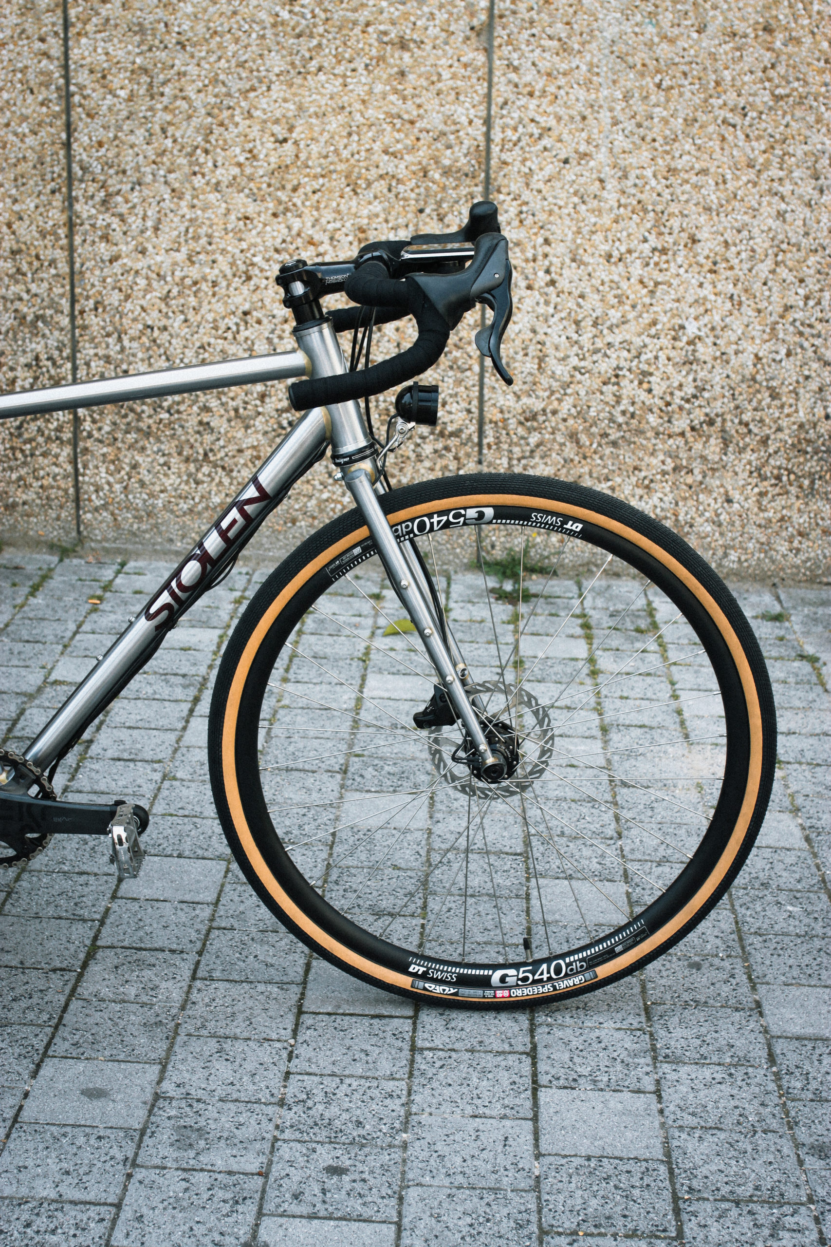 Ulf’s 57cm touring bike with Columbus life + spirit tubing. Custom segmented straight bladed fork with paragon 15mm thru axle dropouts. Campagnolo 13spd EKAR groupset with DT Swiss G540 rims laced to Novatech/SON Dynamo hubs. Thomson finishing kit with Ritchey Beacon flared handlebars.