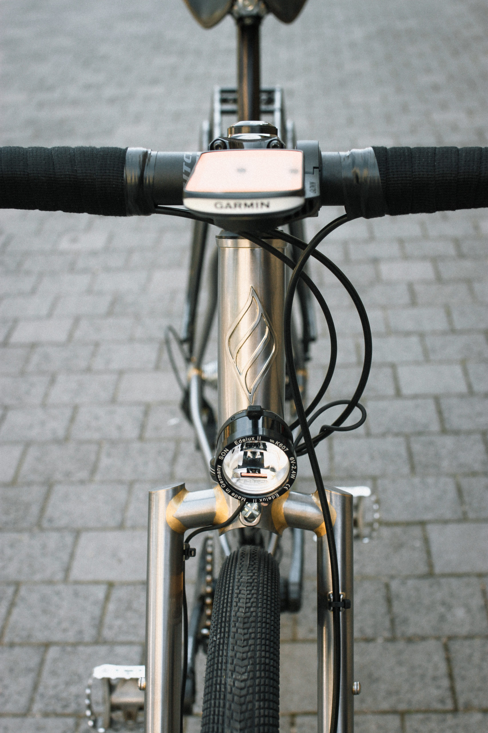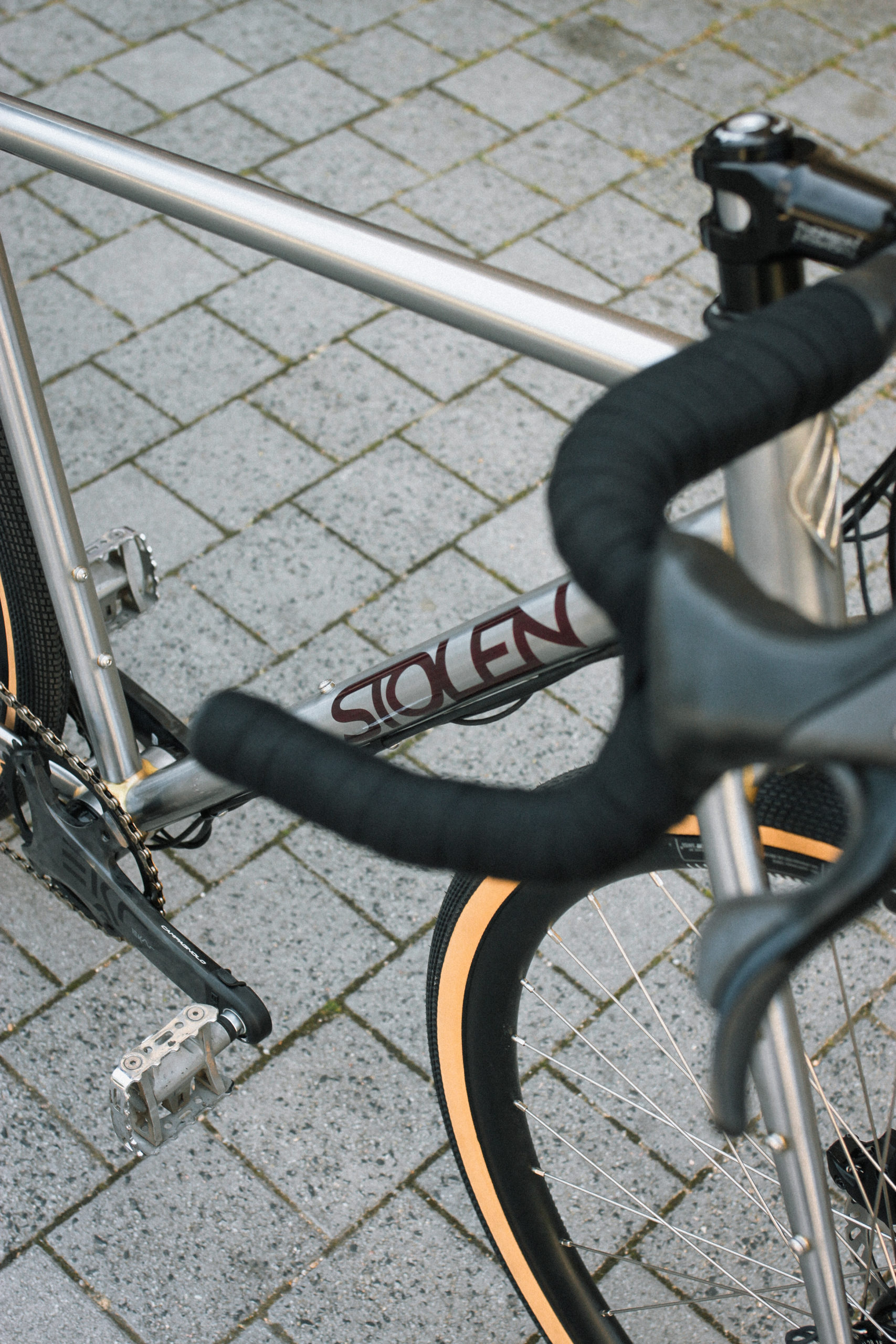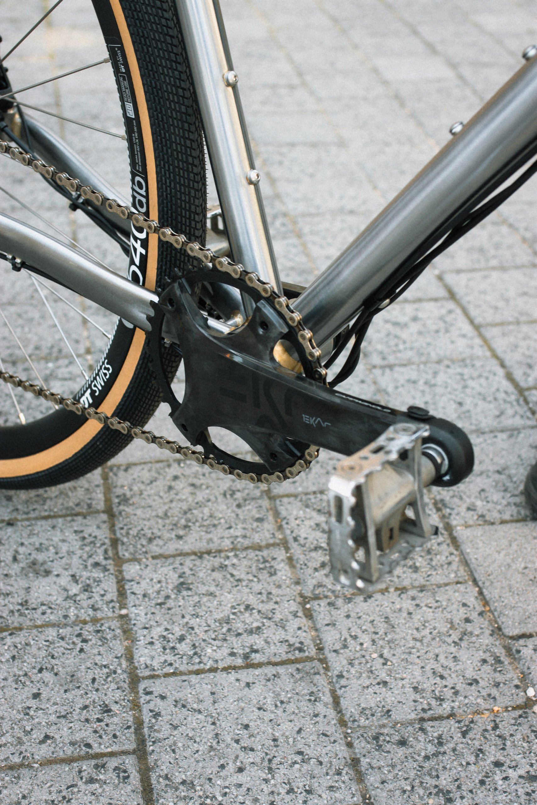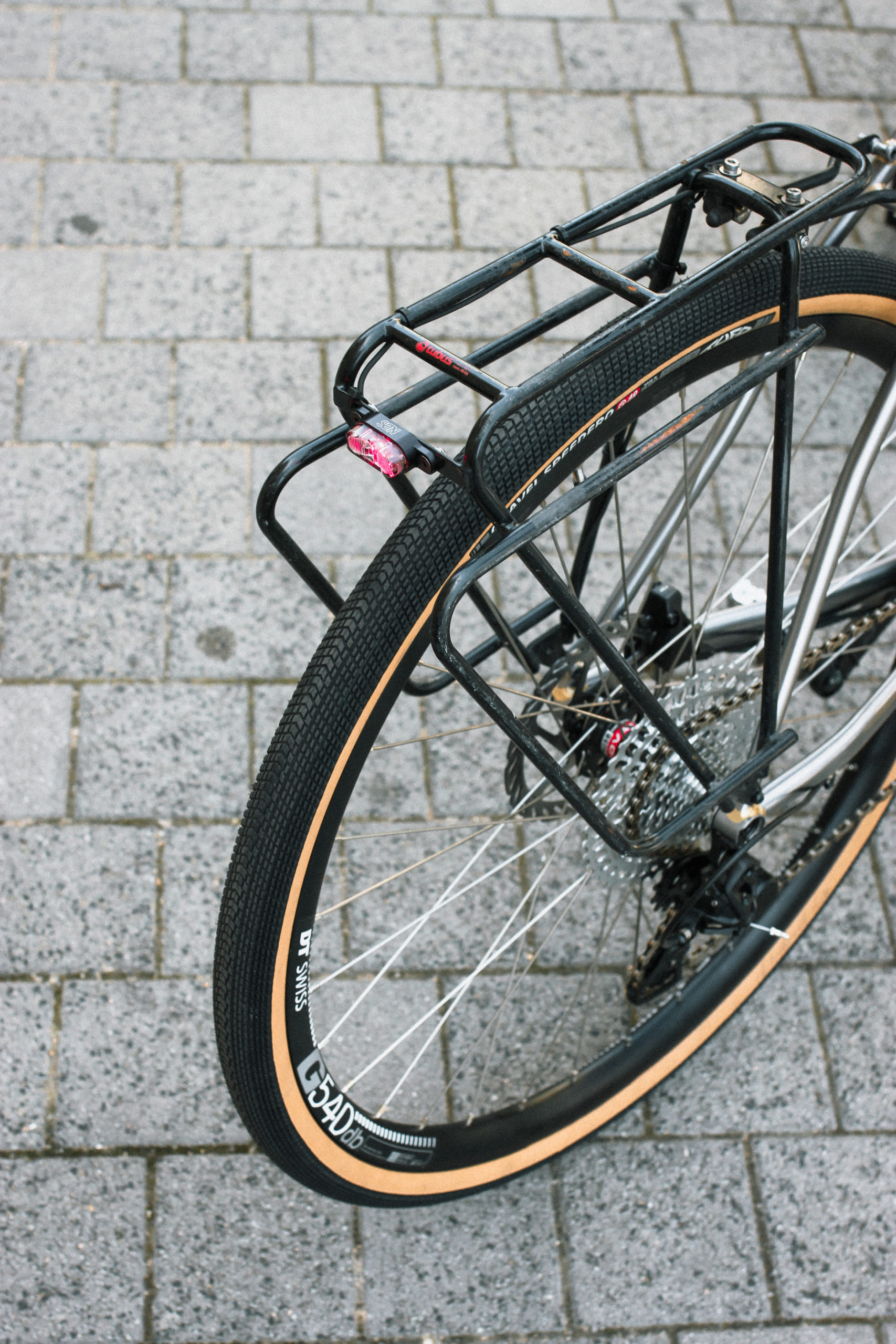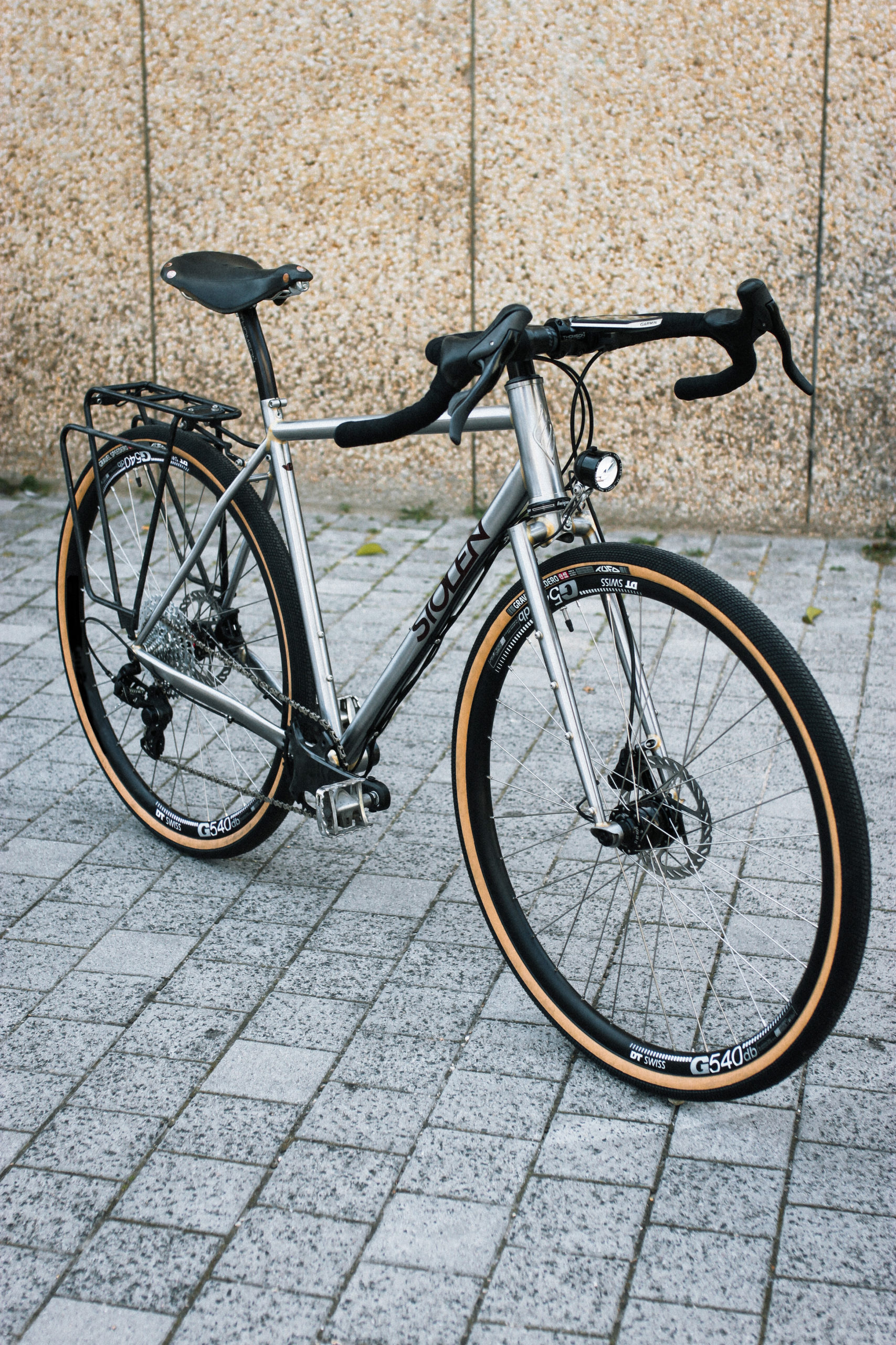 Ulf’s 57cm touring bike with Columbus life + spirit tubing. Custom segmented straight bladed fork with paragon 15mm thru axle dropouts. Campagnolo 13spd EKAR groupset with DT Swiss G540 rims laced to Novatech/SON Dynamo hubs. Thomson finishing kit with Ritchey Beacon flared handlebars.
