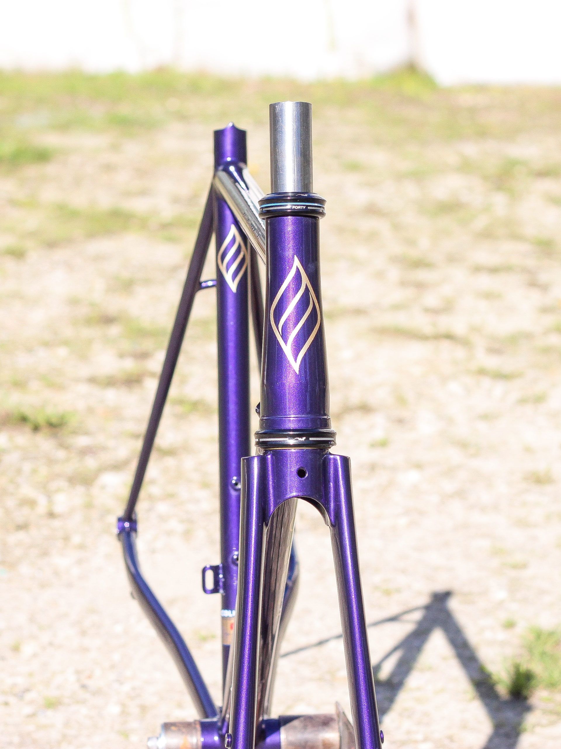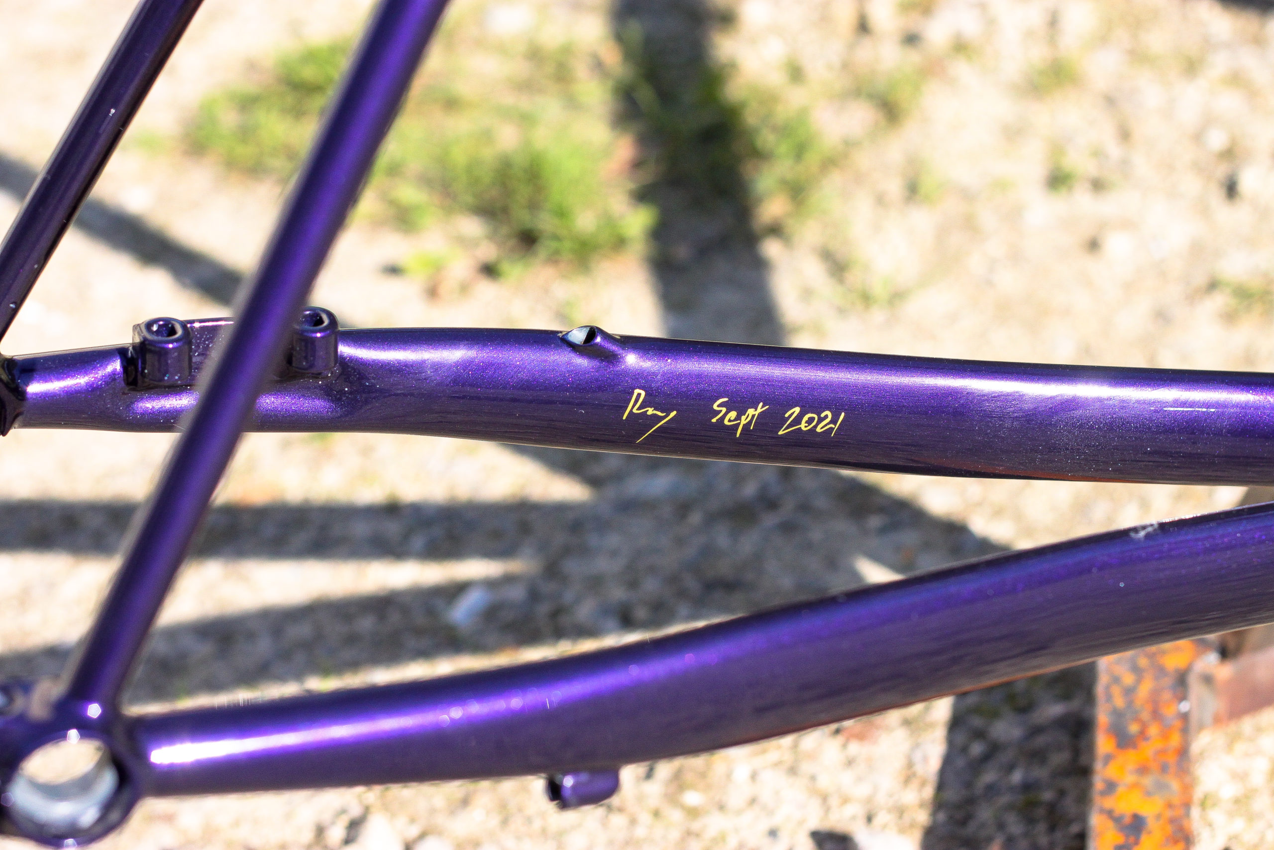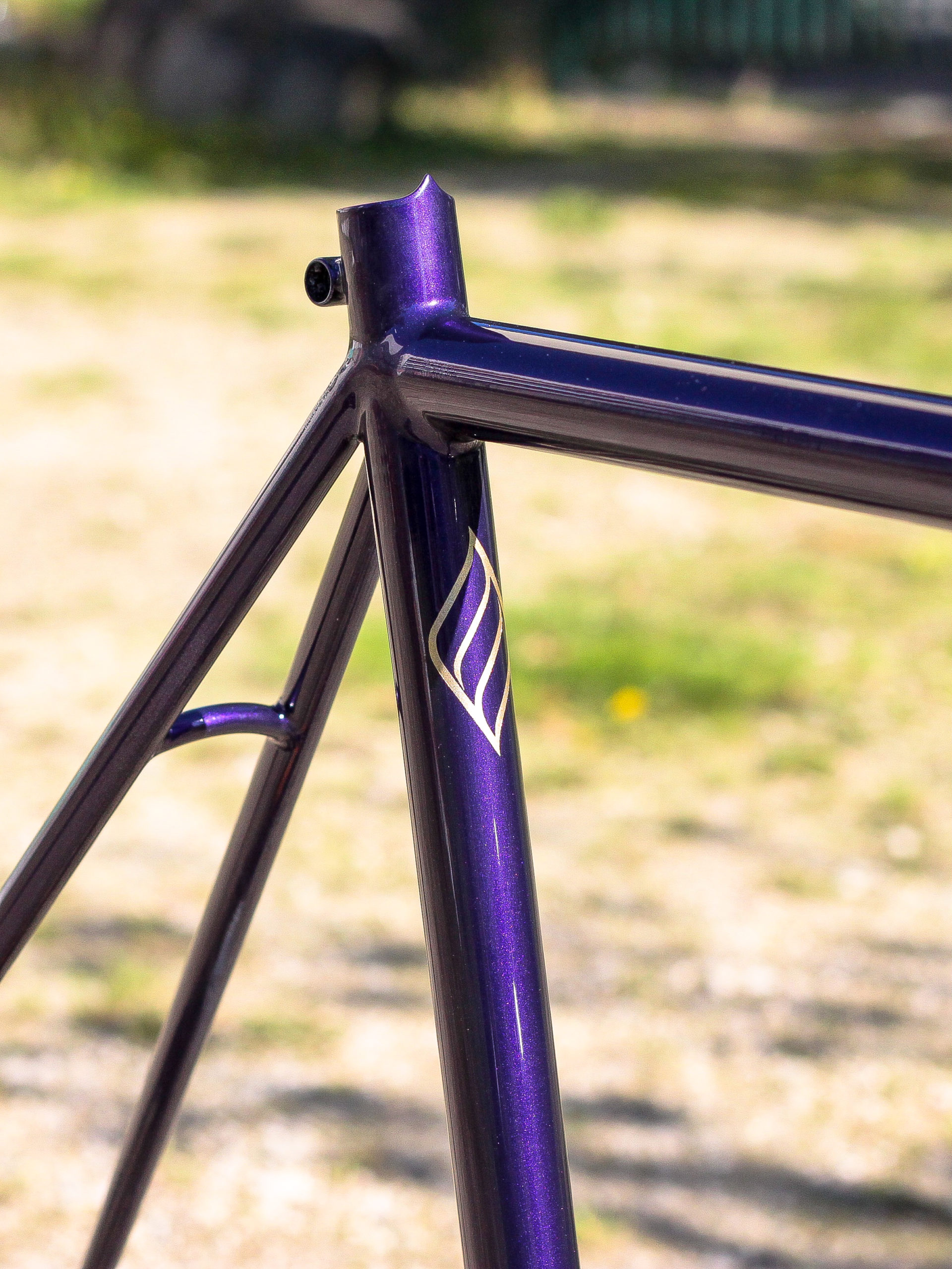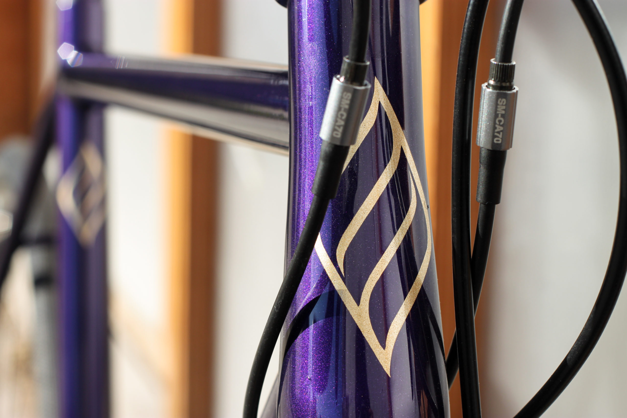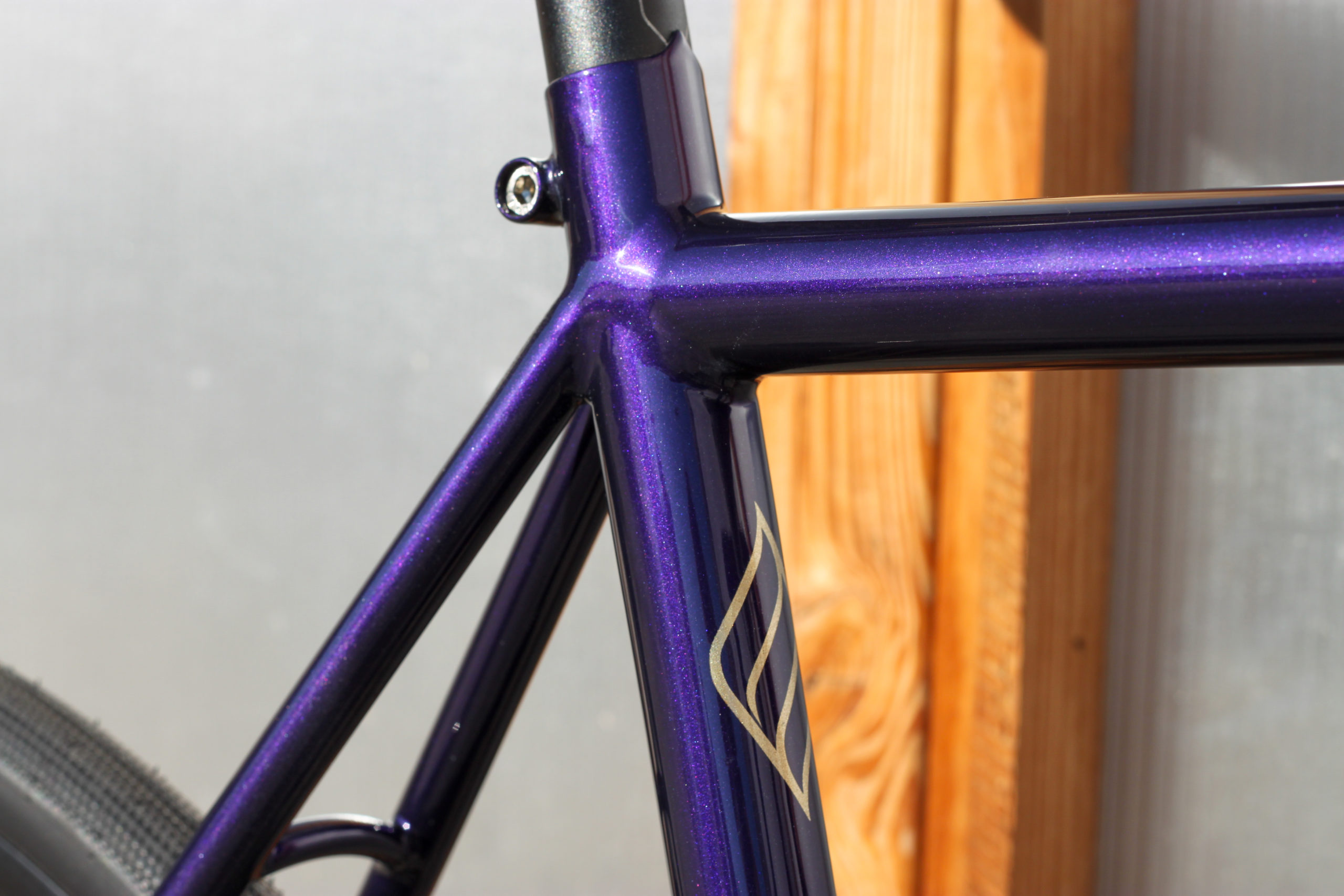 Le montage complet du vélo all-road et sur mesure de Nona, fabriqué avec des tubes Columbus Spirit. La peinture a été réalisée au Garage avec un Lamborghini Viola Aletheia, additionné d’un Lamorghini Oro Helios pour le logo et la typographie. Nous sommes très heureux du résultat !