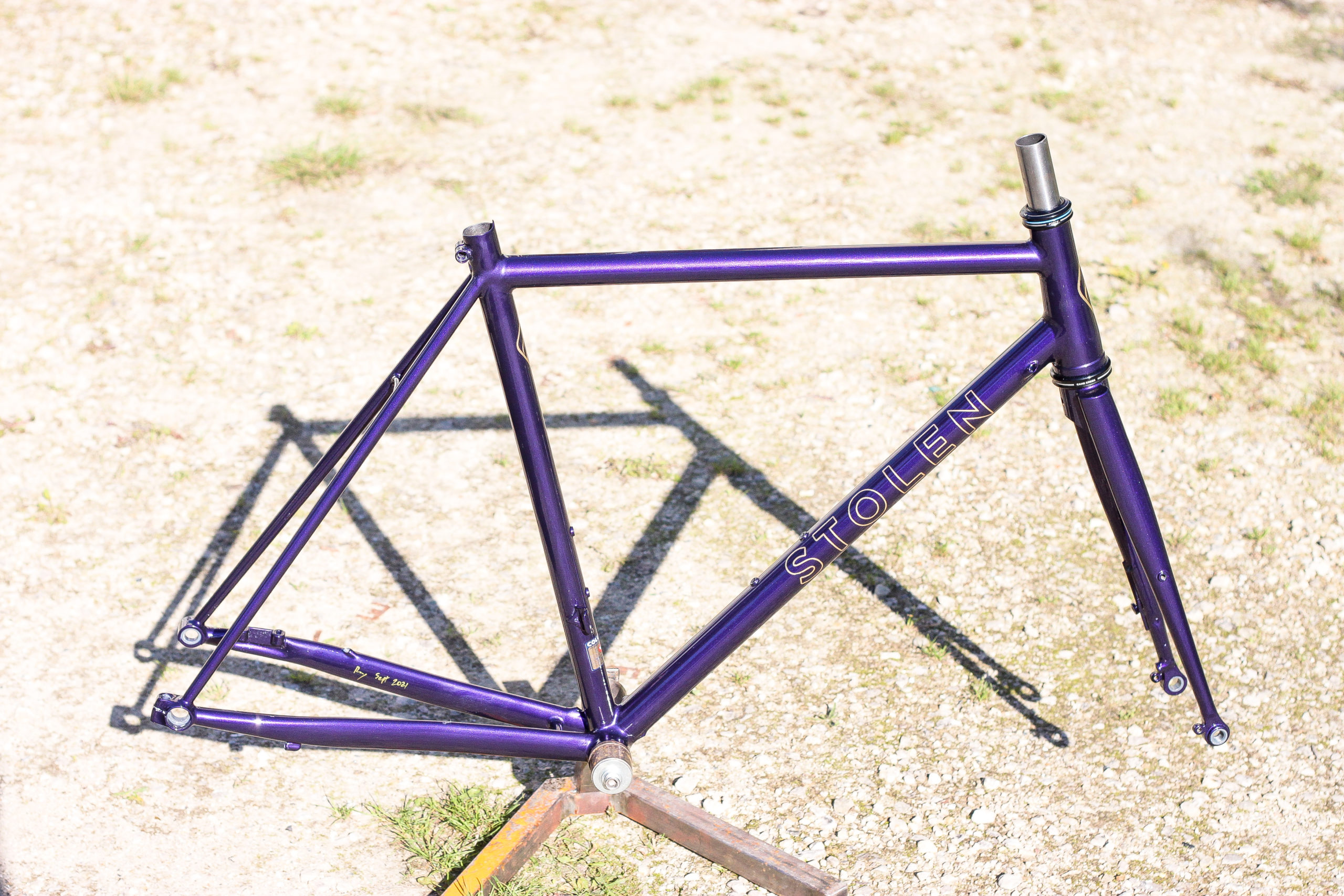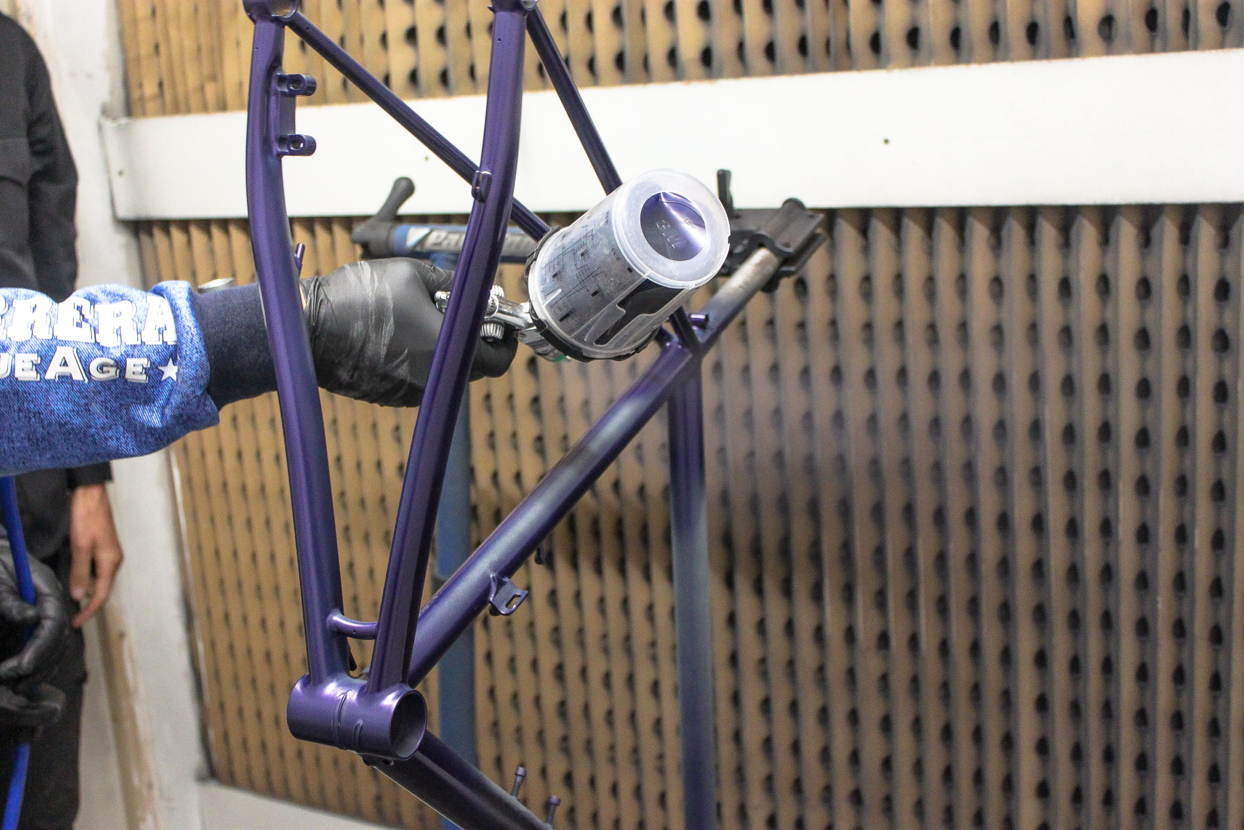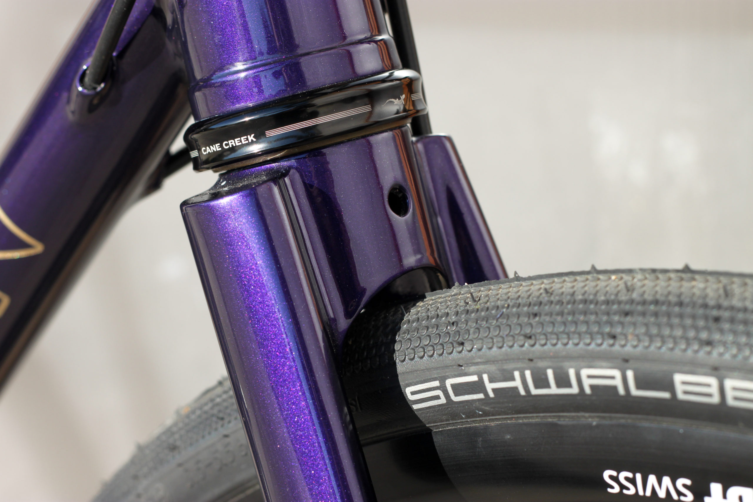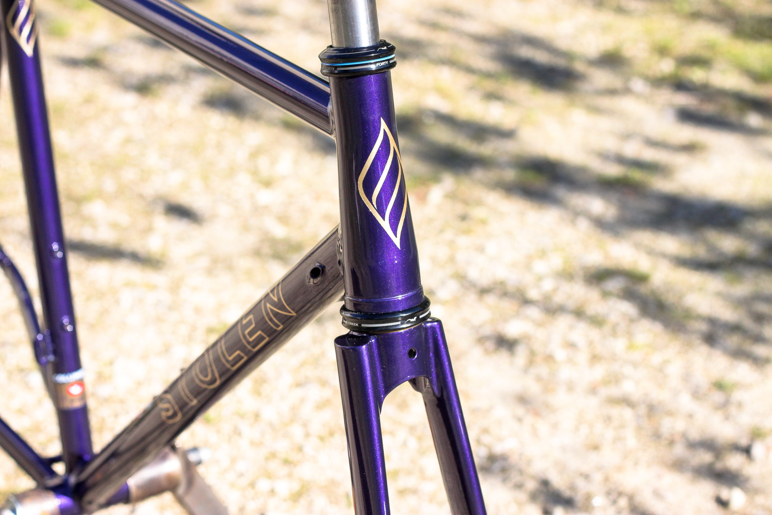 Le montage complet du vélo all-road et sur mesure de Nona, fabriqué avec des tubes Columbus Spirit. La peinture a été réalisée au Garage avec un Lamborghini Viola Aletheia, additionné d’un Lamorghini Oro Helios pour le logo et la typographie. Nous sommes très heureux du résultat !