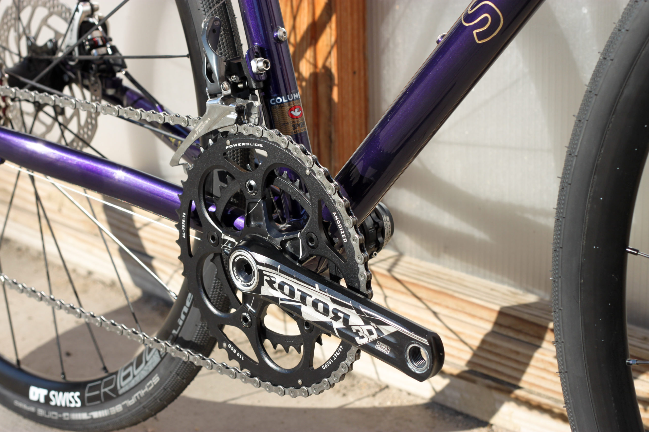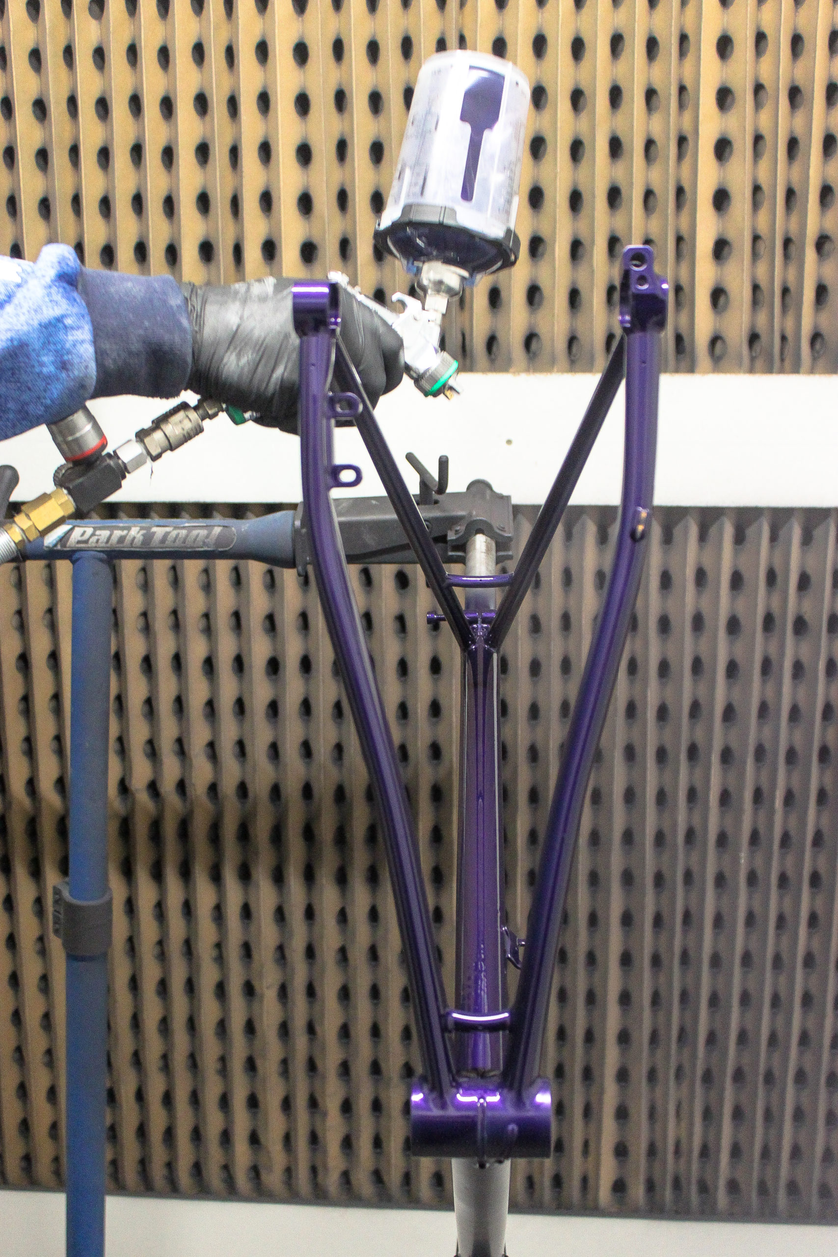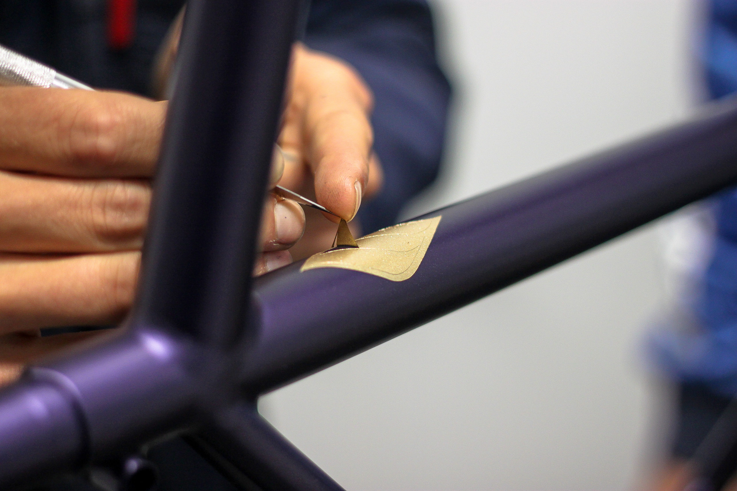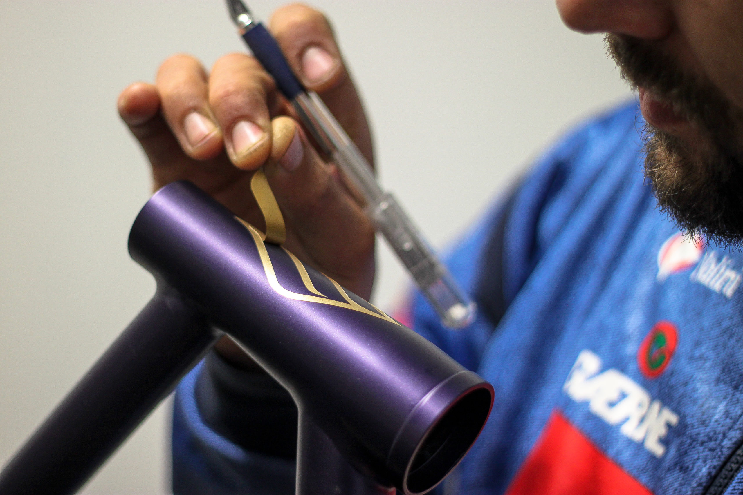 Le montage complet du vélo all-road et sur mesure de Nona, fabriqué avec des tubes Columbus Spirit. La peinture a été réalisée au Garage avec un Lamborghini Viola Aletheia, additionné d’un Lamorghini Oro Helios pour le logo et la typographie. Nous sommes très heureux du résultat !