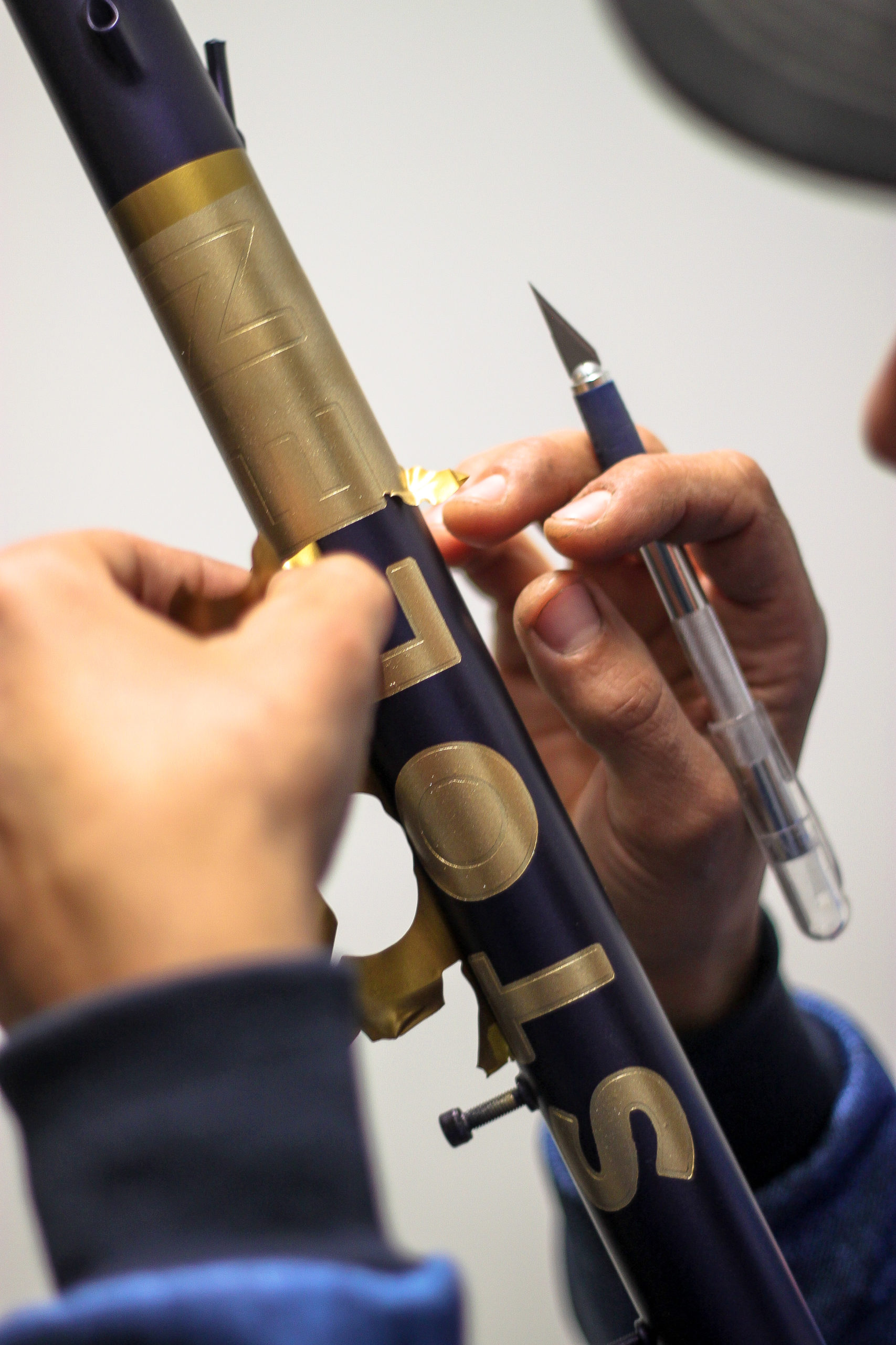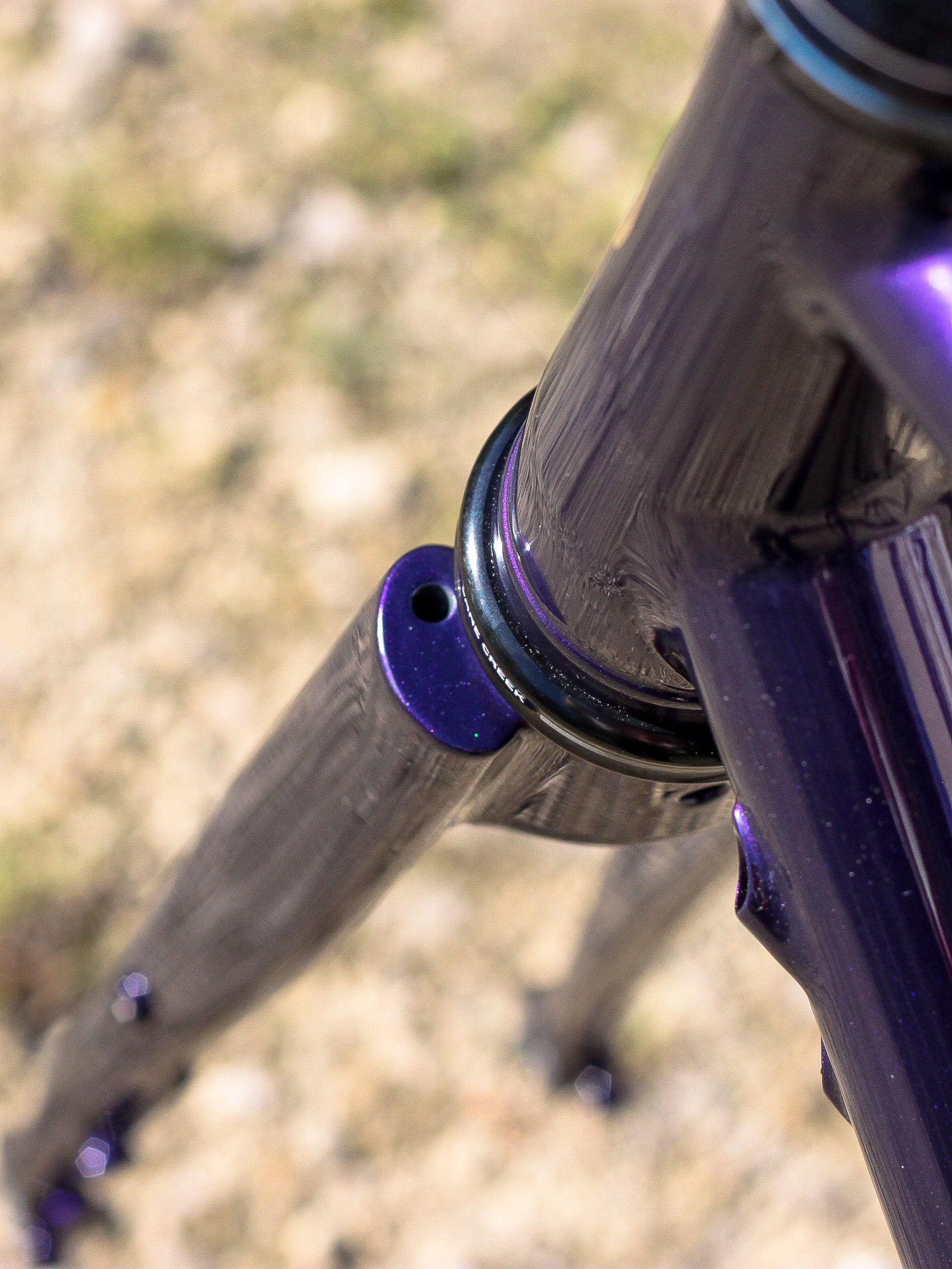 Vous pouvez notamment voir ici le travail de peinture sur la potence pour matcher avec le kit cadre, les passages internes fourche & tube diagonal, ainsi que le té de fourche aéro. Aussi la signature de Ronan, les soudures polies, la finition du tube de selle en rappel de notre logo, les axes traversant, le groupe Shimano Ultegra & pédalier Rotor 3D+