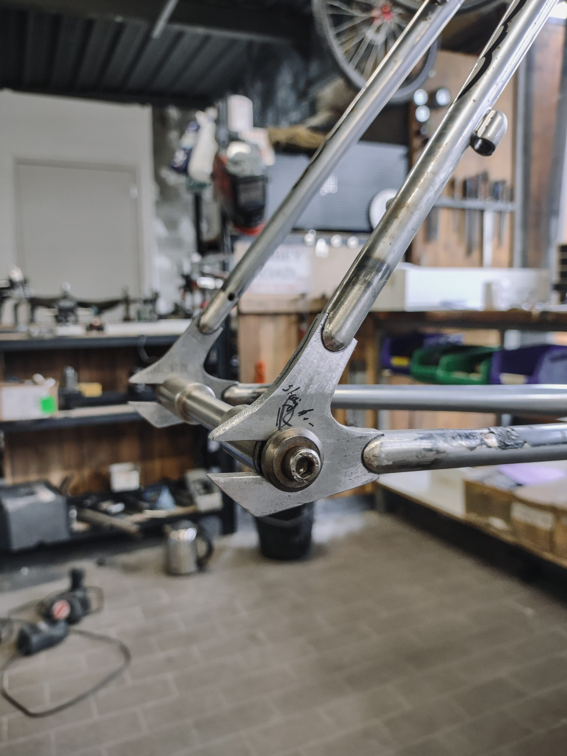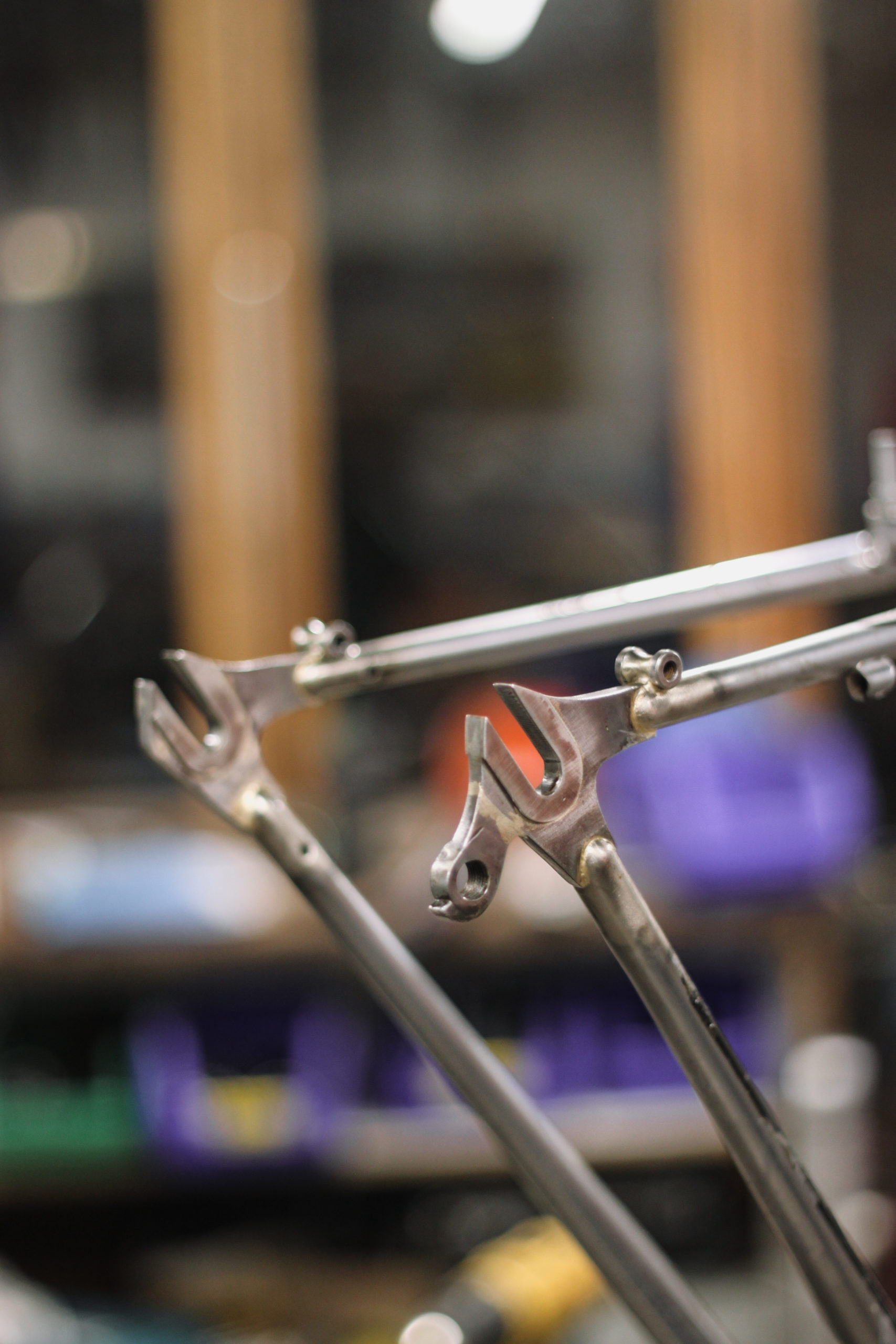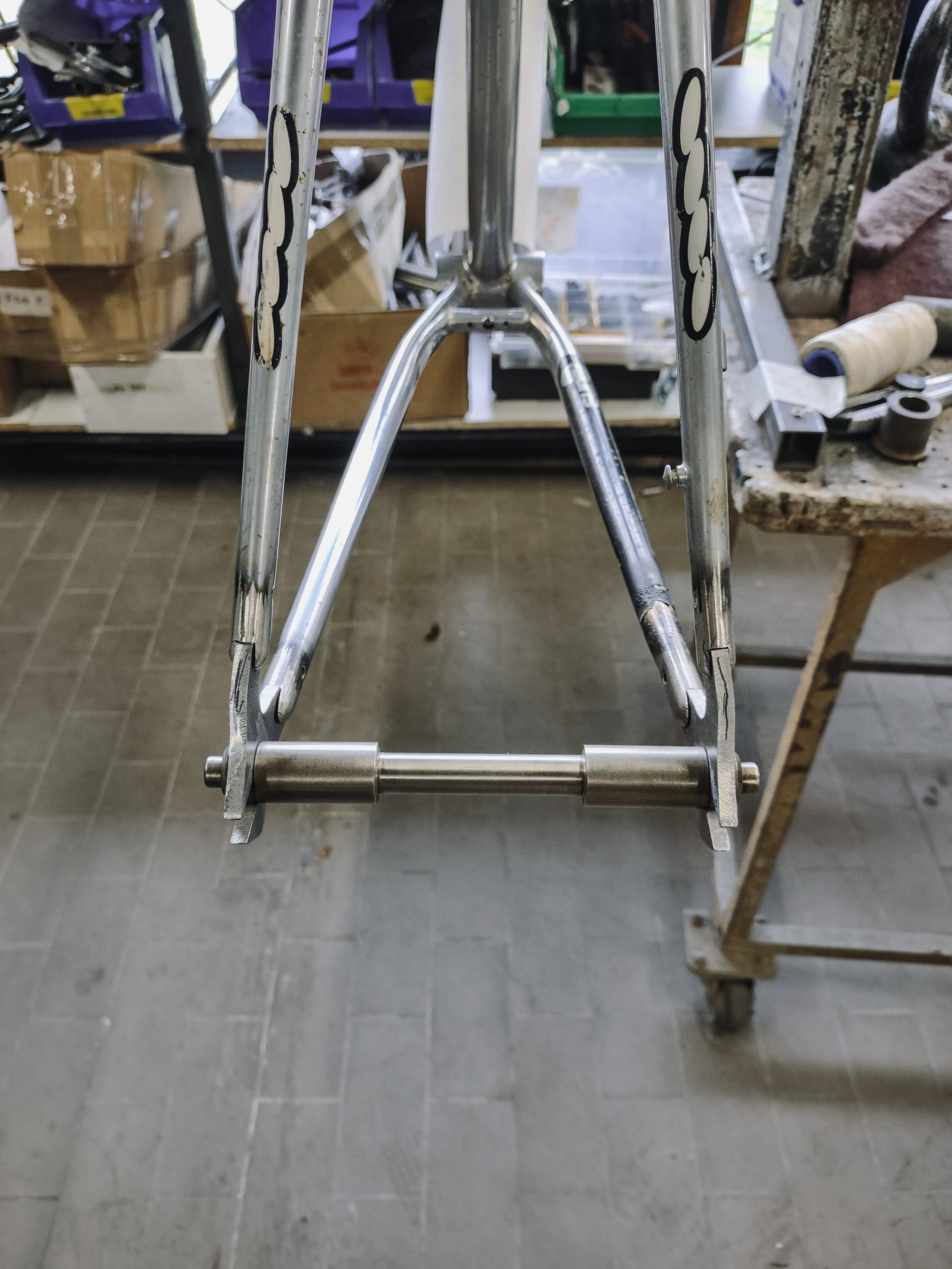 Nouveau job de transformation avec un changement de pattes pour ce VTT rétro Sunn. Après avoir découpé les anciennes pattes, nous avons dessiné et fabriqué de nouvelles pattes type piste sur mesure. Ces dernières ont été renforcées par des lames inox. Enfin, une patte de dérailleur et des œillets pour gardes-boue ont été soudés.