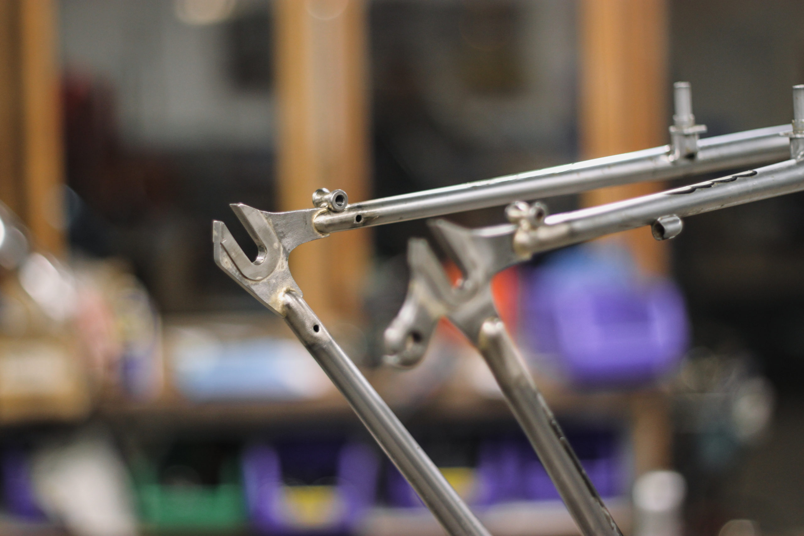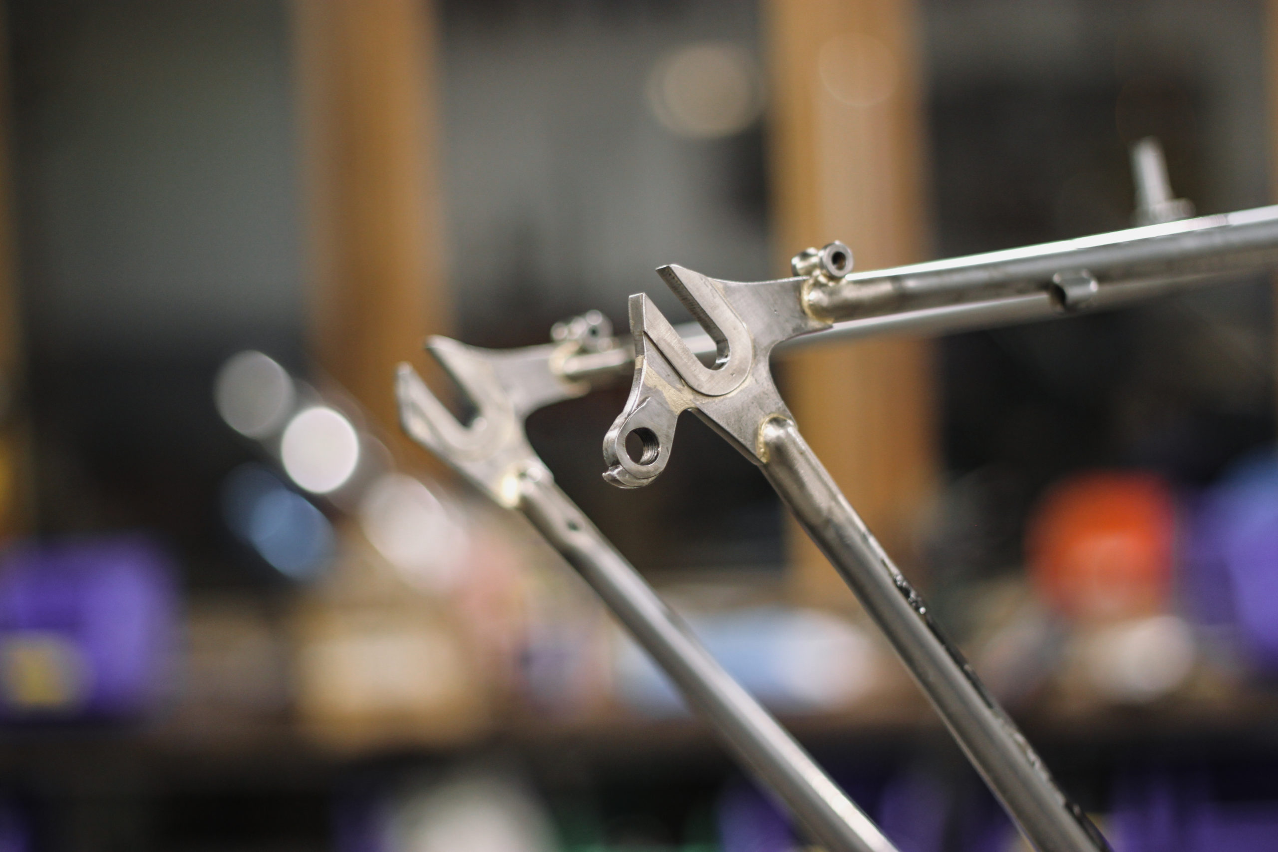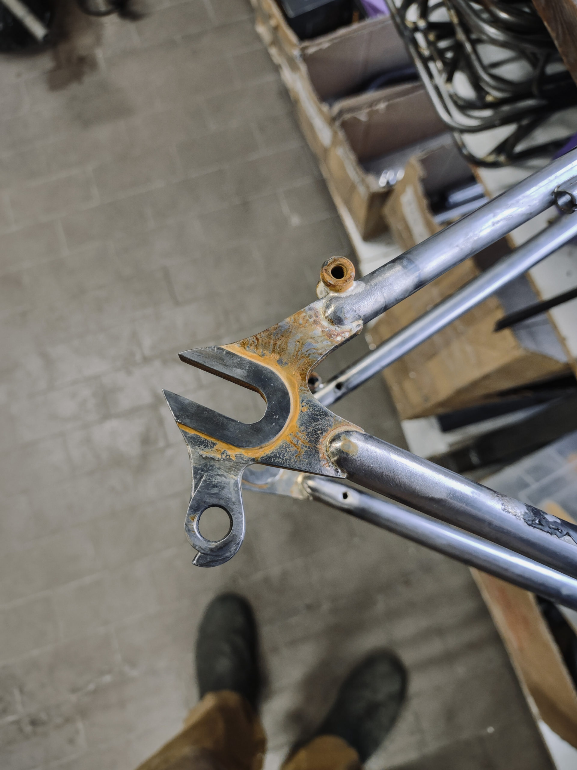 Nouveau job de transformation avec un changement de pattes pour ce VTT rétro Sunn. Après avoir découpé les anciennes pattes, nous avons dessiné et fabriqué de nouvelles pattes type piste sur mesure. Ces dernières ont été renforcées par des lames inox. Enfin, une patte de dérailleur et des œillets pour gardes-boue ont été soudés.