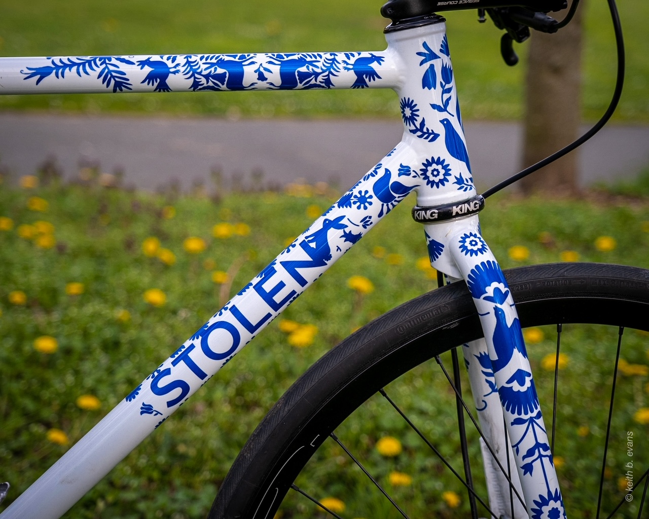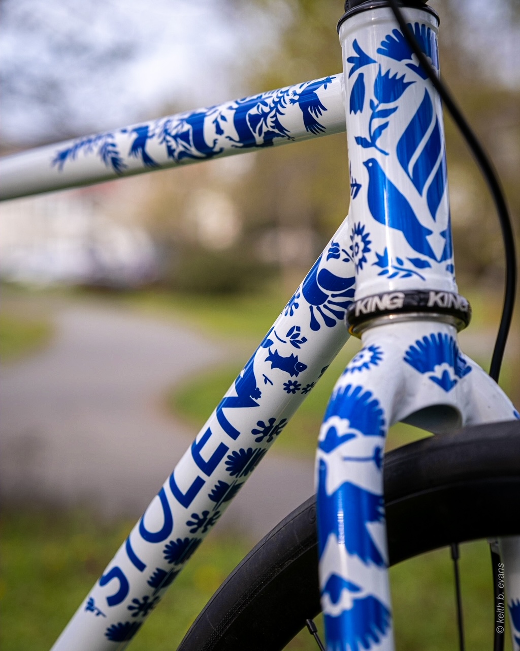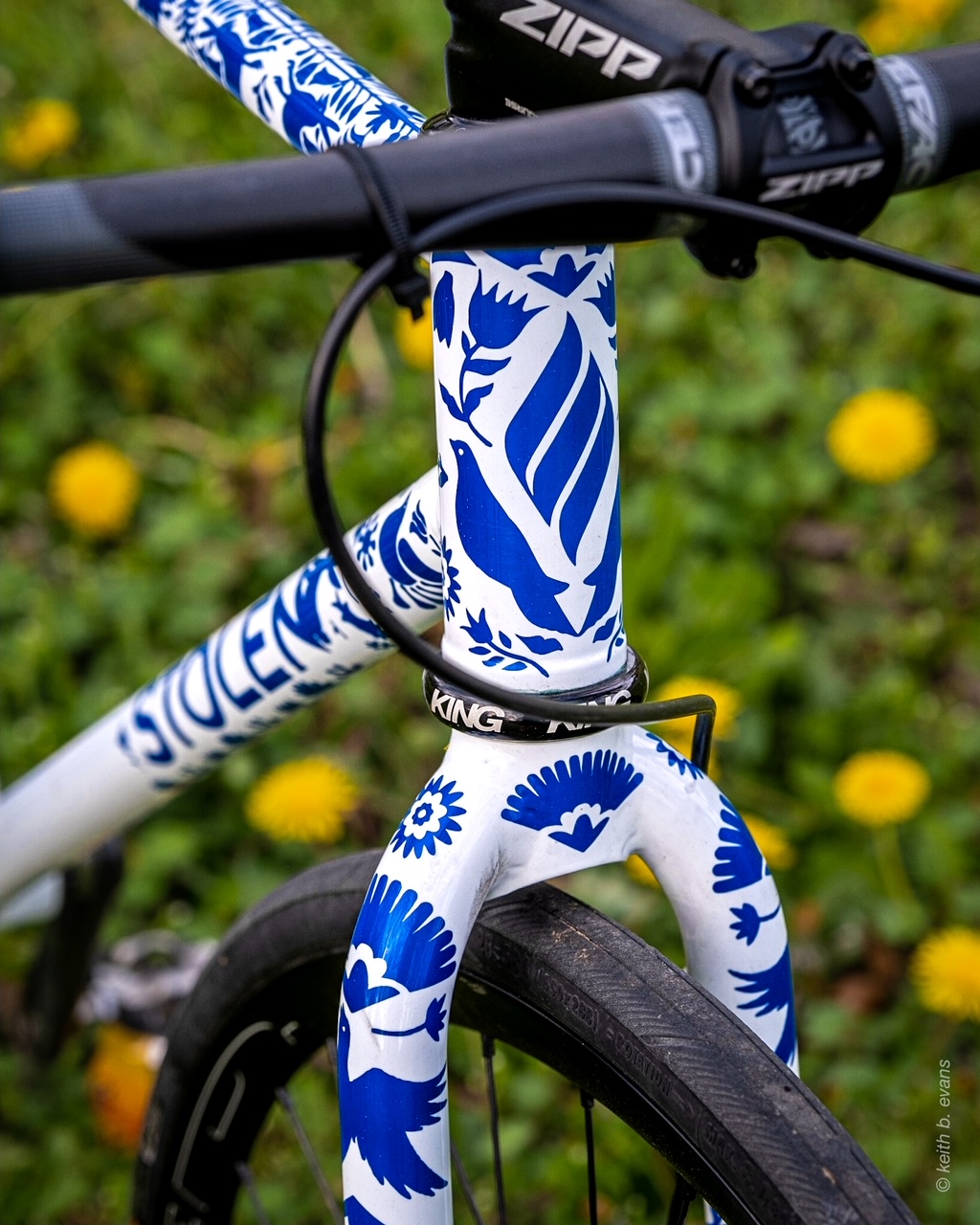 Custom paintjob of a Dev’s Stolen 27.5″ bike polo frameset, in Columbus Zona. This paint job required a real attention to detail thanks to the elaborate masks and is inspired by the indigenous type of embroidery called “Otomí”. These embroideries are from the mountains of Hidalgo in Mexico, where Devora got her indigenous identity