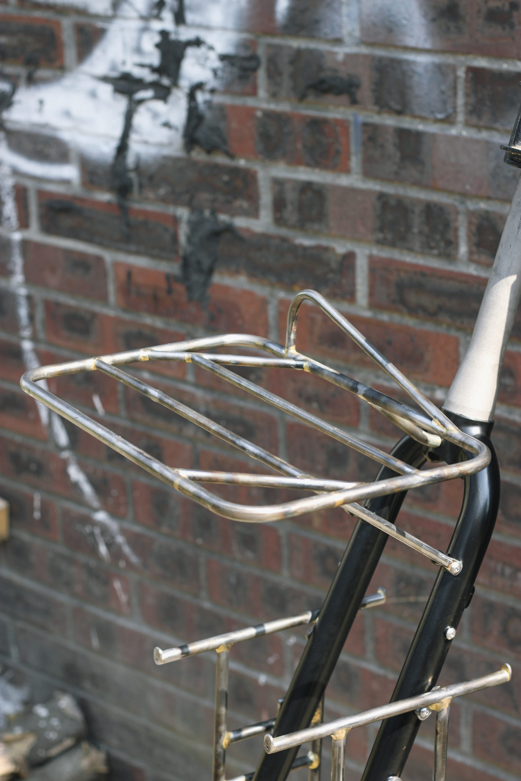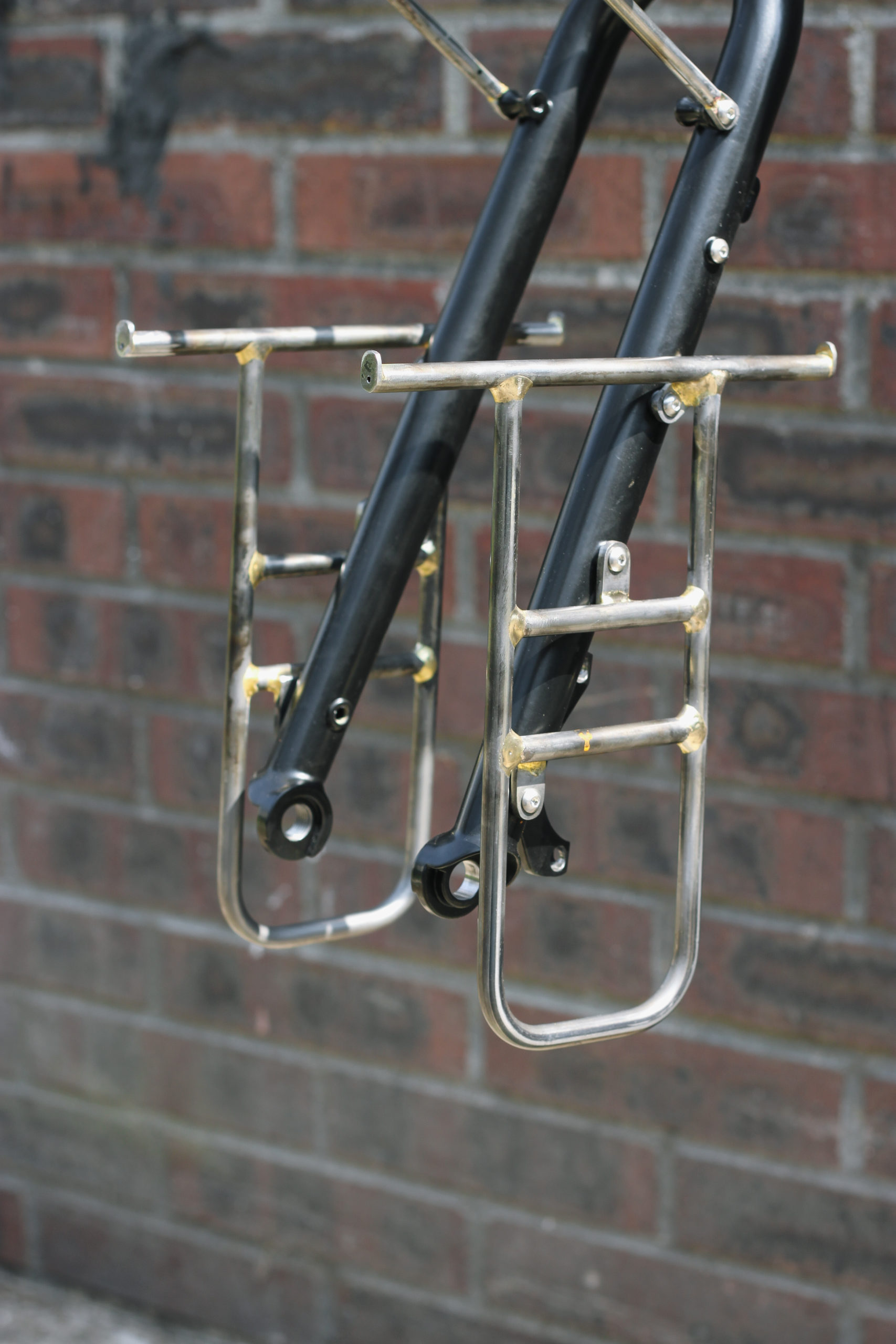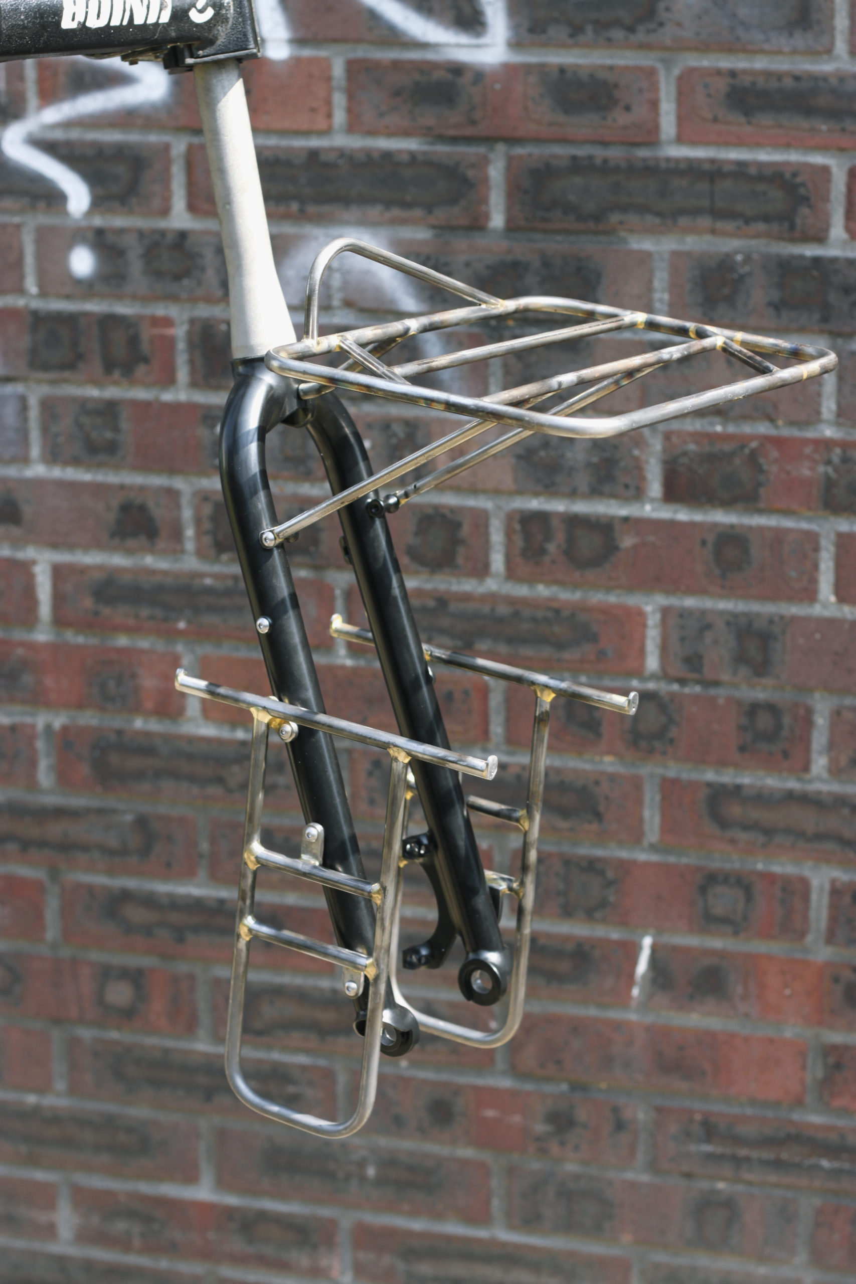 Fully custom front rackset for Maxime’s Stolen adventure fork. Modular low-rider supports for full size pannier bags in combination with a medium size flat top rack. By keeping the fixations separate between the low-rider supports and the rack Maxime has the option to change his setup according to his needs without losing rigidity due to the low-rider triple fixation system.