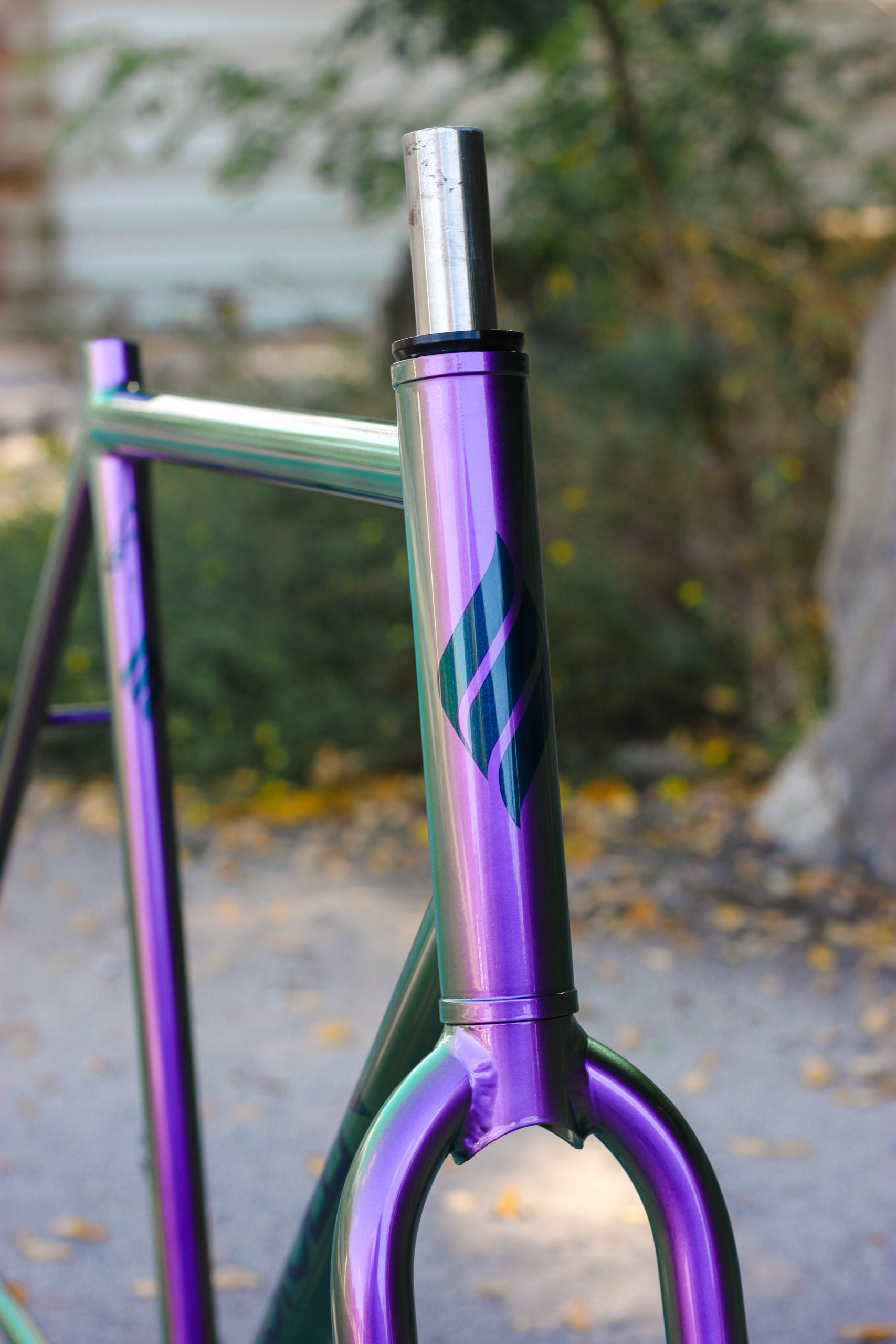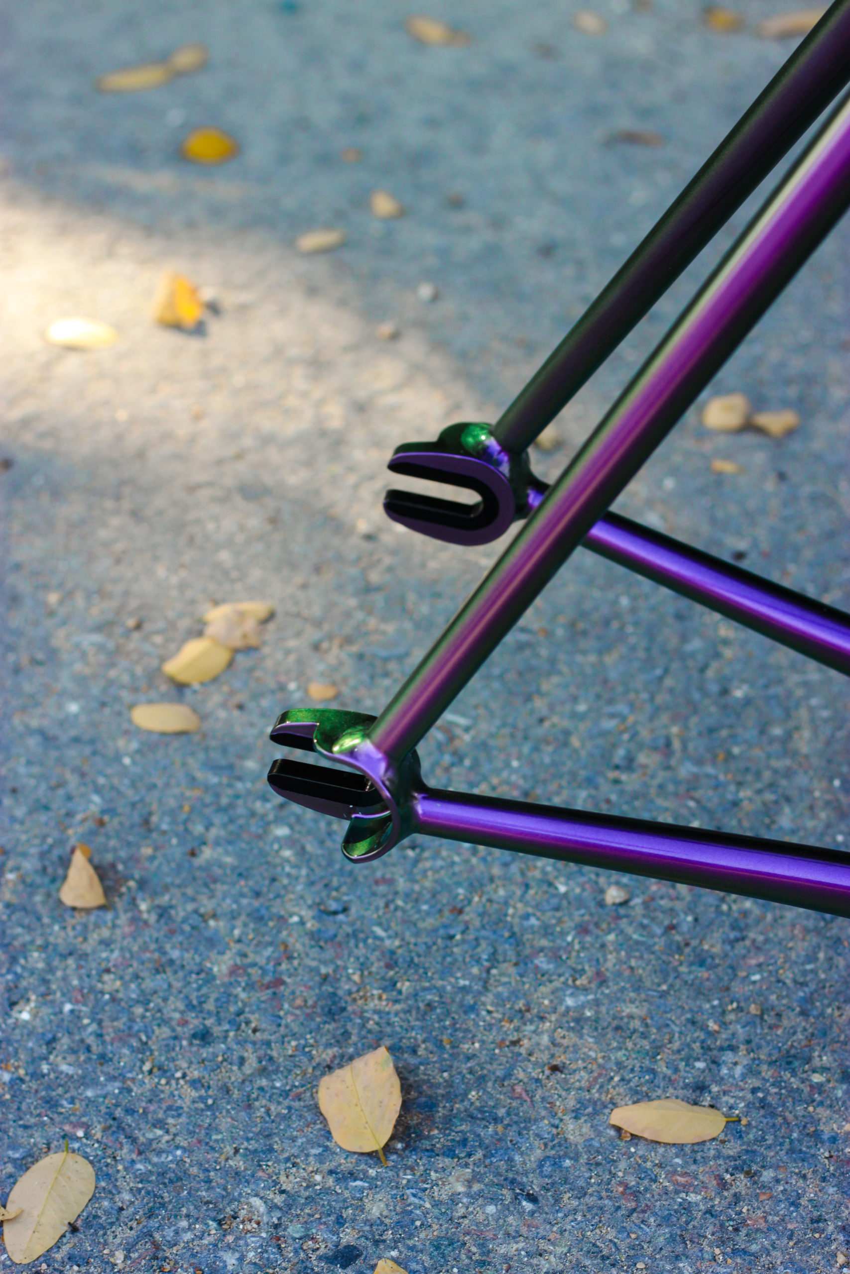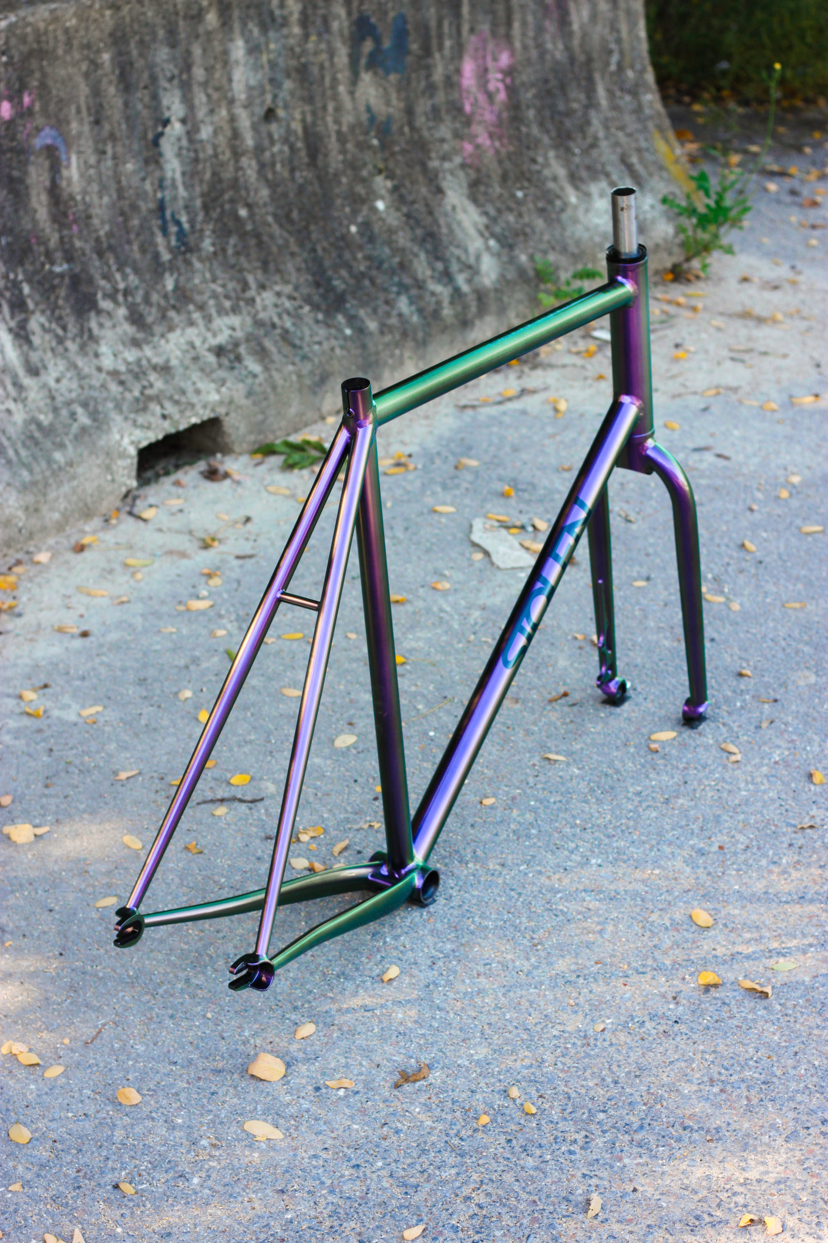 Kit cadre Bike Polo custom 700c de Lina, prêt à partir arpenter les terrains suédois!Superbe peinture caméléon vert/violet, avec des marquages custom en vert canard. Fabrication & paint job 100% home/handmade