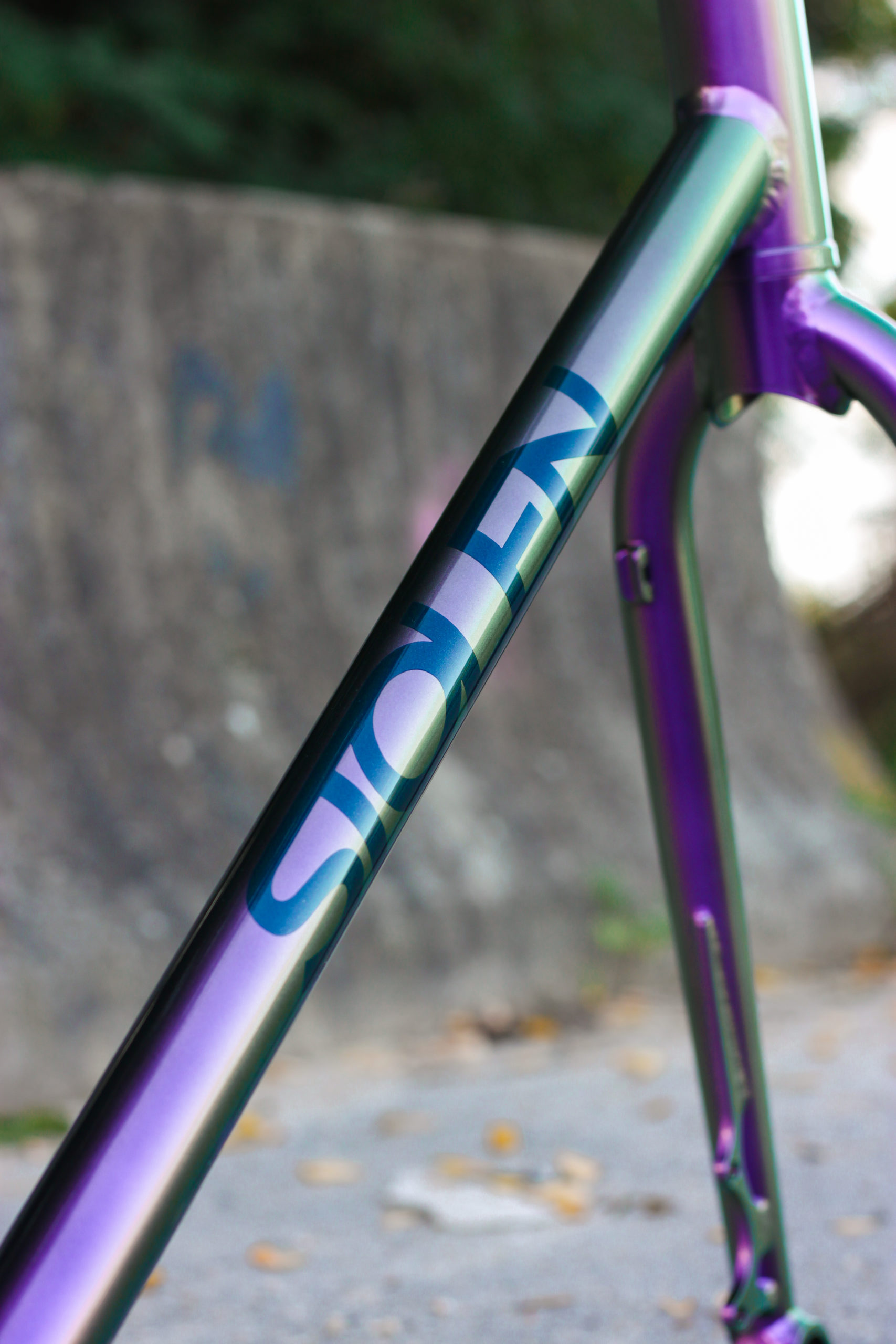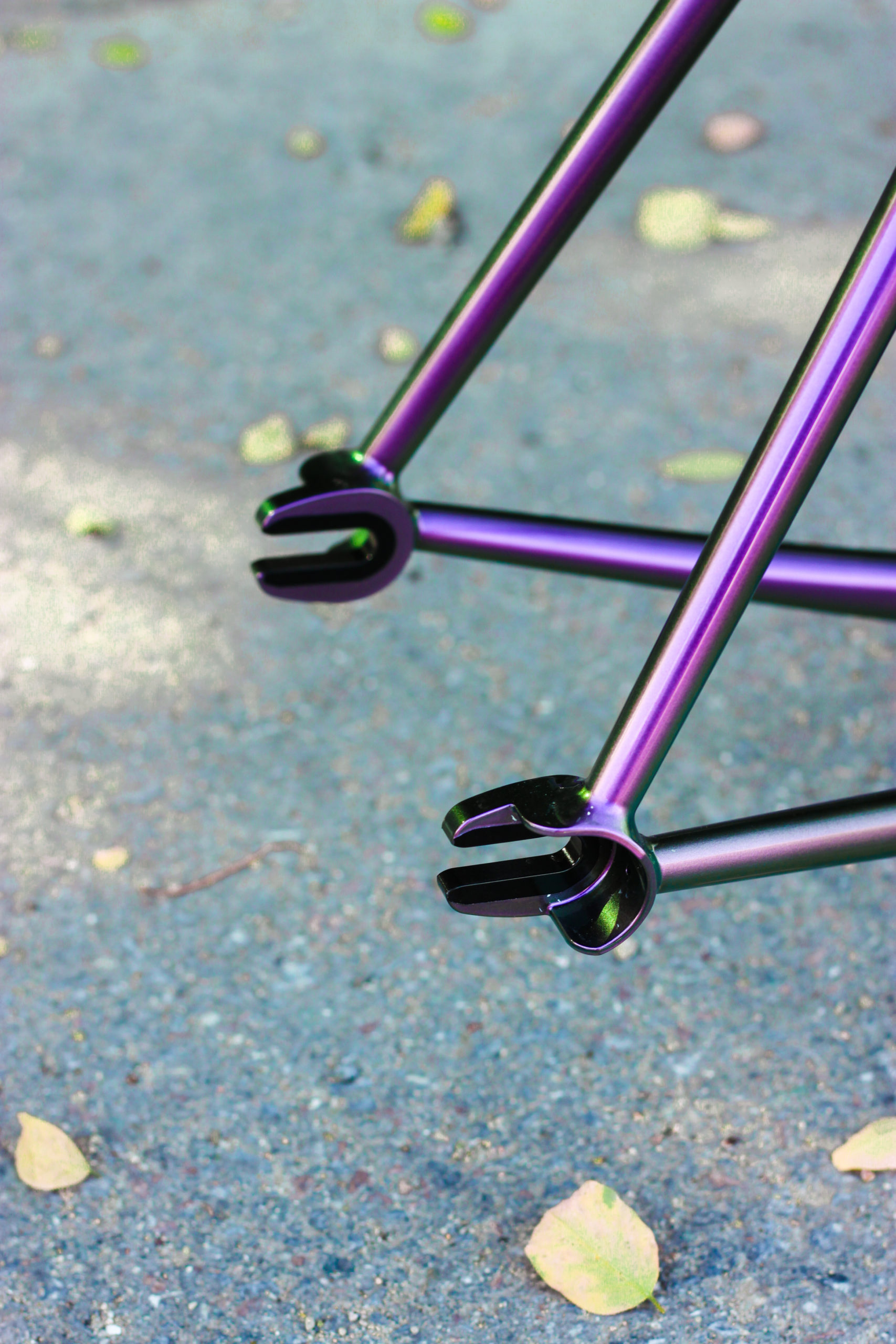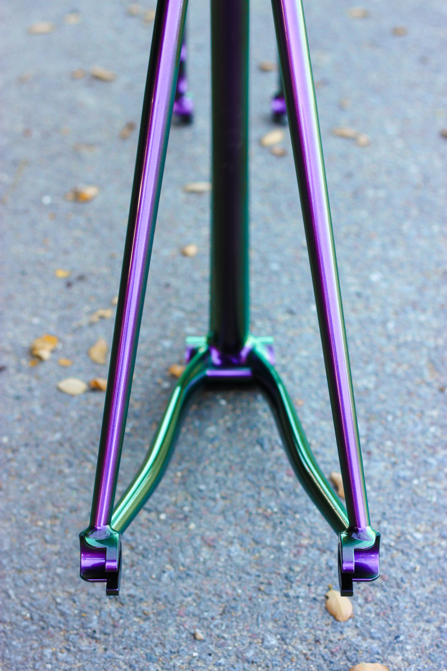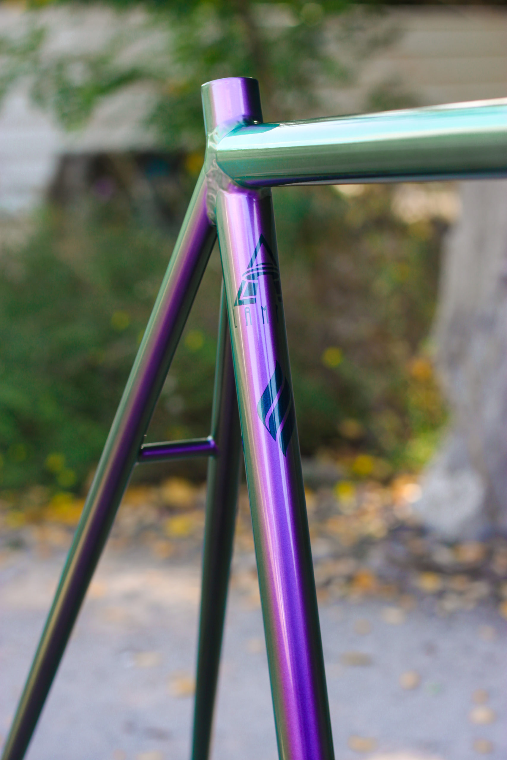 Kit cadre Bike Polo custom 700c de Lina, prêt à partir arpenter les terrains suédois!Superbe peinture caméléon vert/violet, avec des marquages custom en vert canard. Fabrication & paint job 100% home/handmade