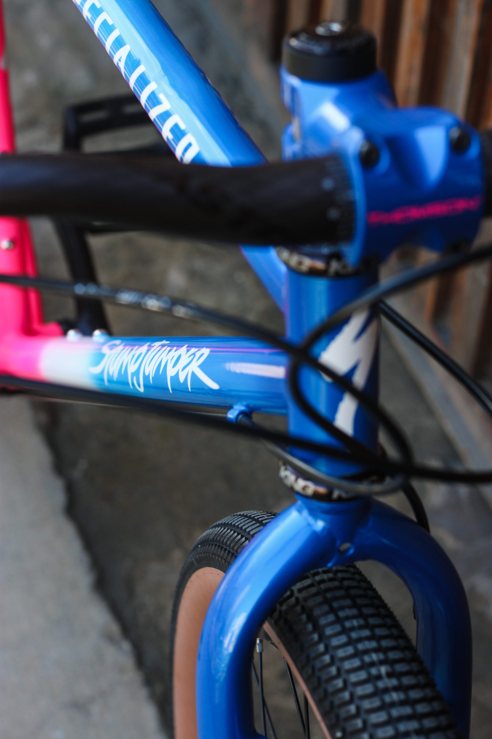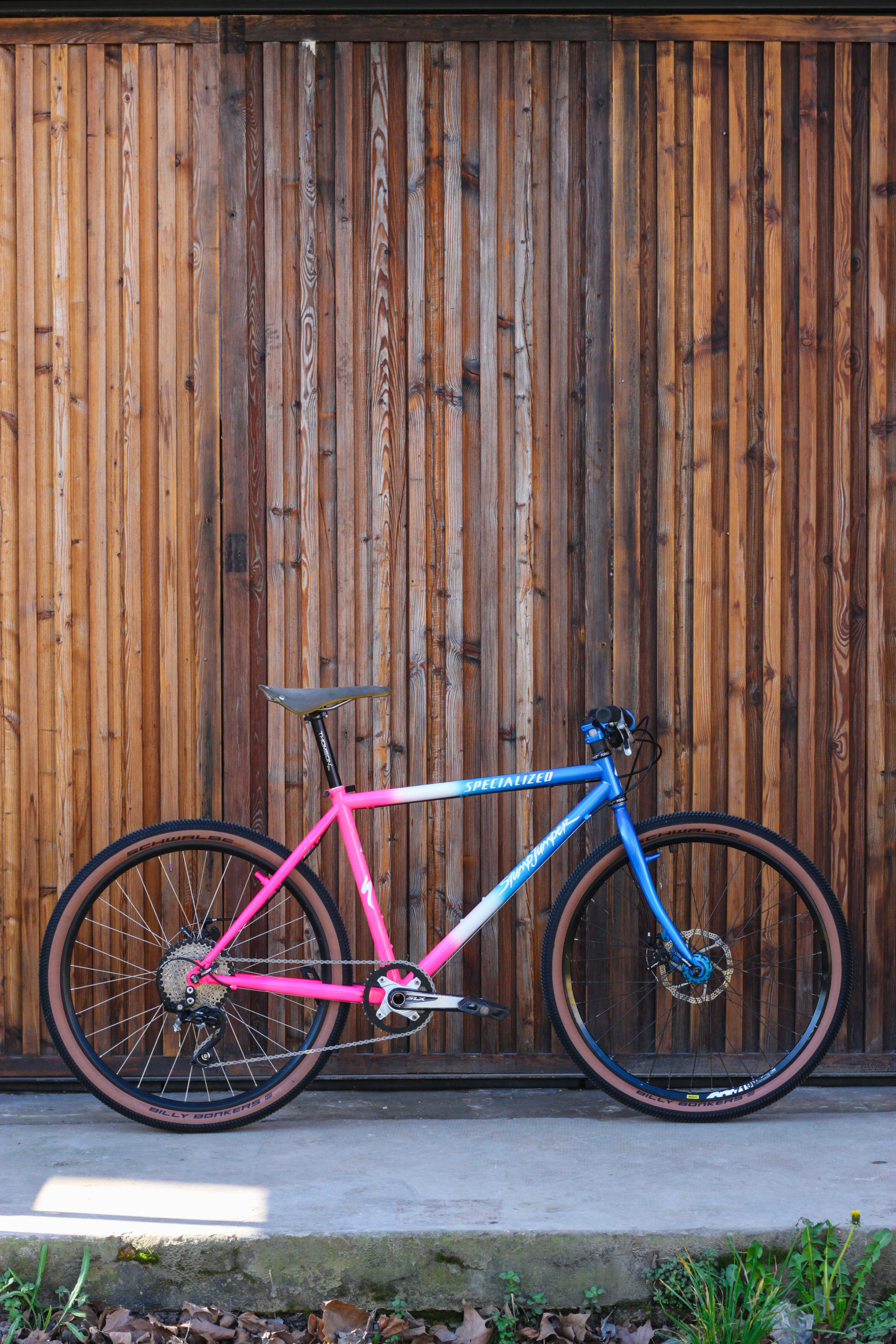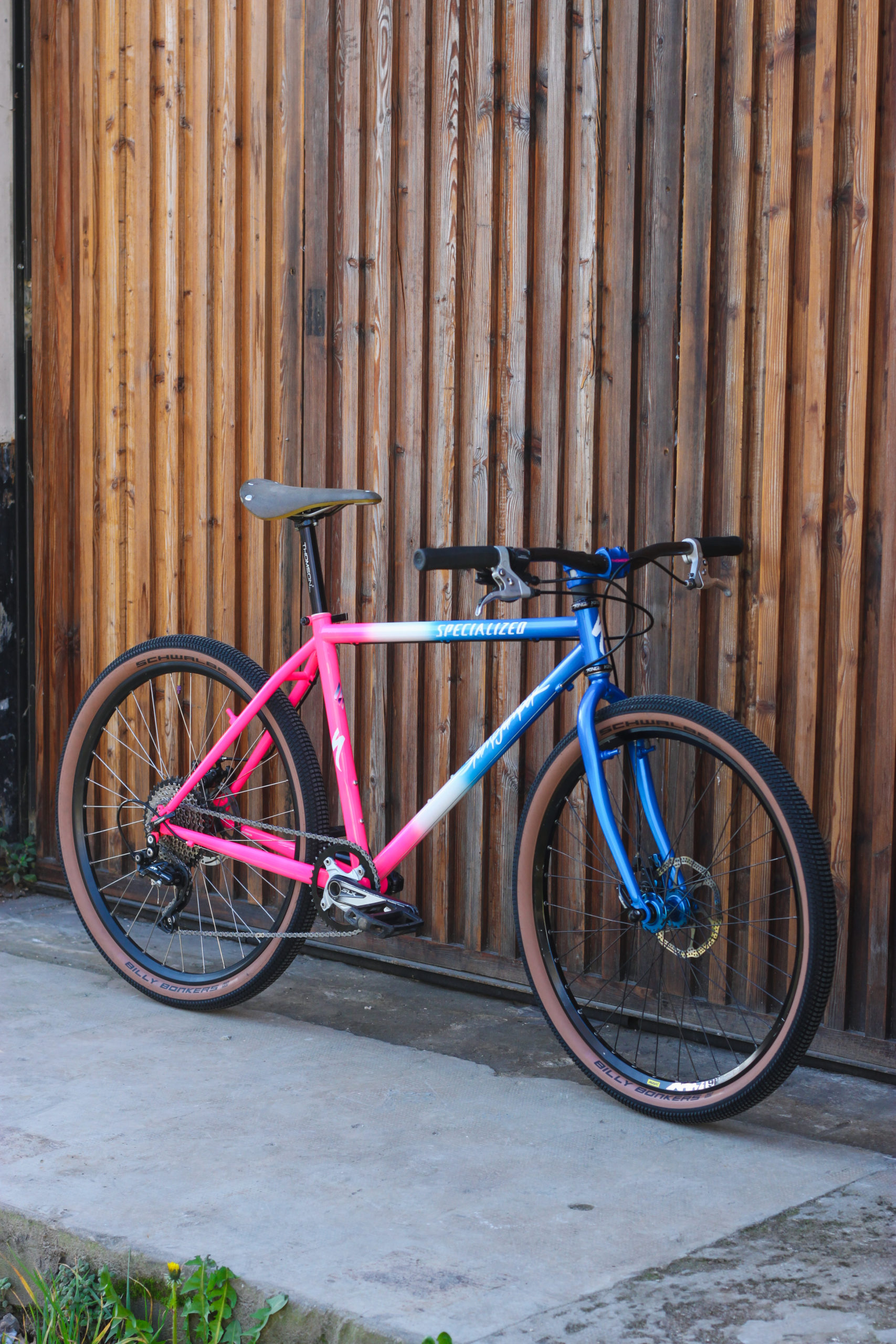 Nouvelle vie pour le 1996 Stumpjumper Specialized de Luca ! Après sablage, il a lui-même soudé des fixations disques sur la fourche et les haubans. Le pivot de fourche a été allongé et transformé a-head afin d’installer une potence moderne.