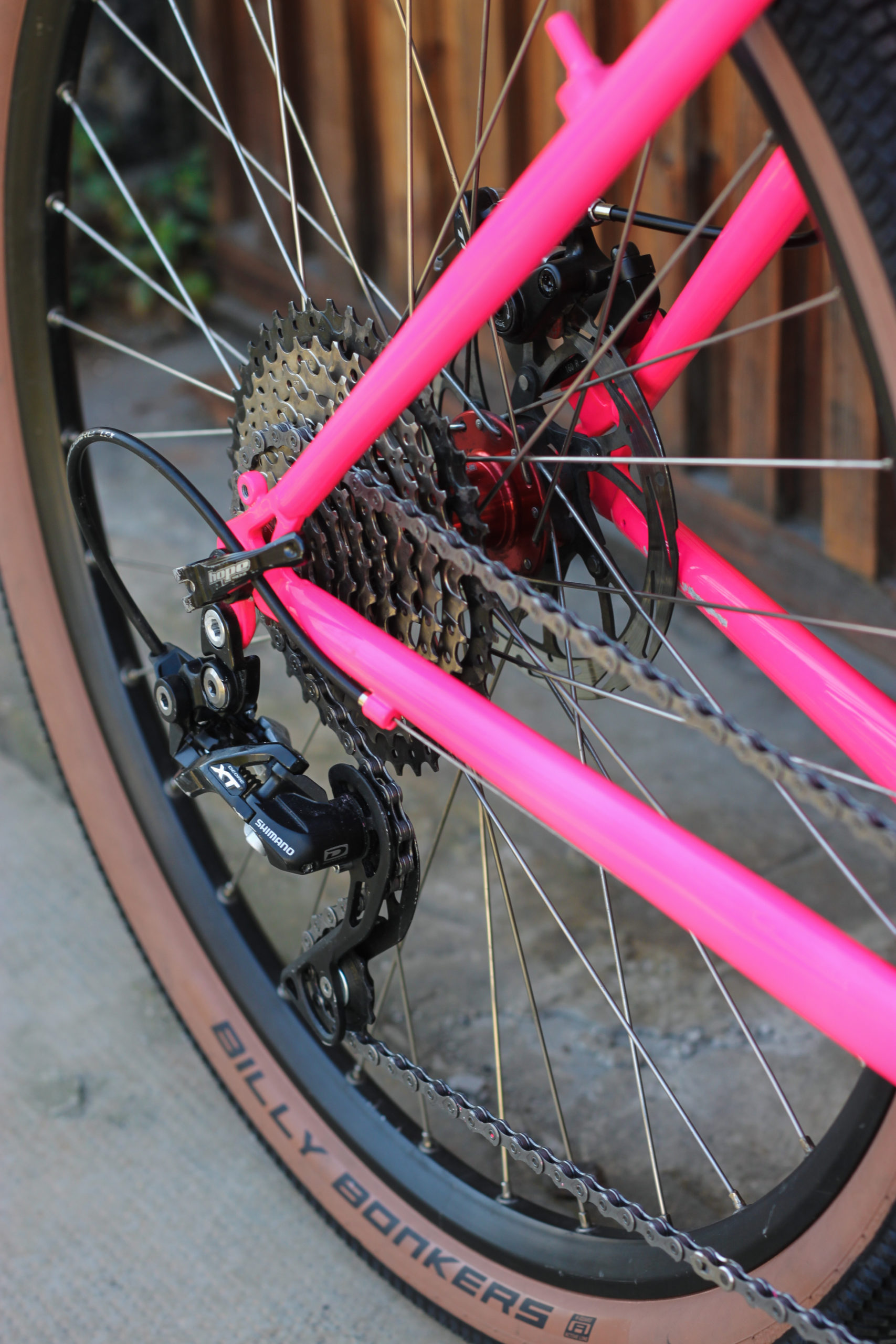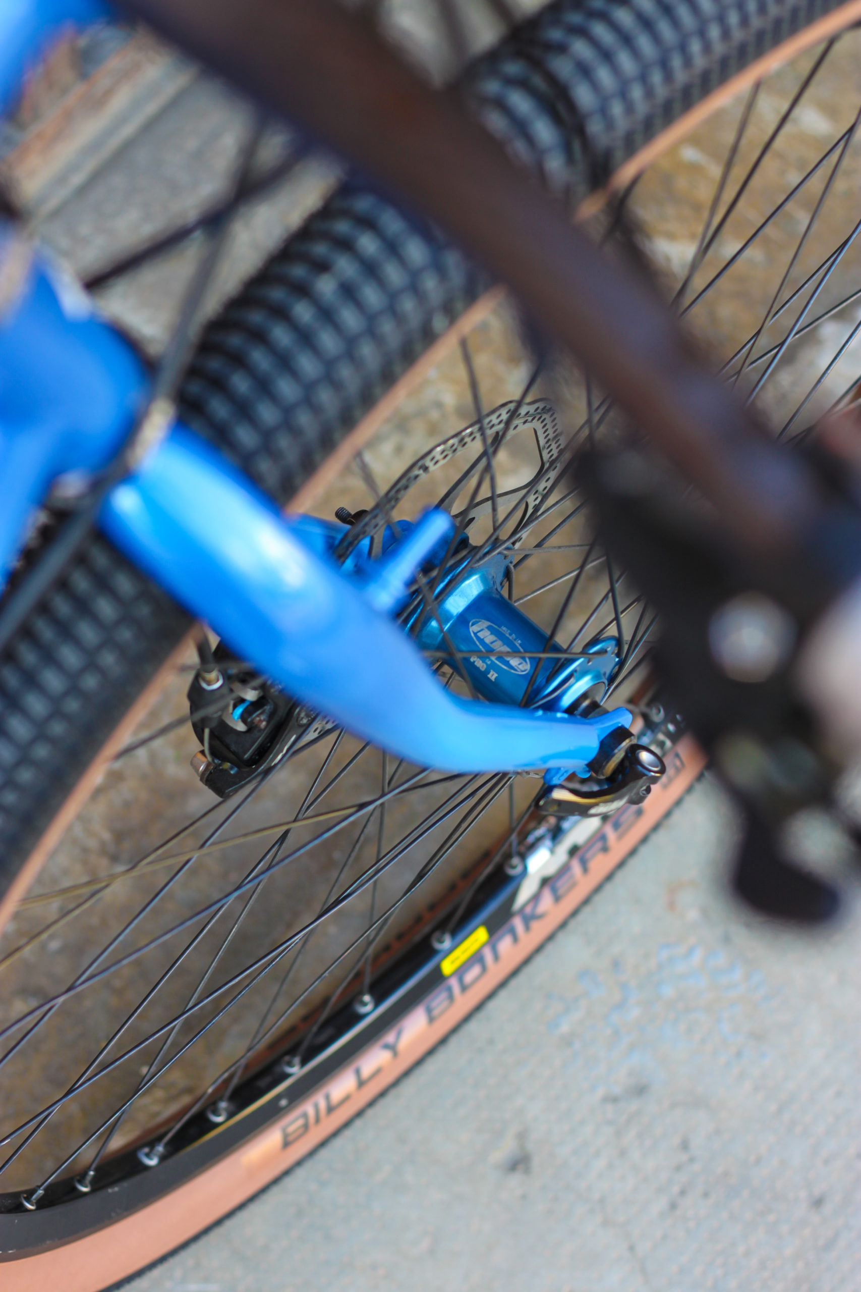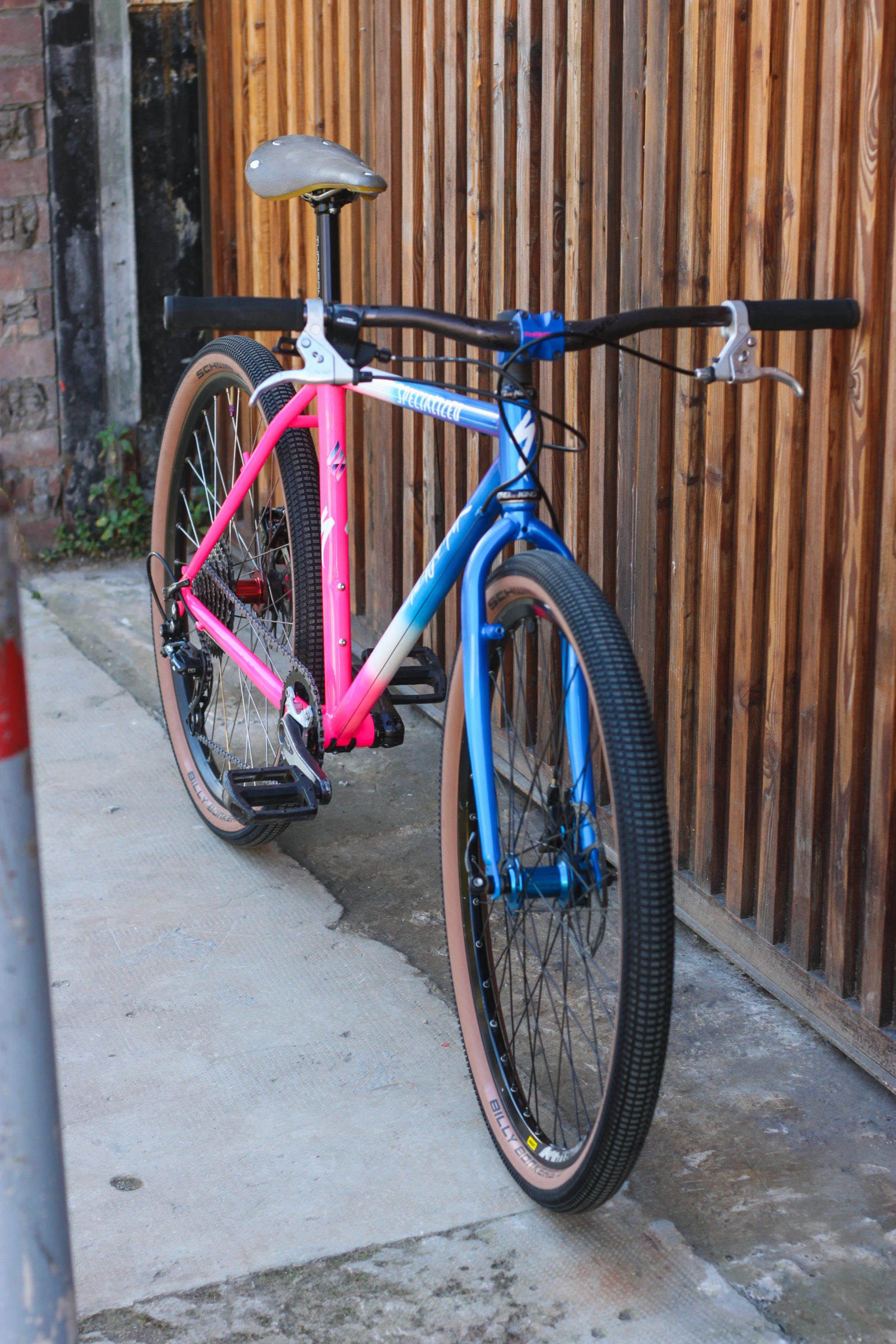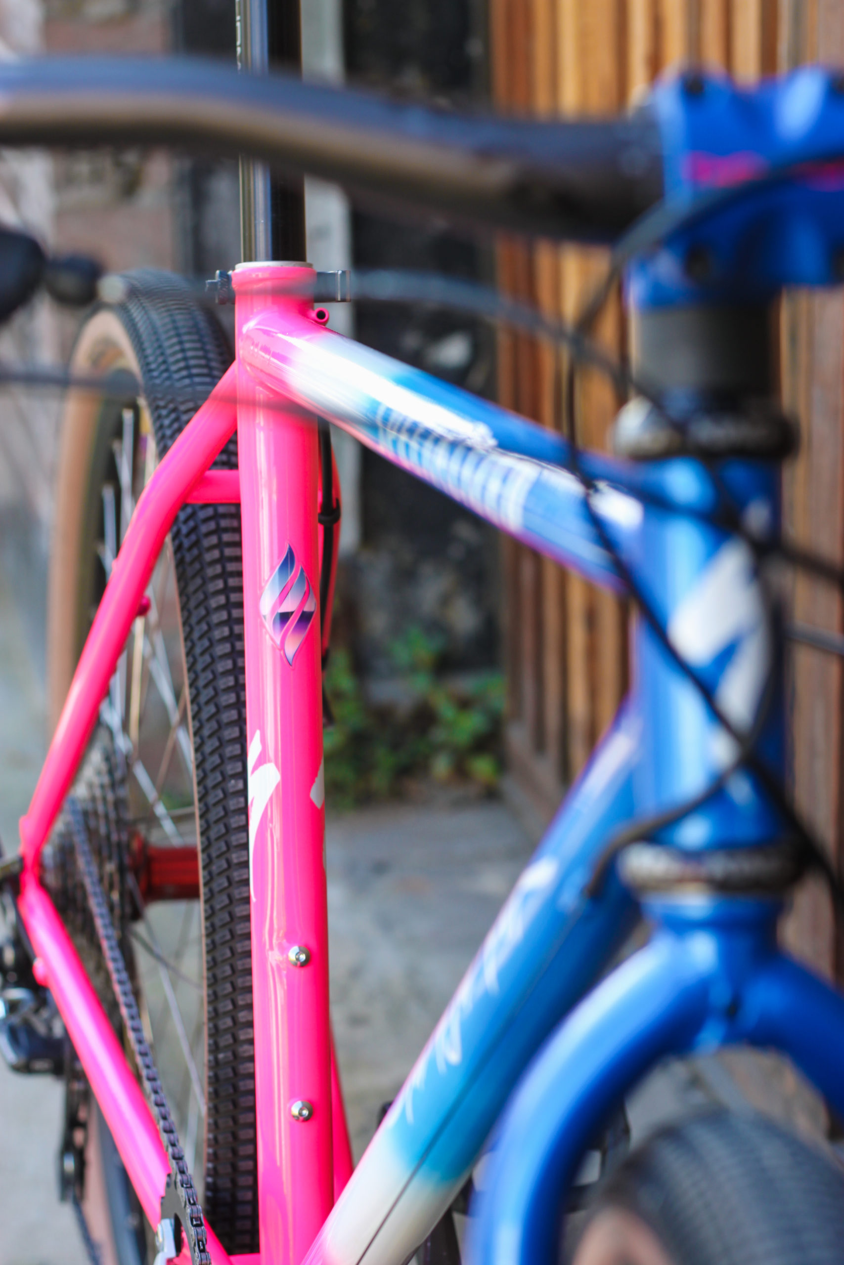 Nouvelle vie pour le 1996 Stumpjumper Specialized de Luca ! Après sablage, il a lui-même soudé des fixations disques sur la fourche et les haubans. Le pivot de fourche a été allongé et transformé a-head afin d’installer une potence moderne.