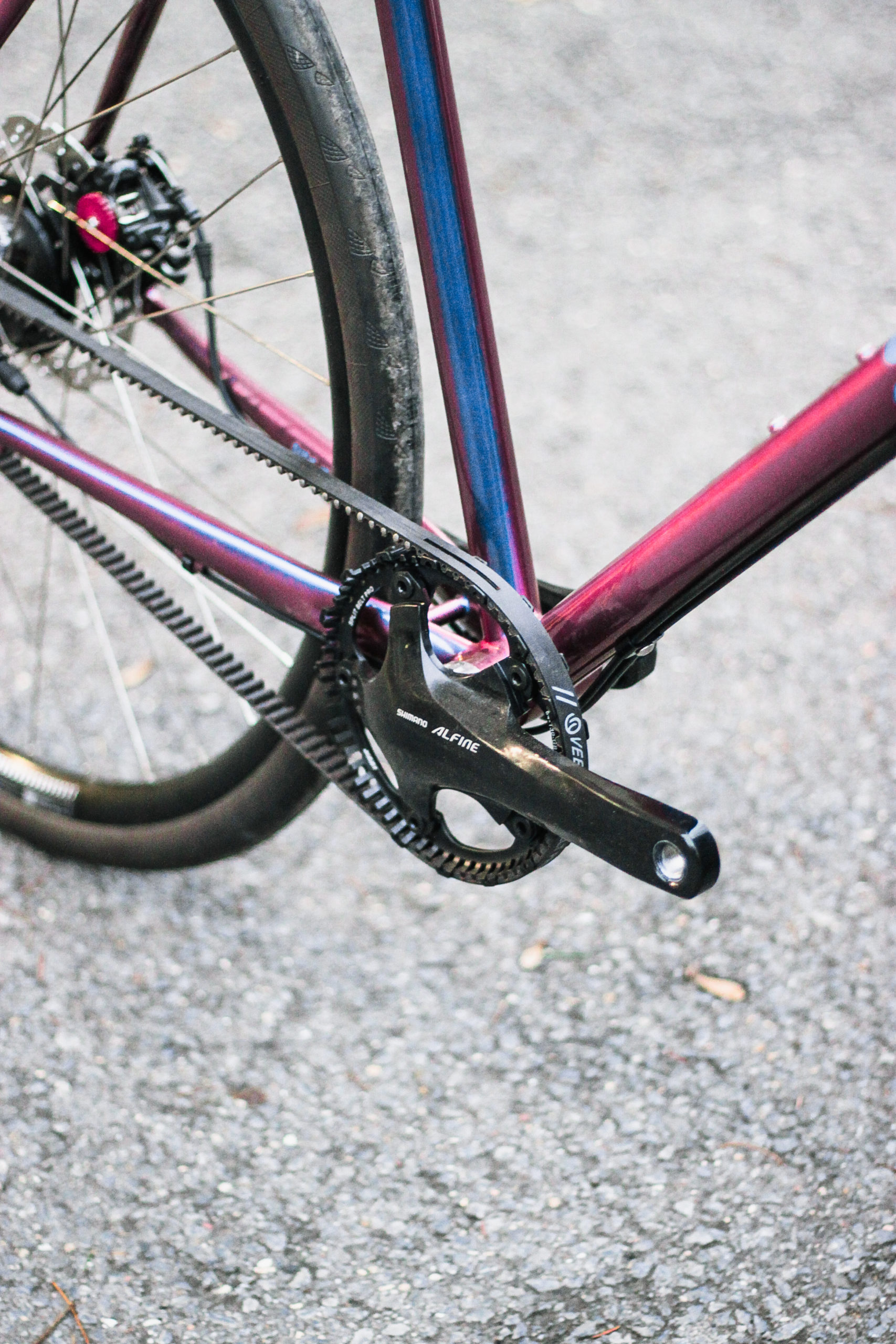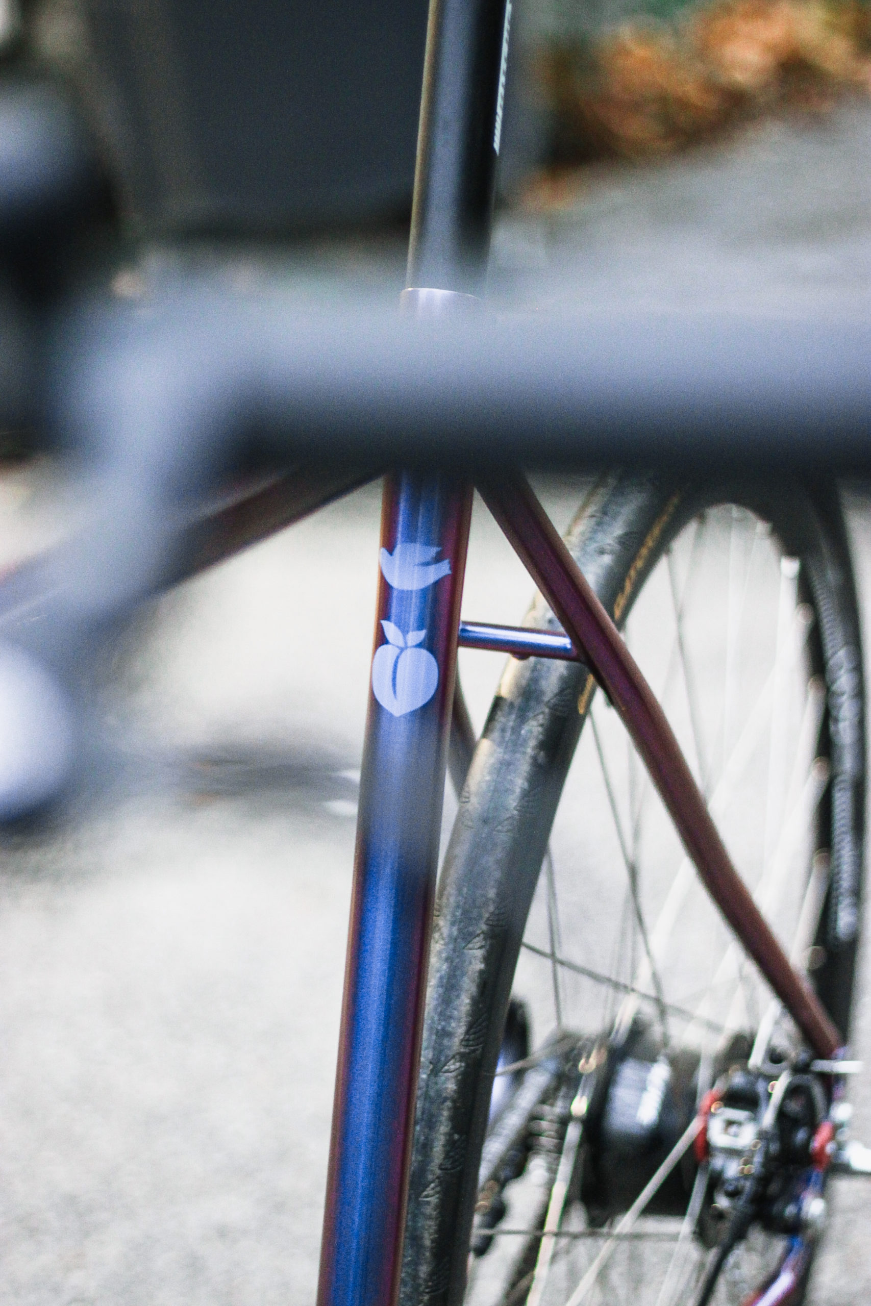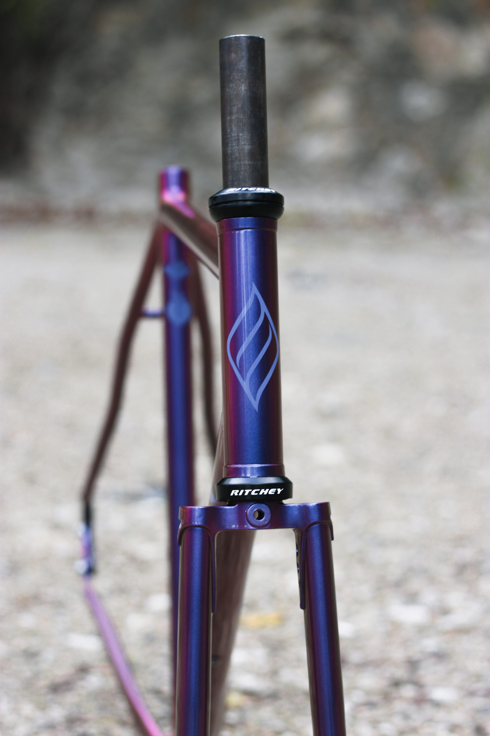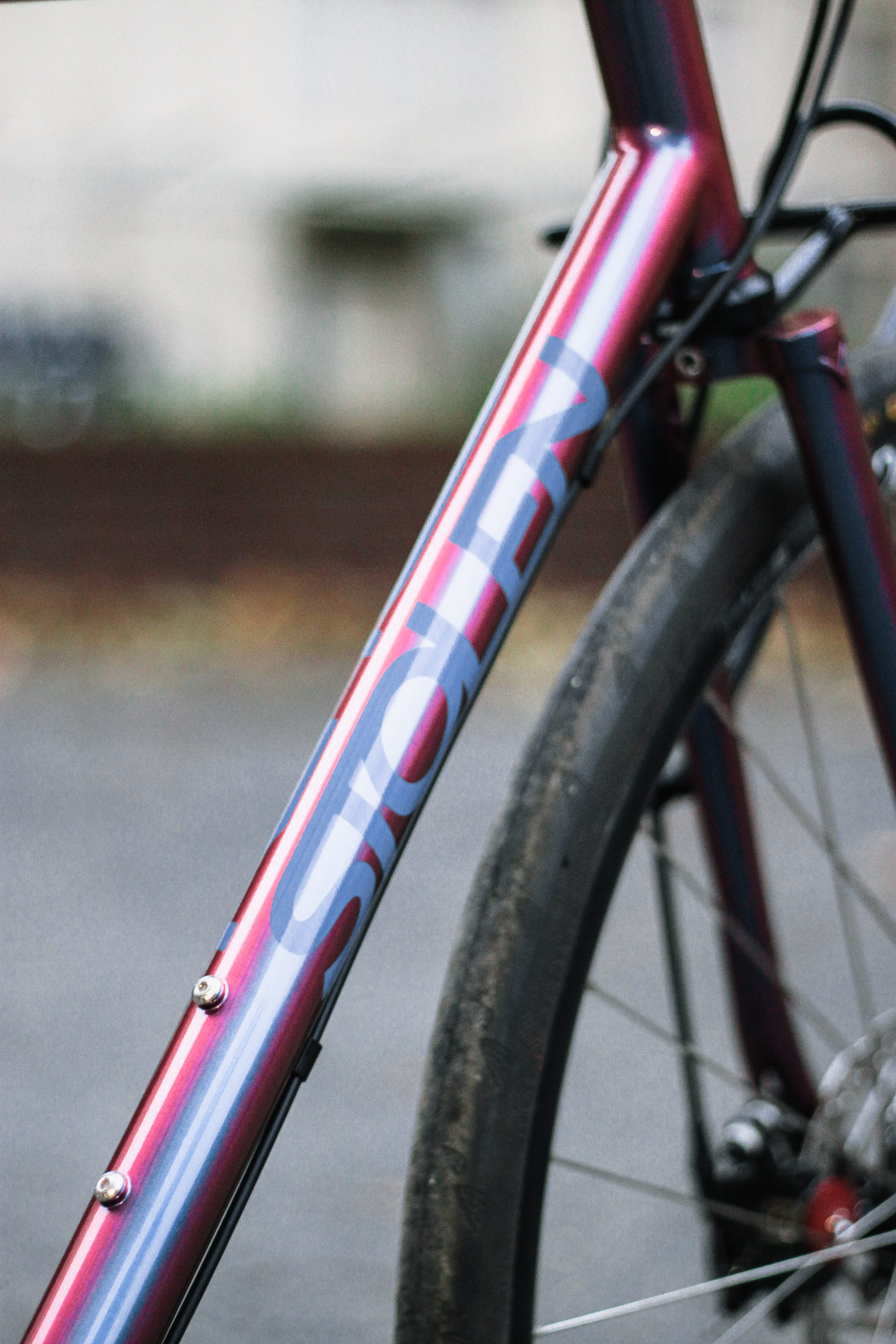Le montage complet de Pierre avec notre première transmission à courroie & vitesses intégrées, combo VEER x Shimano Alfine 8 vitesses. Un rayonnage à la carte sur cercles DT Swiss, cockpit & tige de selle Ritchey Comp, ainsi que notre Sunset rack custom pour la touche finale. Peinture caméléon bleu/rouge avec logos couleur lilas.