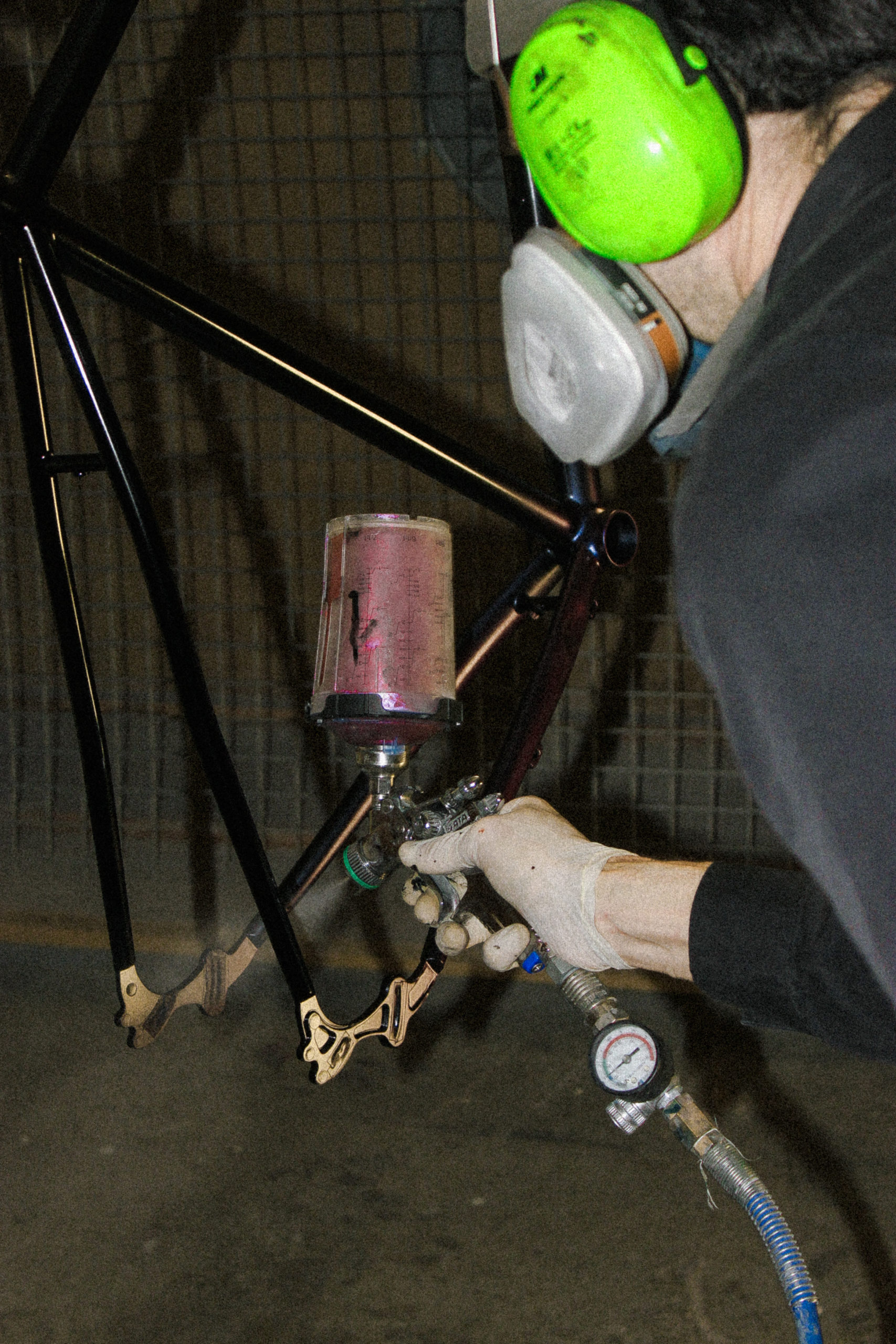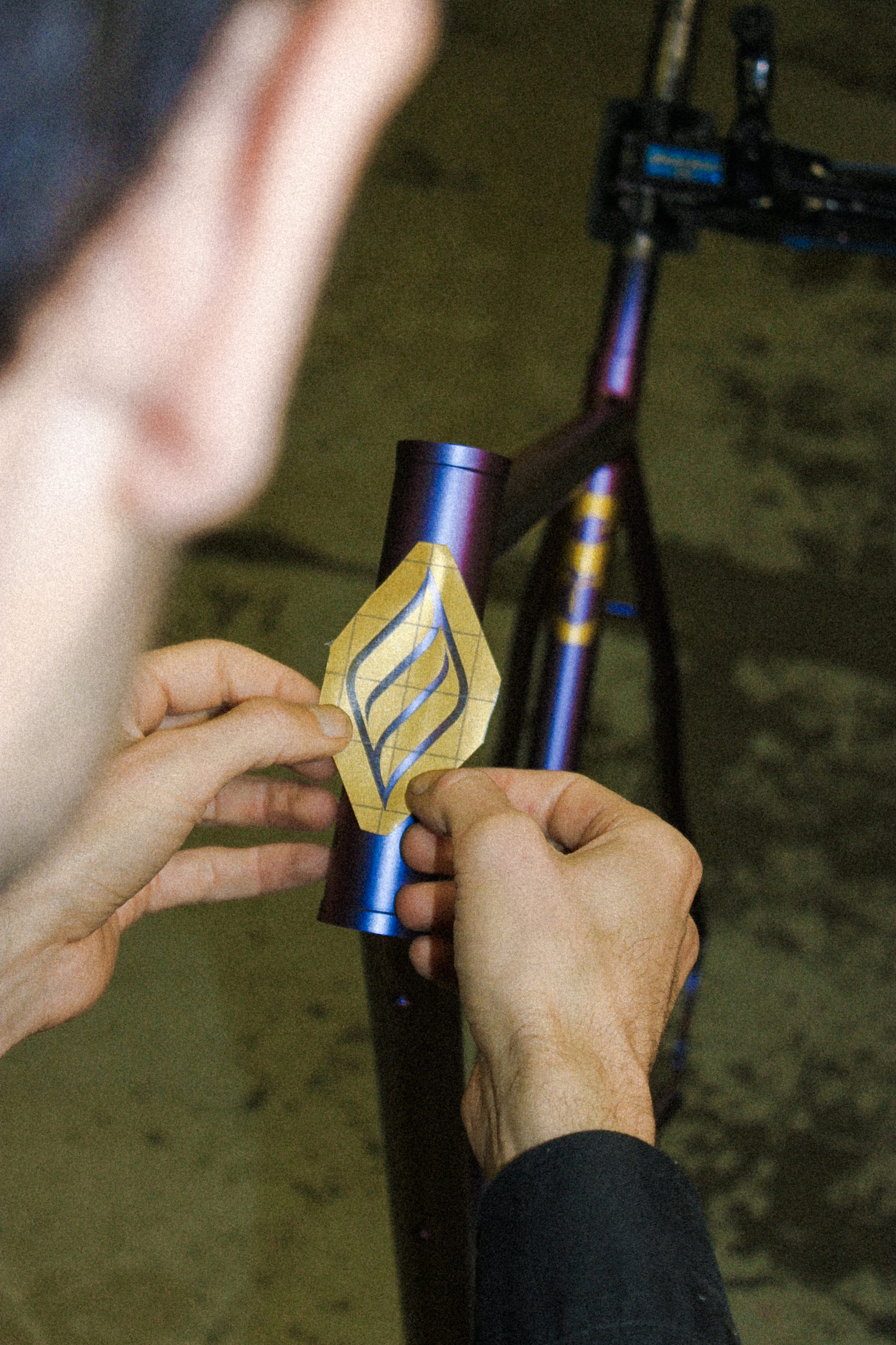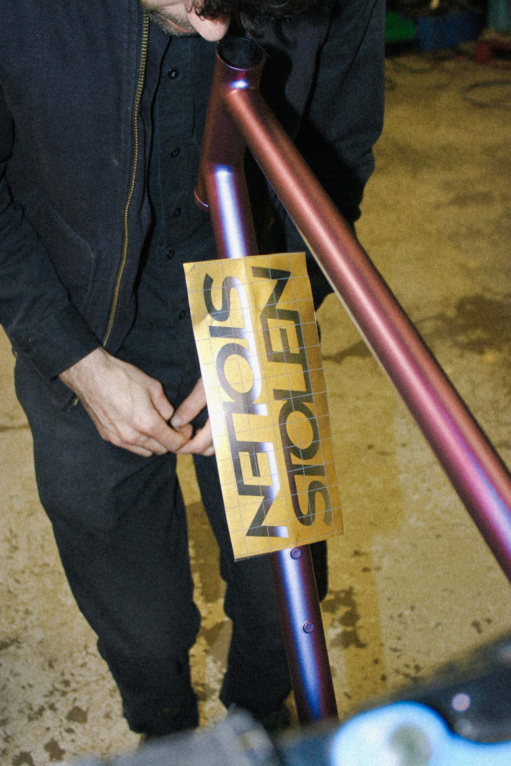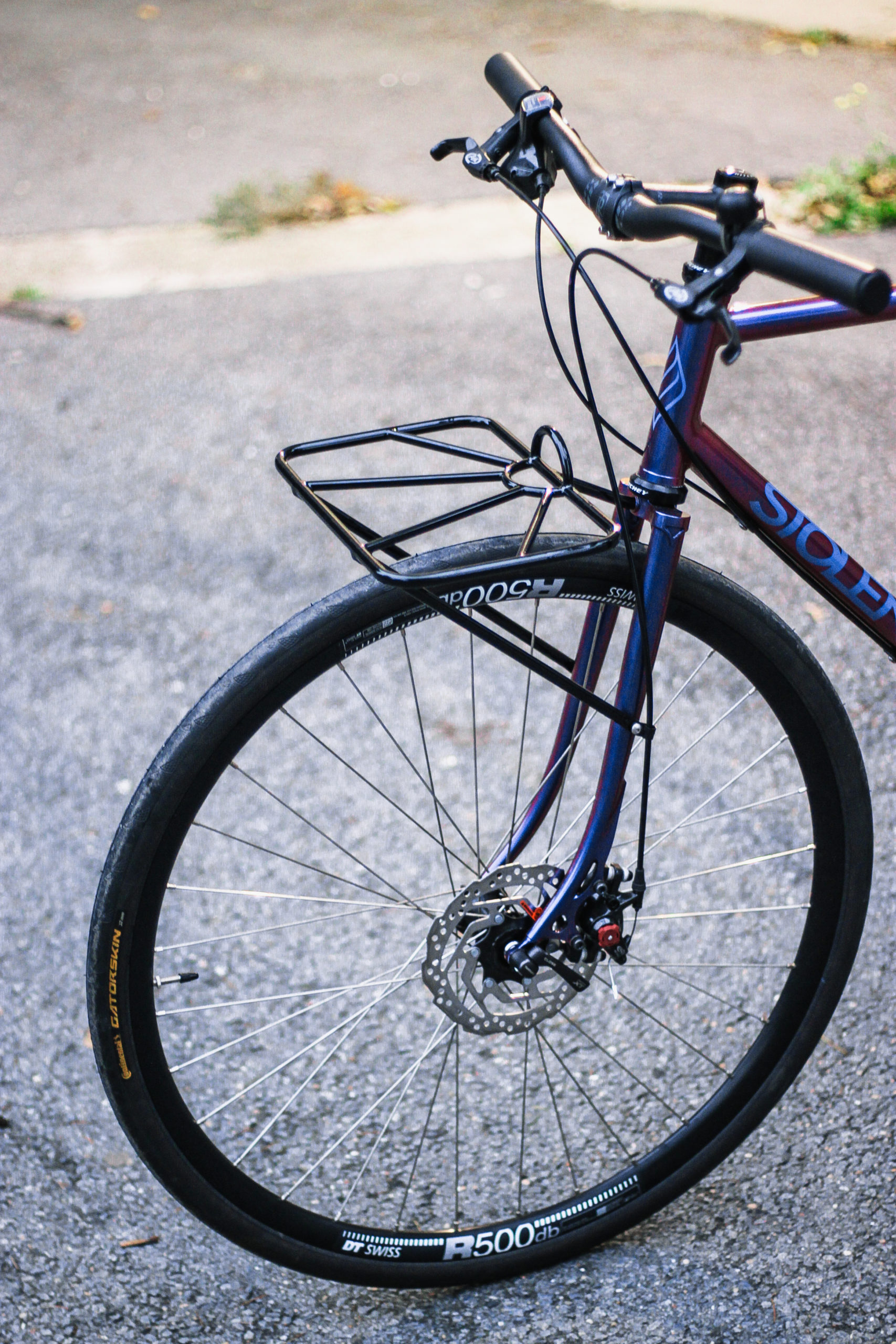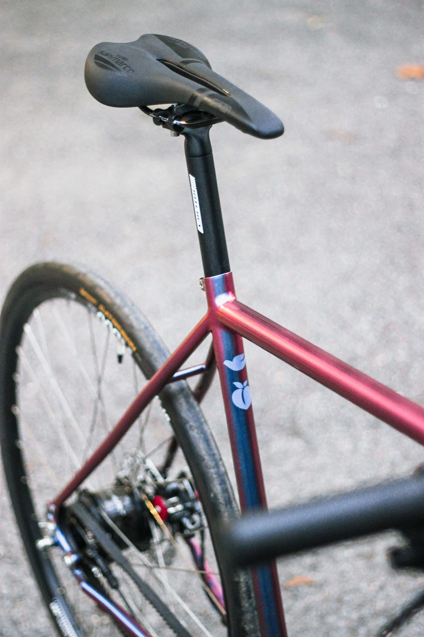 Le montage complet de Pierre avec notre première transmission à courroie & vitesses intégrées, combo VEER x Shimano Alfine 8 vitesses. Un rayonnage à la carte sur cercles DT Swiss, cockpit & tige de selle Ritchey Comp, ainsi que notre Sunset rack custom pour la touche finale. Peinture caméléon bleu/rouge avec logos couleur lilas.