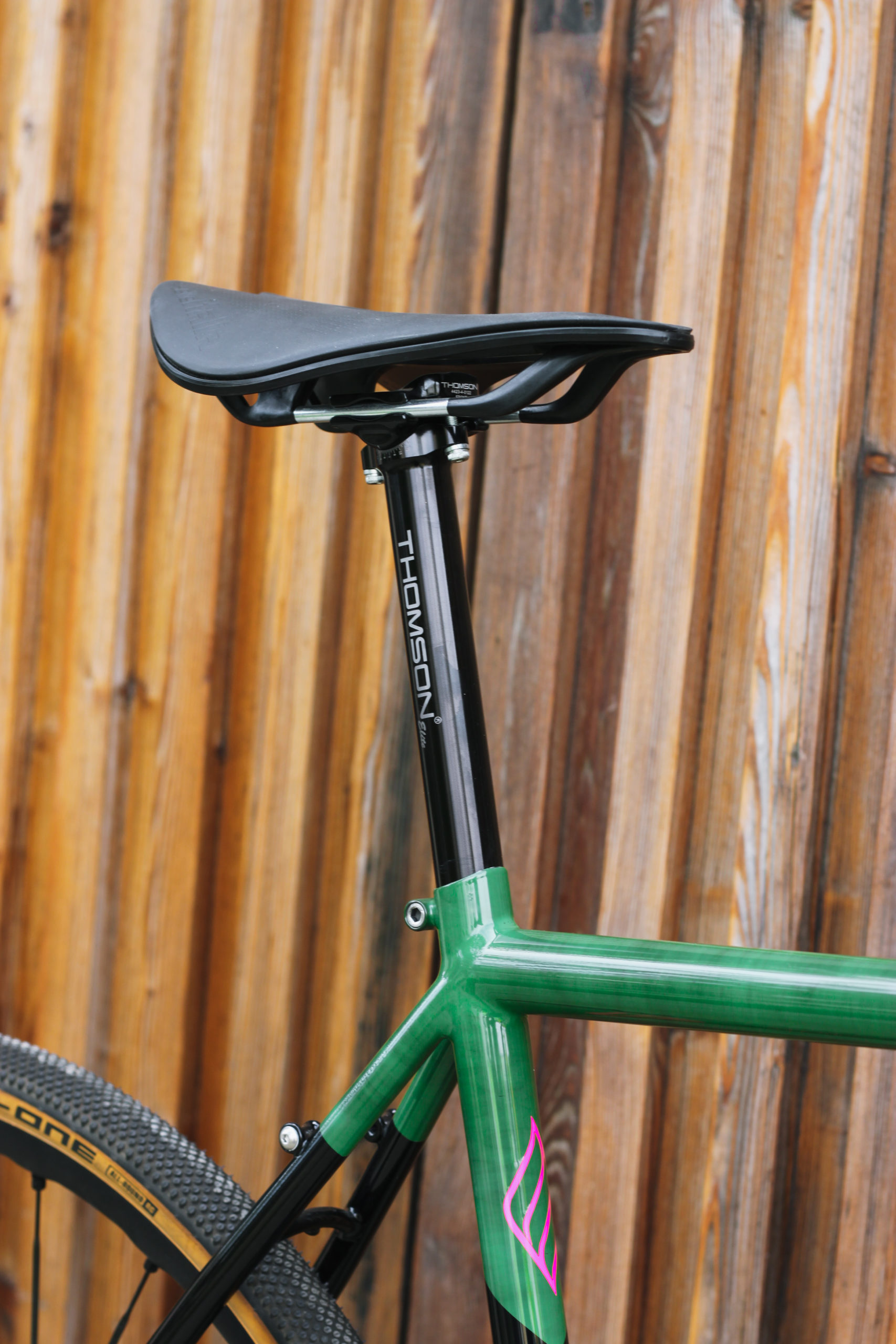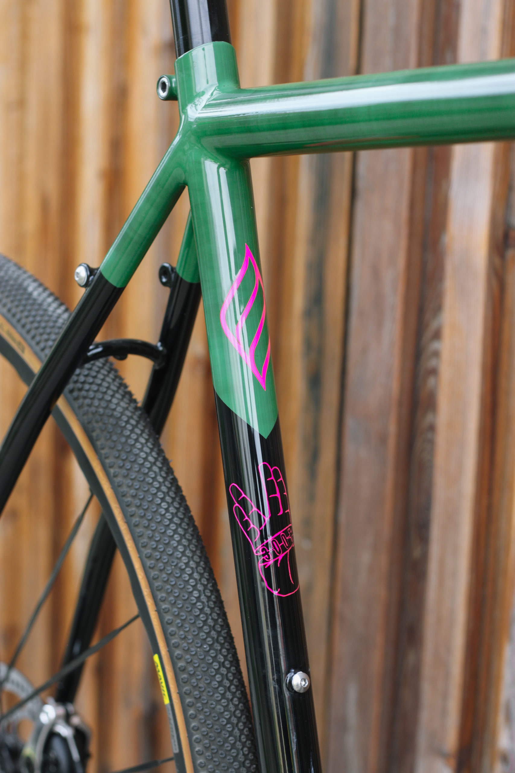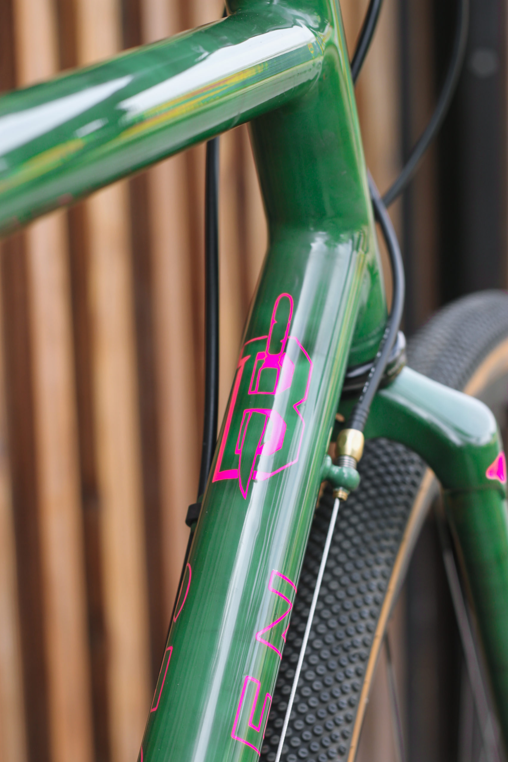 Alexis’ gravel bike in size 56cm made using Columbus Zona tubing. An interesting paint job consisting of smoky green with a sharp cut to black with hot pink standard + custom logos. Smoky effect achieved by literally smoking the green on our BBQ.