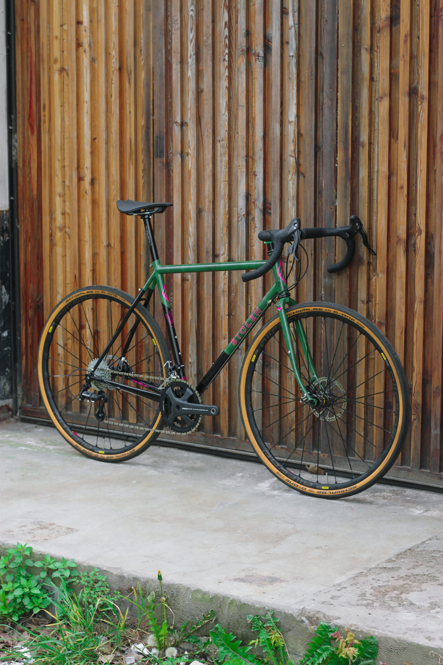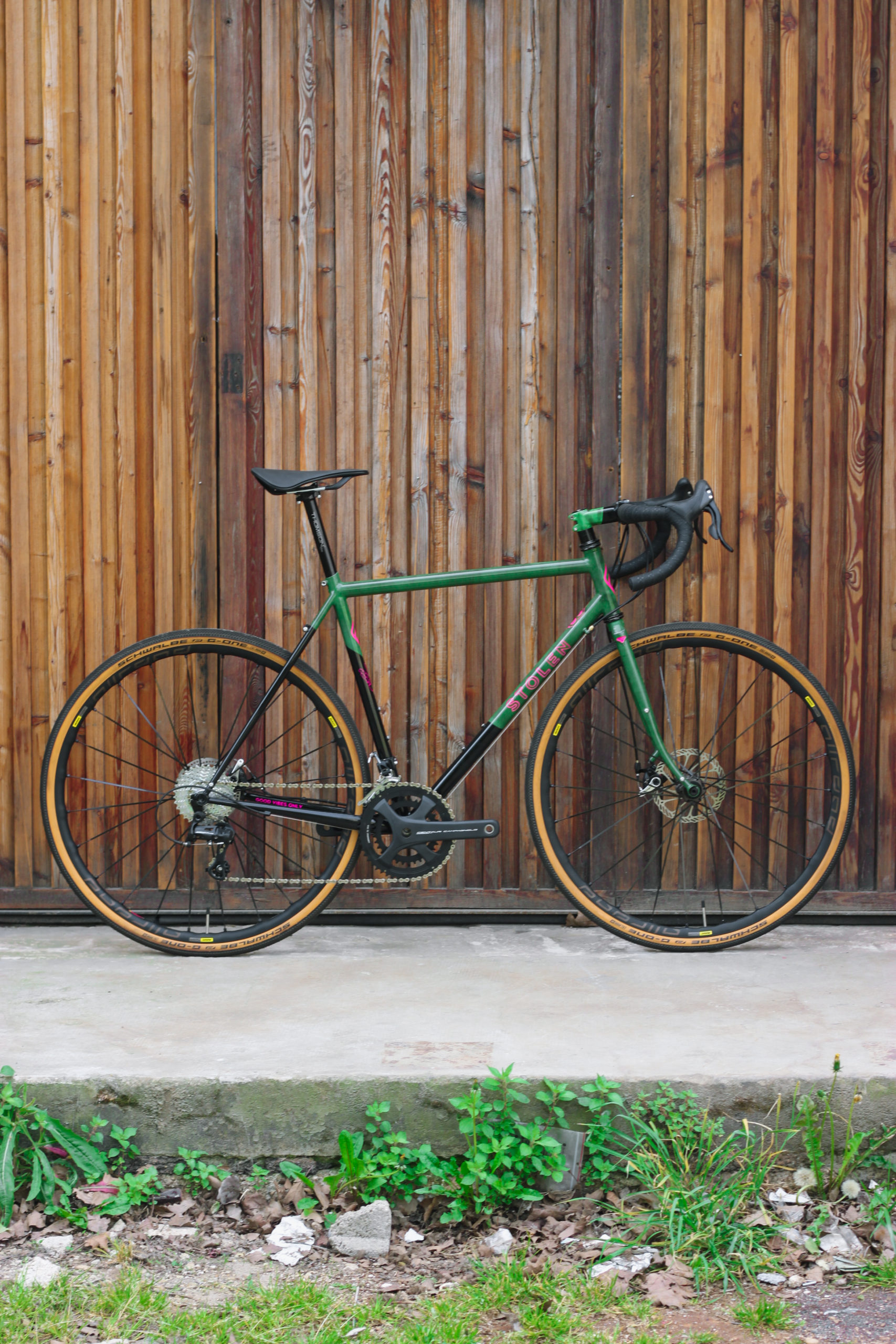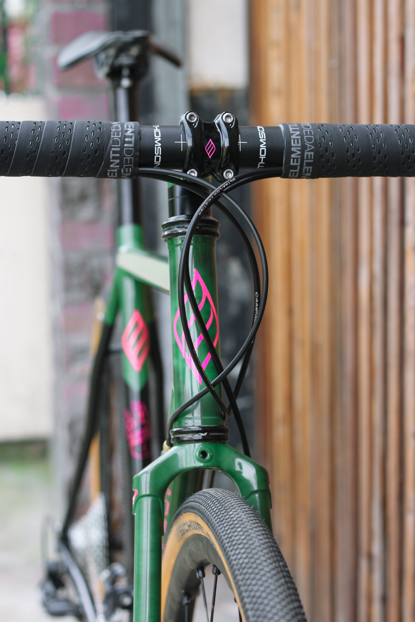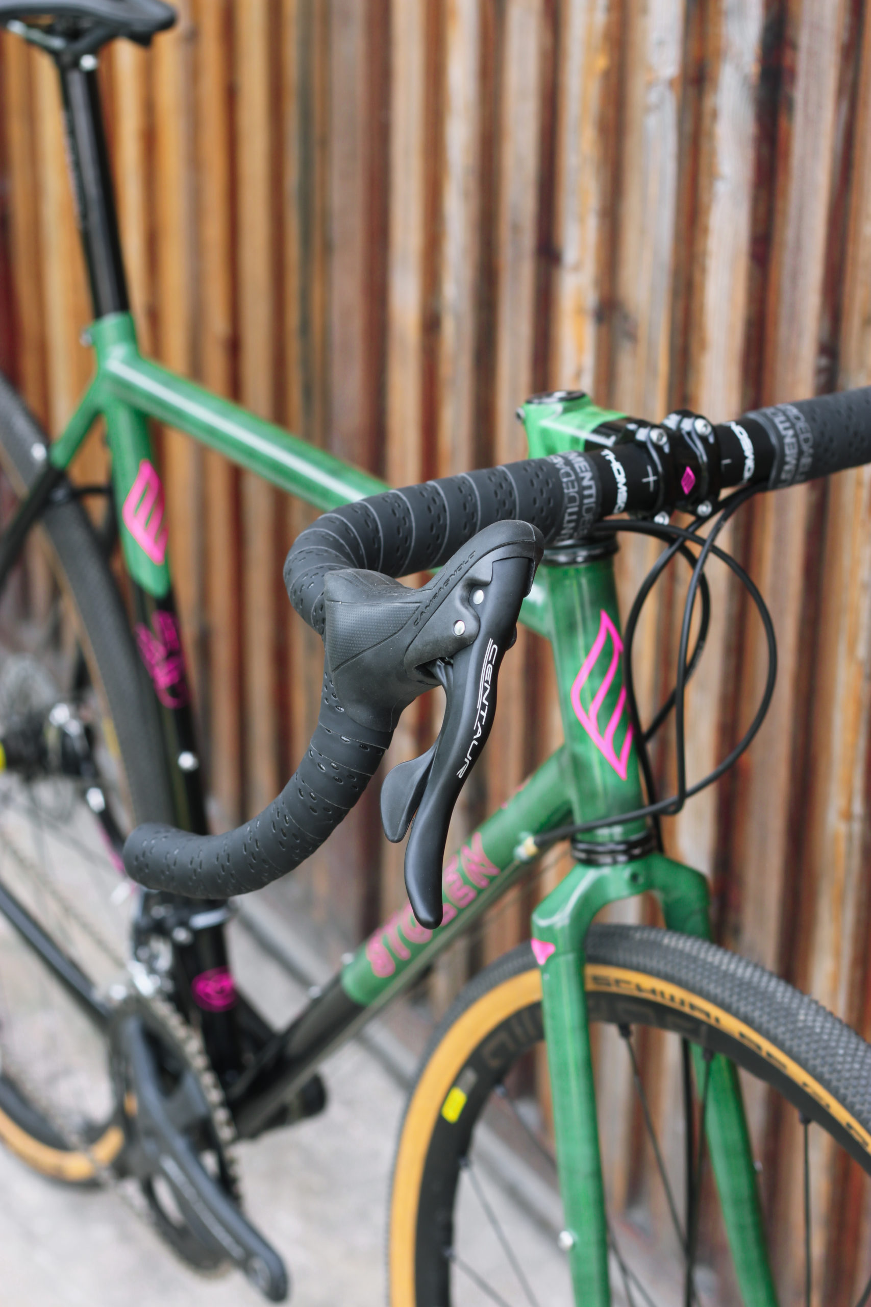 Alexis’ gravel bike in size 56cm made using Columbus Zona tubing. An interesting paint job consisting of smoky green with a sharp cut to black with hot pink standard + custom logos. Smoky effect achieved by literally smoking the green on our BBQ.