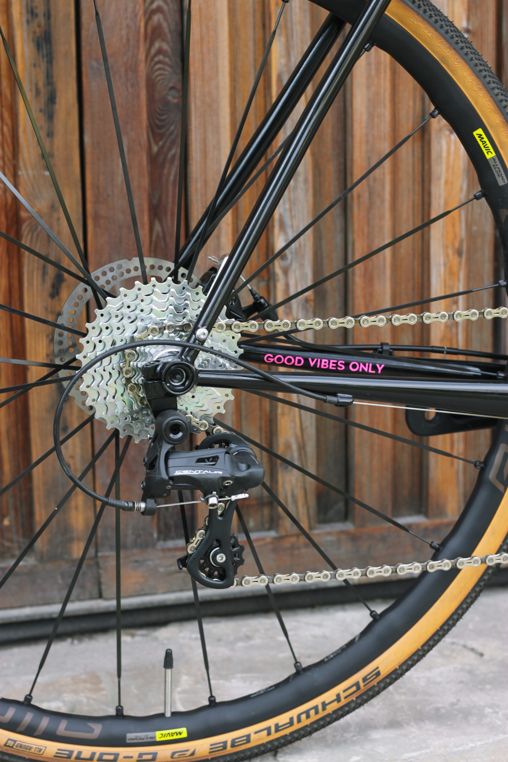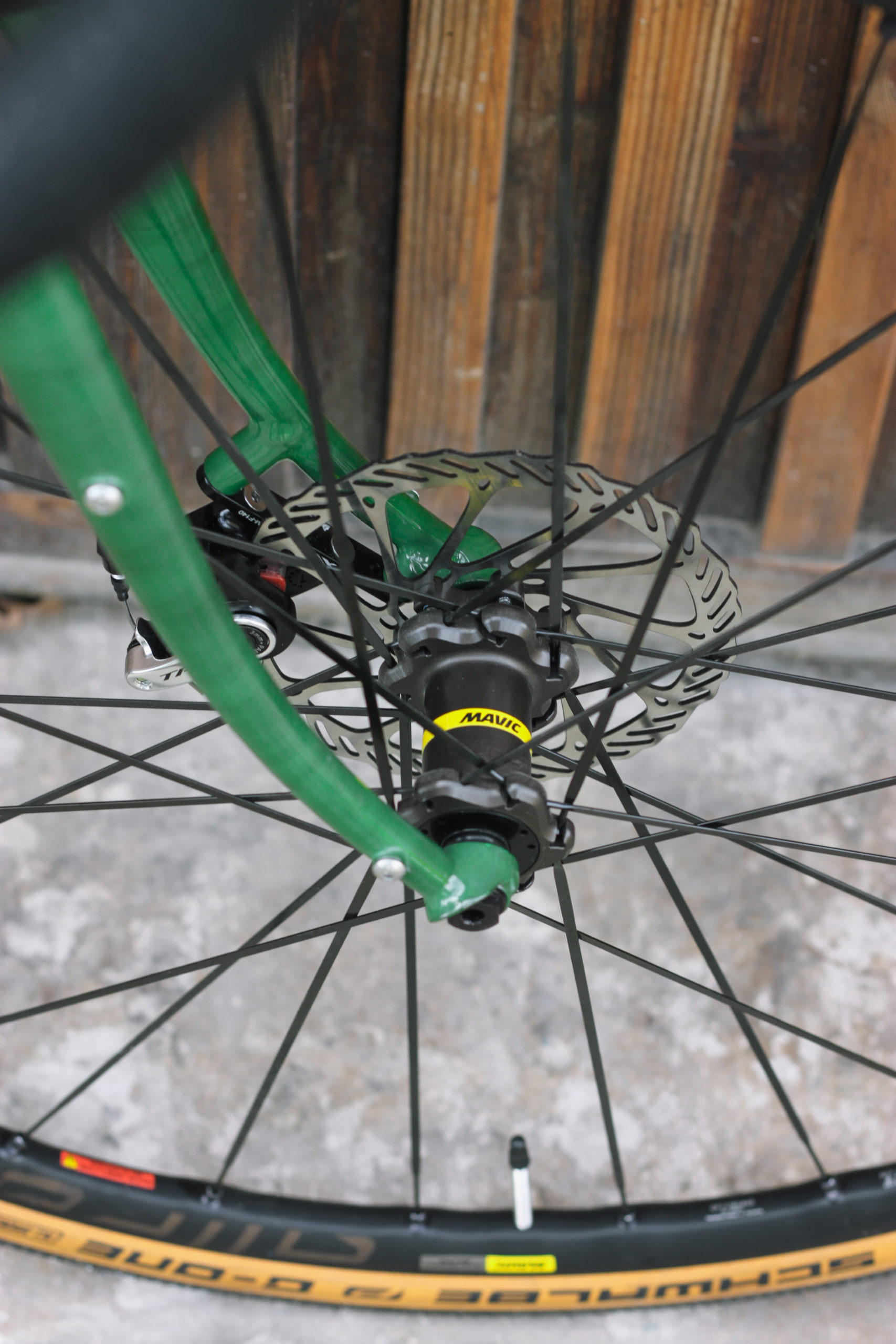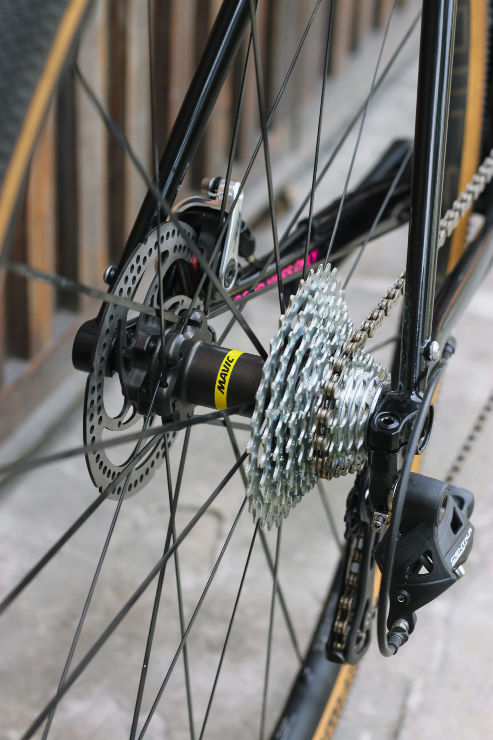 Campagnolo Centaur 11spd groupset, Mavic Allroad Elite wheelset + Schwalbe G-one tires, TRP Spyre brakes, Selle Italia Model-X saddle and Thomson finishing kit.