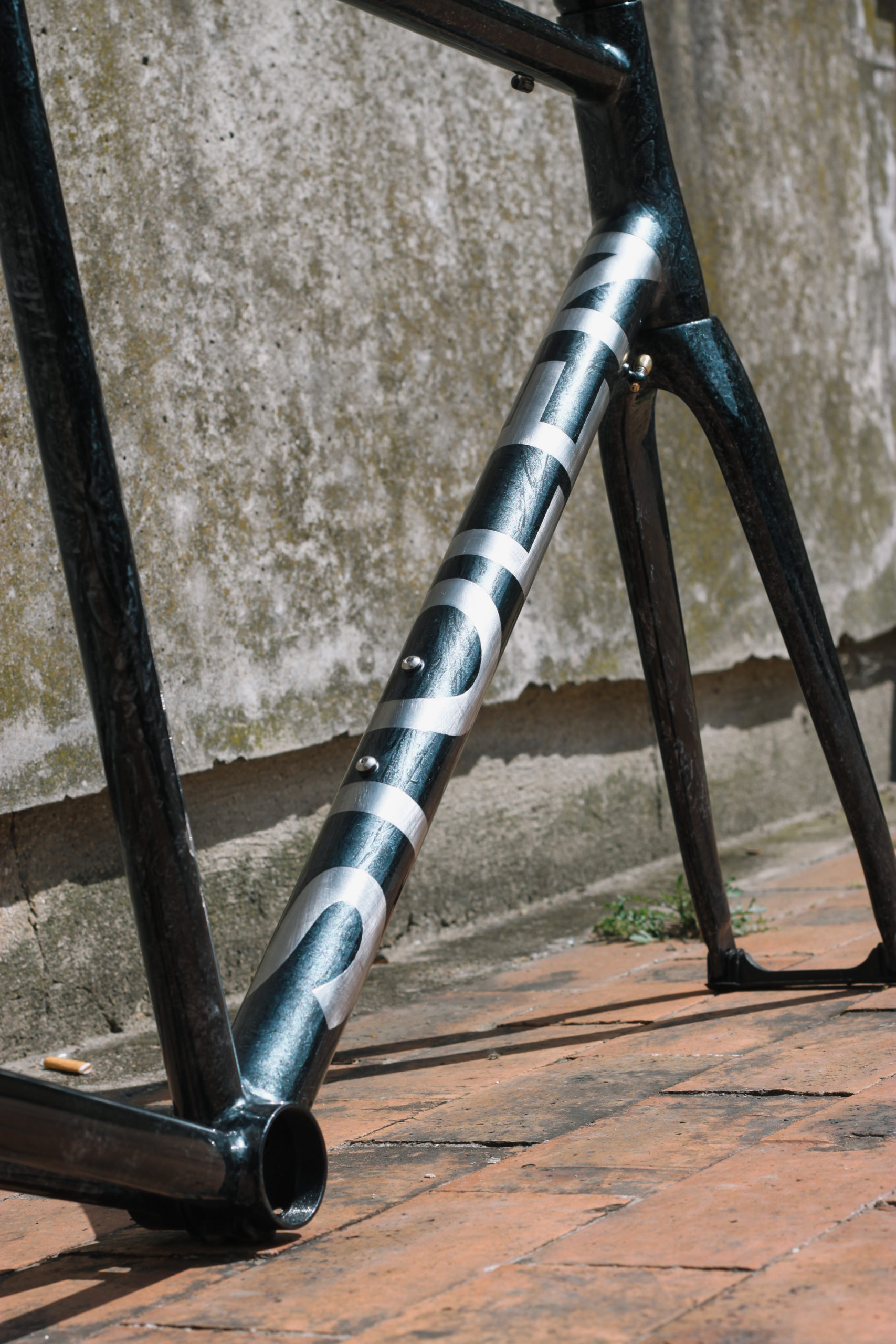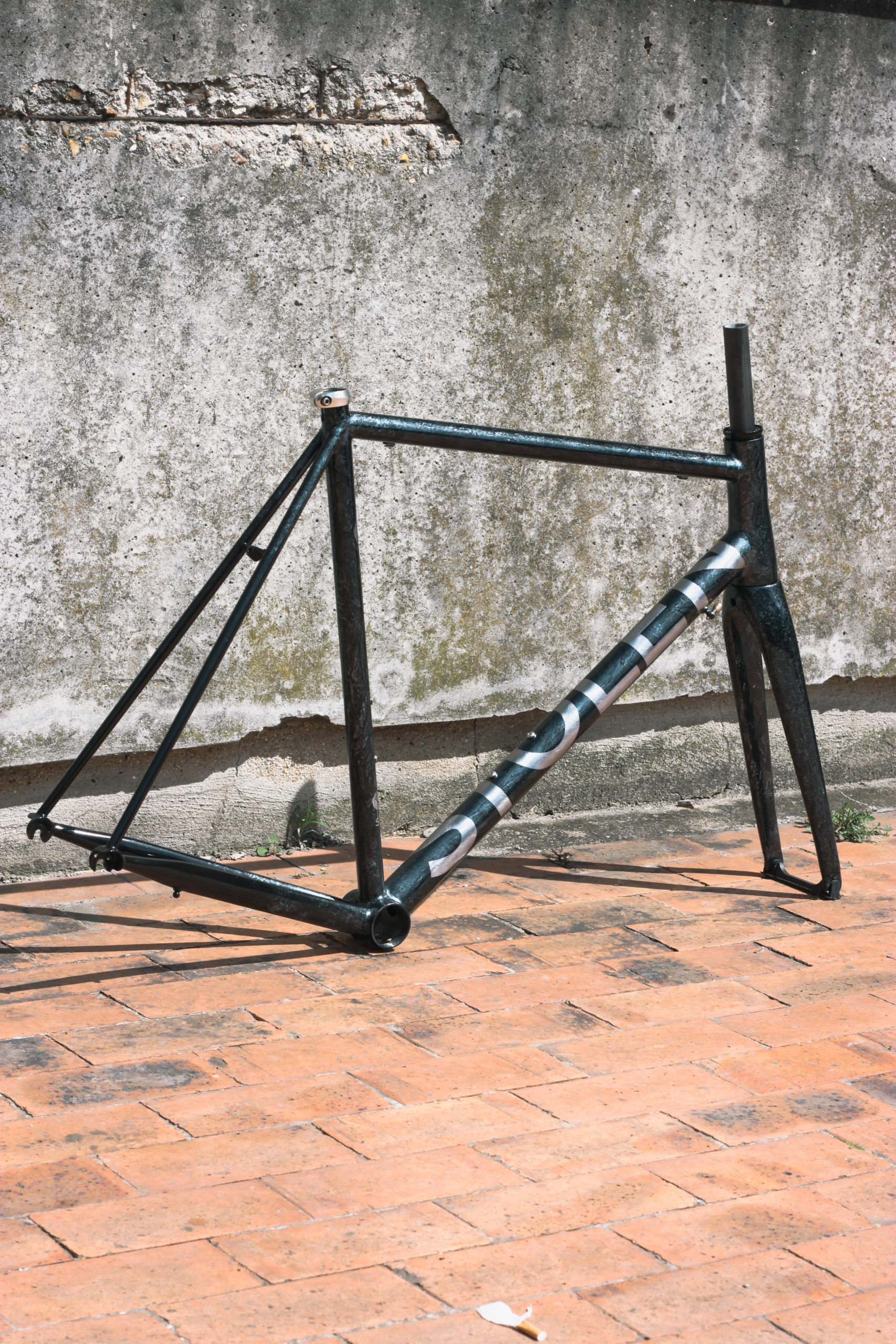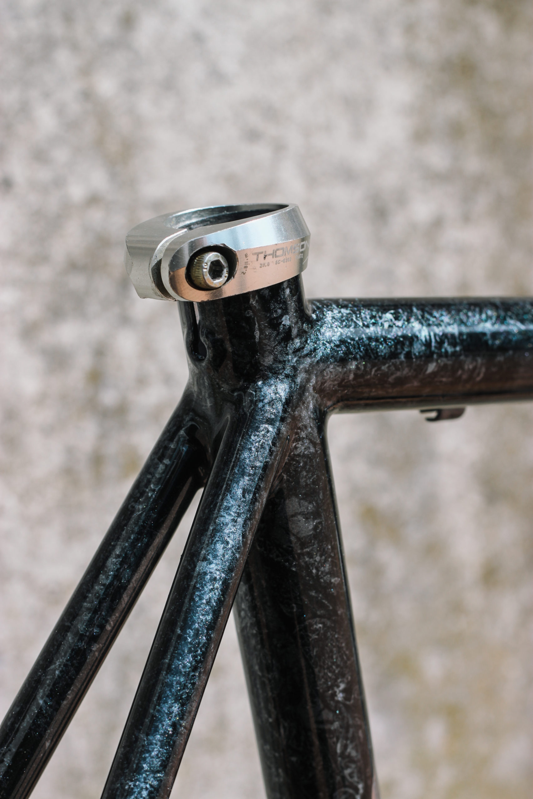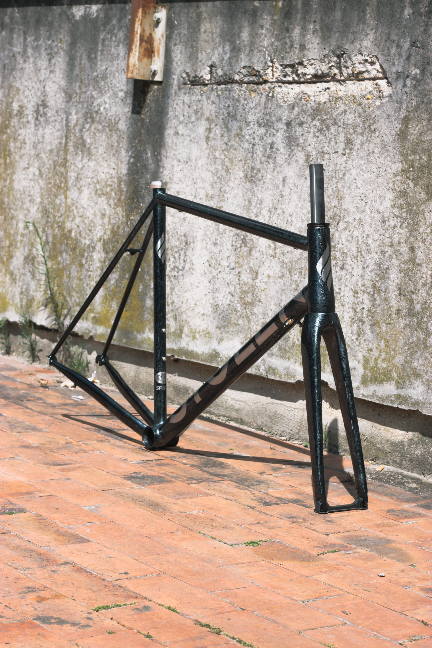 Premier kit cadre Stolen route, en Columbus Spirit HSS avec fourche carbone. L’idée était de mixer certaines caractéristiques du vélo de route classique, frein sur jante et passages externes notamment, en y ajoutant un peu de modernité. Nous avons utilisé un tube diagonal de 44mm pour une rigidité maximale, un tube horizontal ovalisé, un boitier T47 et un tube de direction conique.