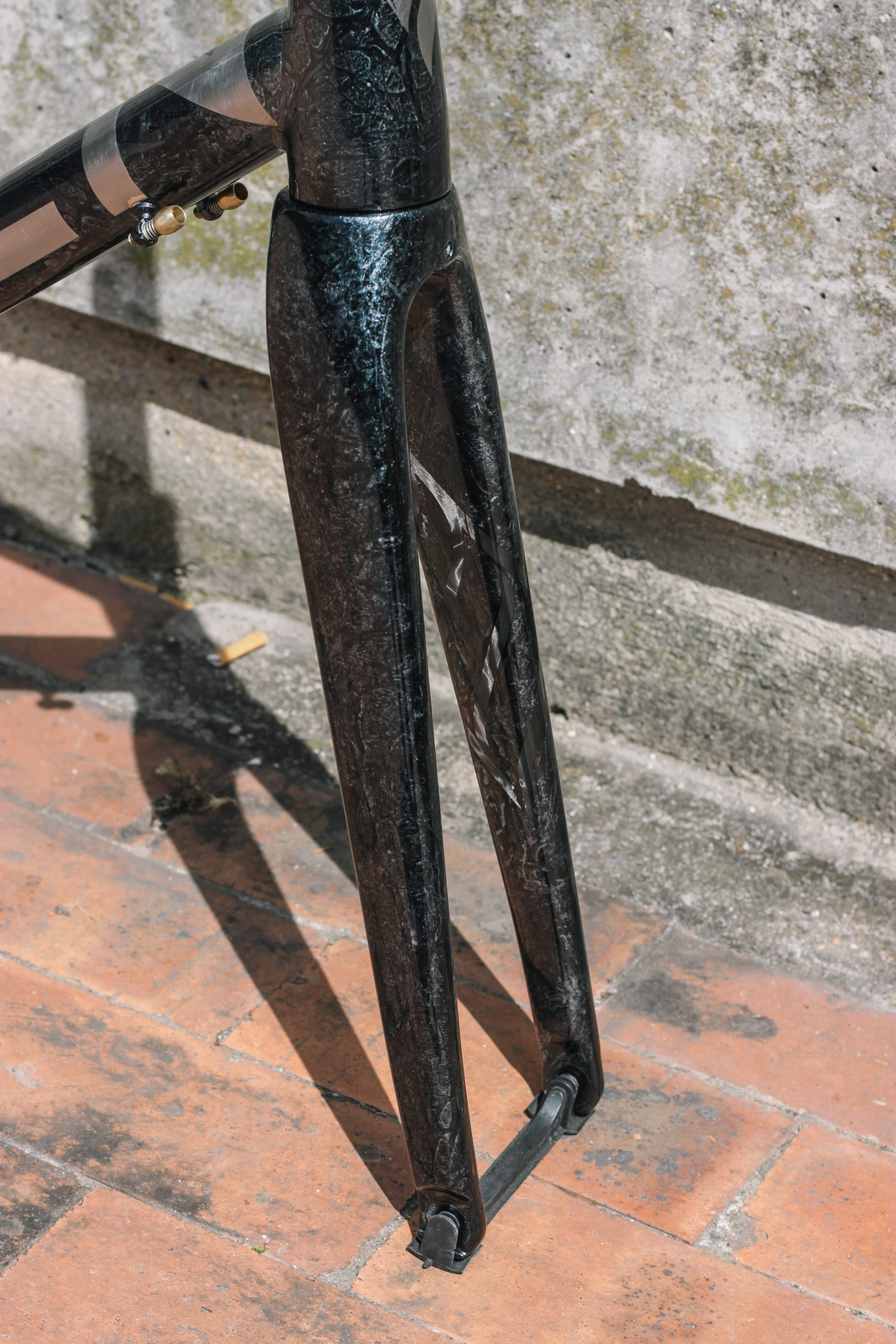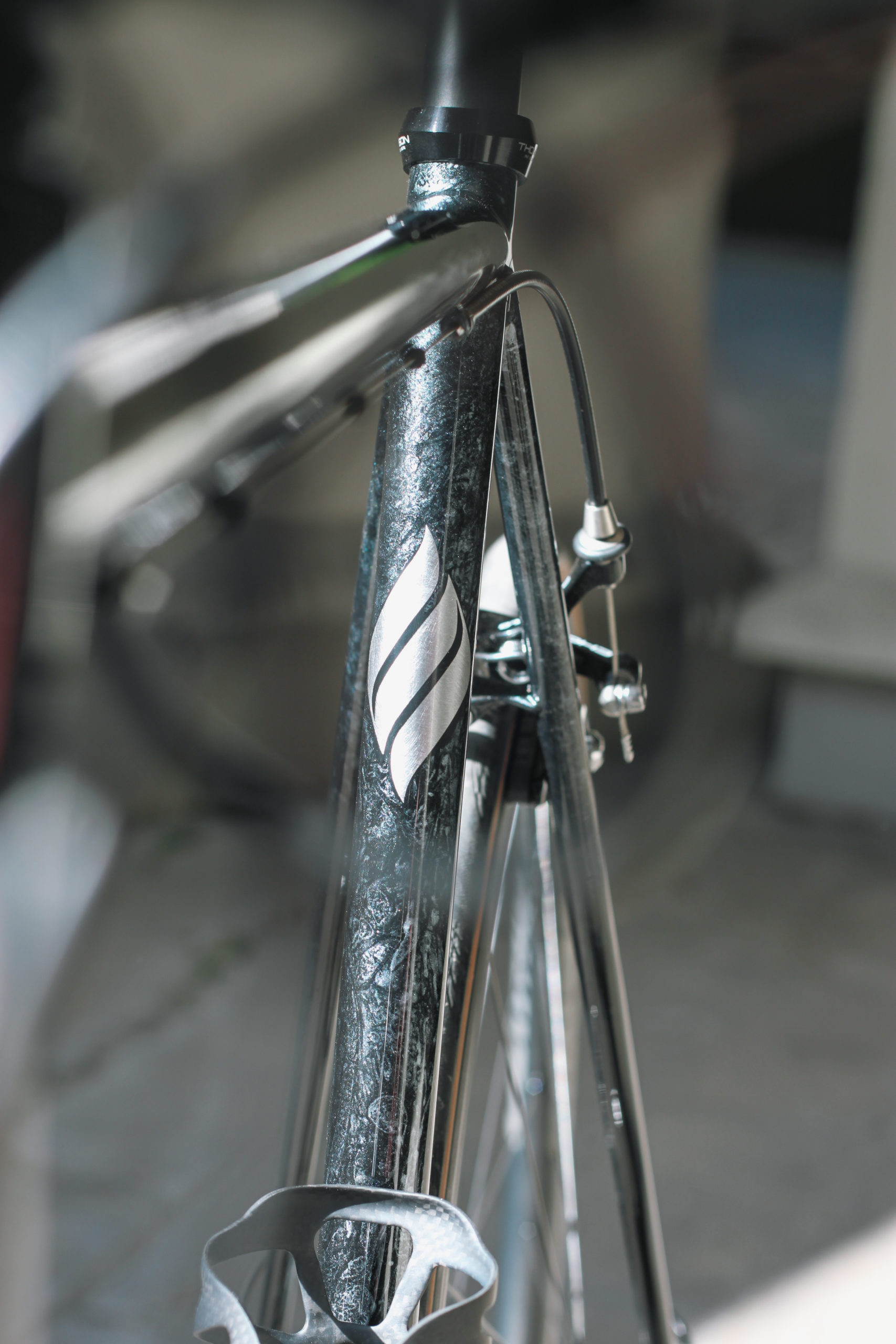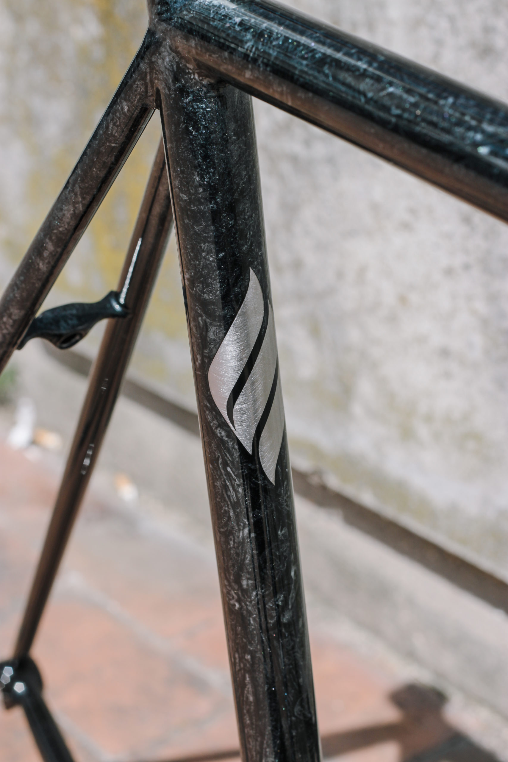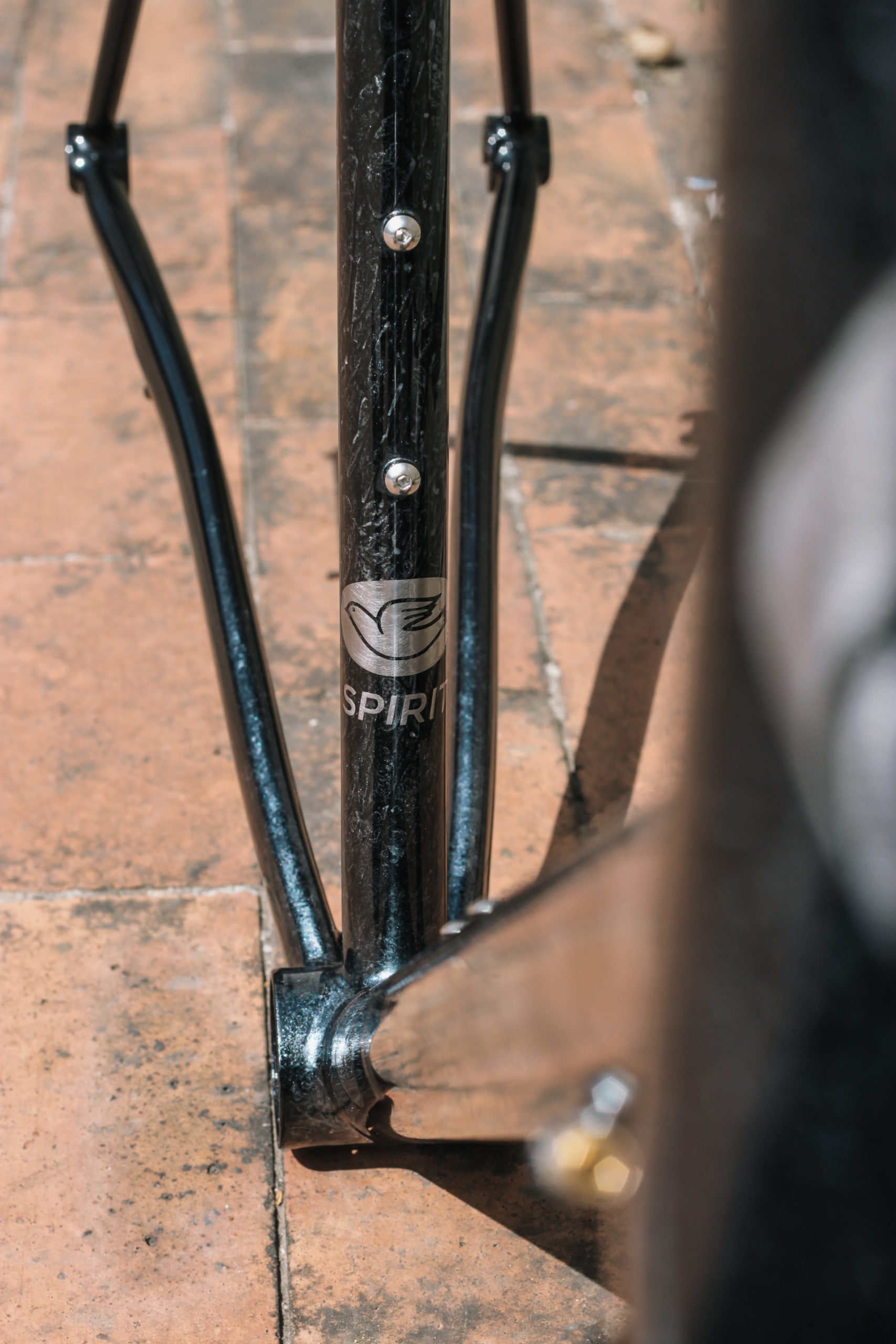Premier kit cadre Stolen route, en Columbus Spirit HSS avec fourche carbone. L’idée était de mixer certaines caractéristiques du vélo de route classique, frein sur jante et passages externes notamment, en y ajoutant un peu de modernité. Nous avons utilisé un tube diagonal de 44mm pour une rigidité maximale, un tube horizontal ovalisé, un boitier T47 et un tube de direction conique.