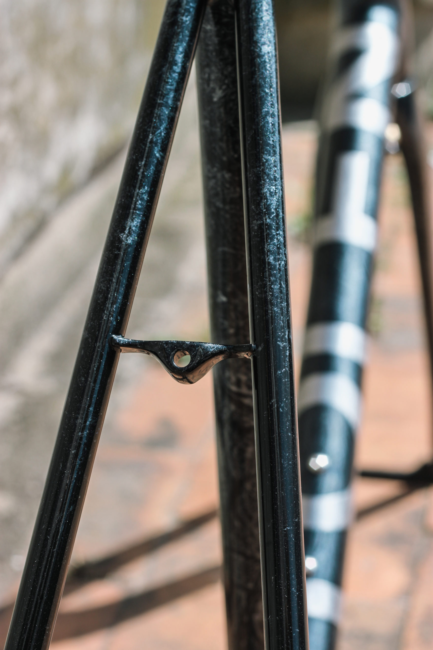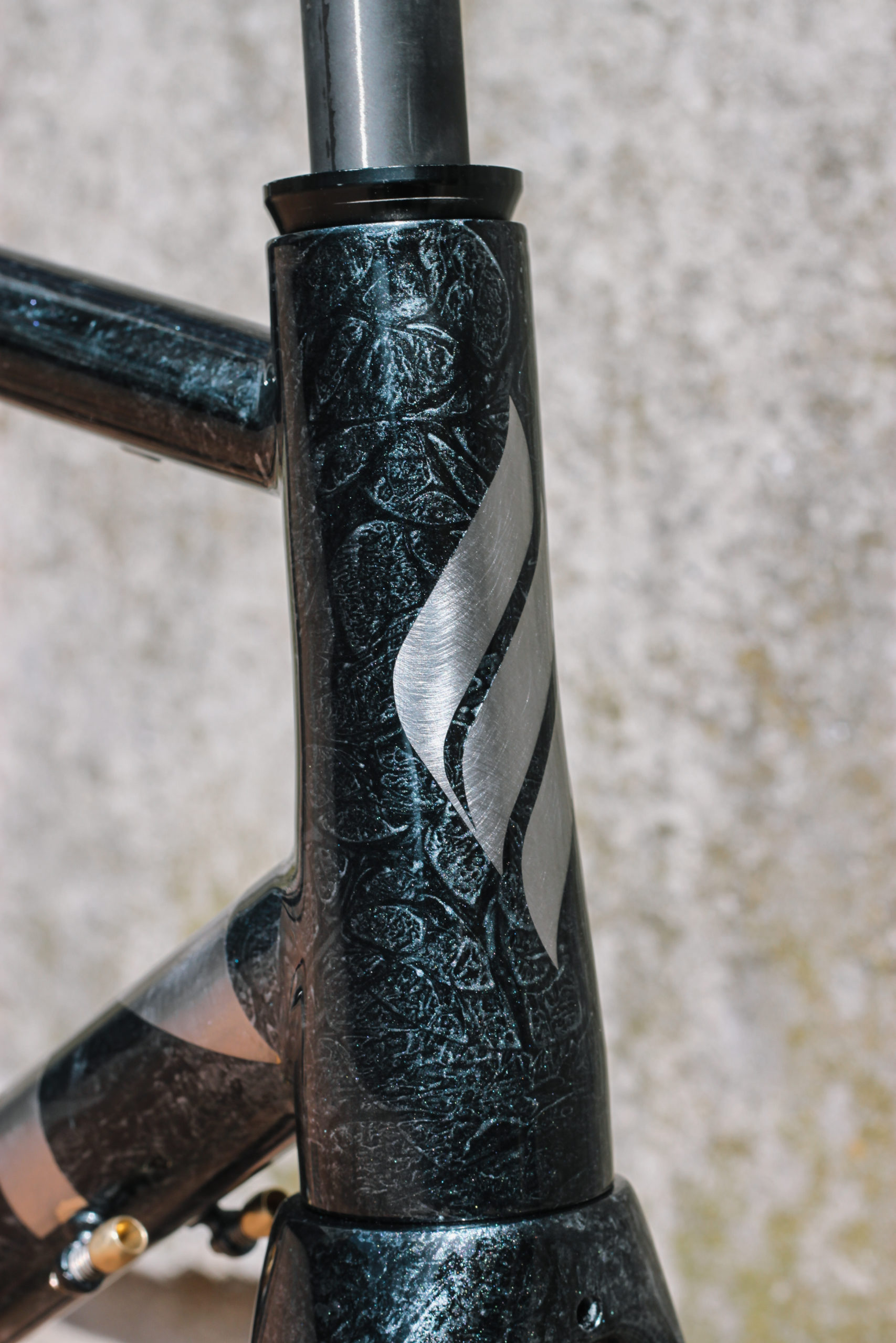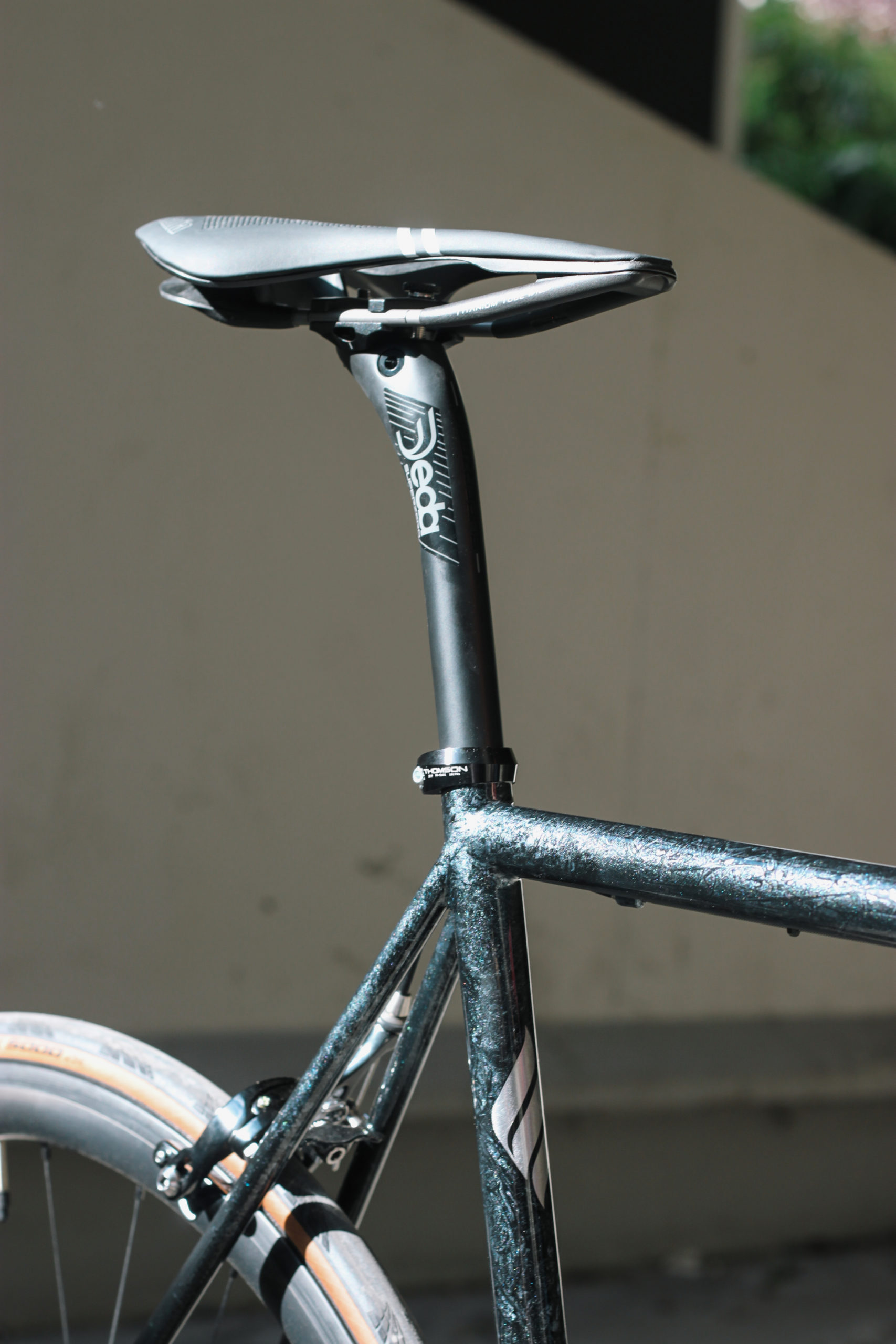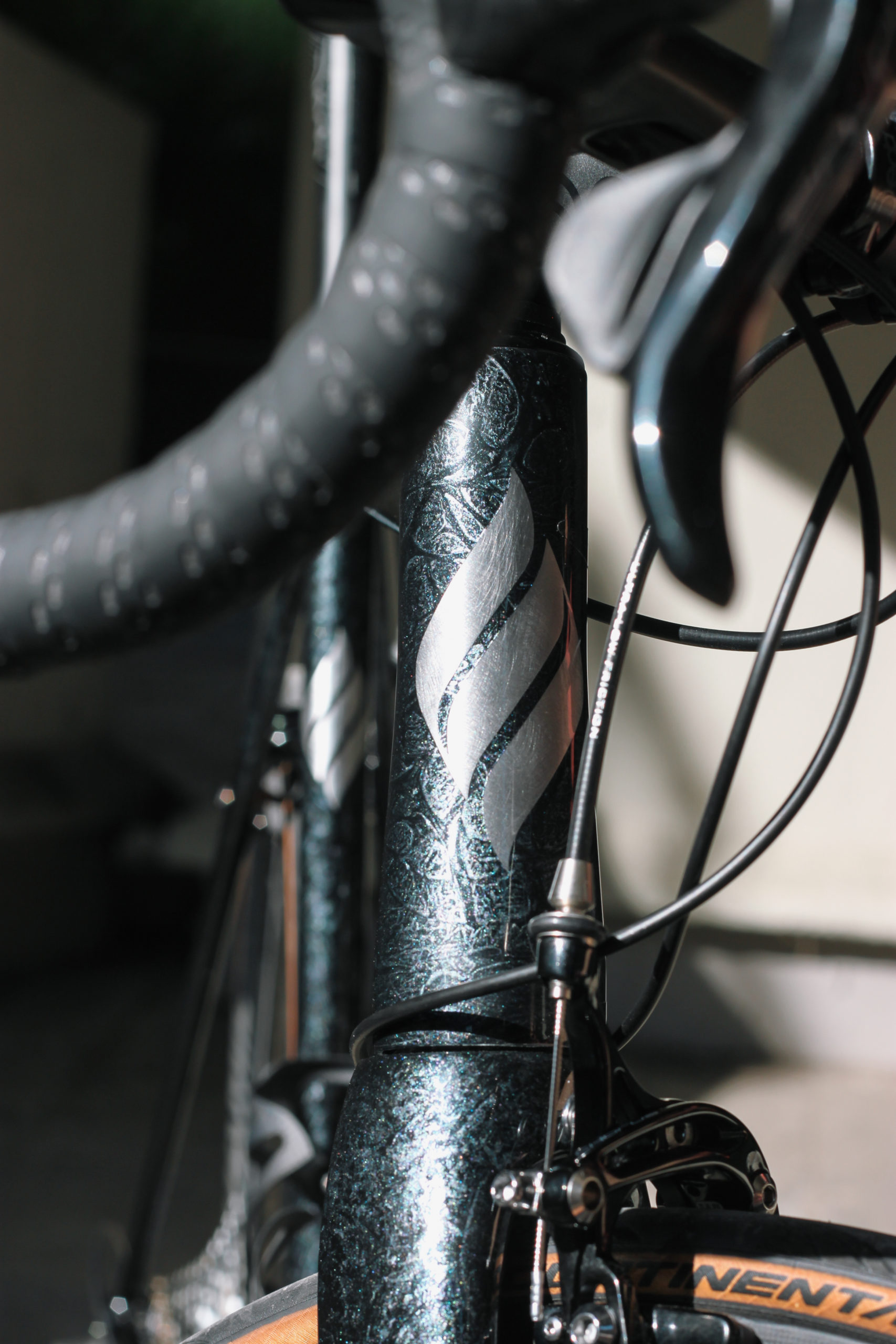 Premier kit cadre Stolen route, en Columbus Spirit HSS avec fourche carbone. L’idée était de mixer certaines caractéristiques du vélo de route classique, frein sur jante et passages externes notamment, en y ajoutant un peu de modernité. Nous avons utilisé un tube diagonal de 44mm pour une rigidité maximale, un tube horizontal ovalisé, un boitier T47 et un tube de direction conique.