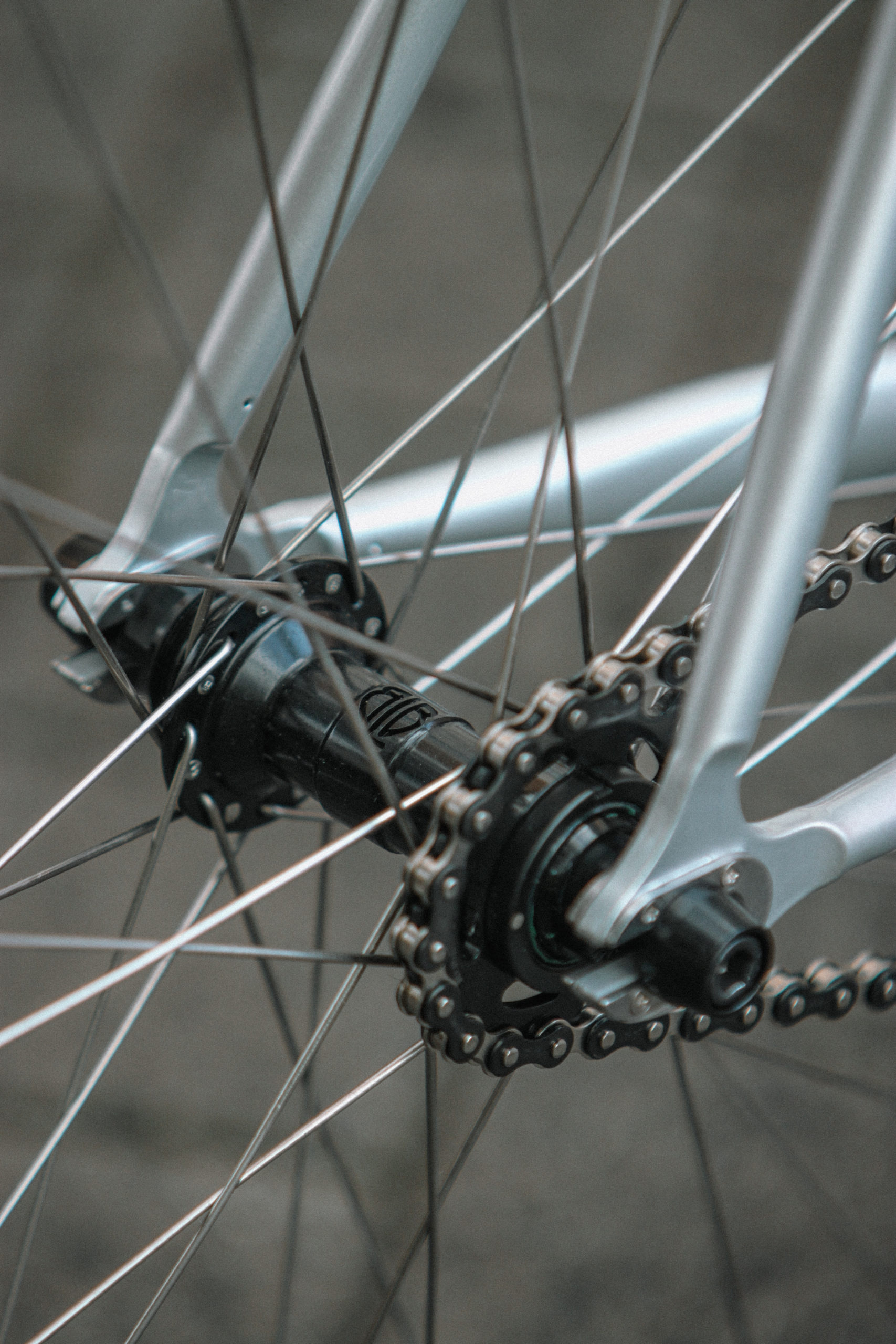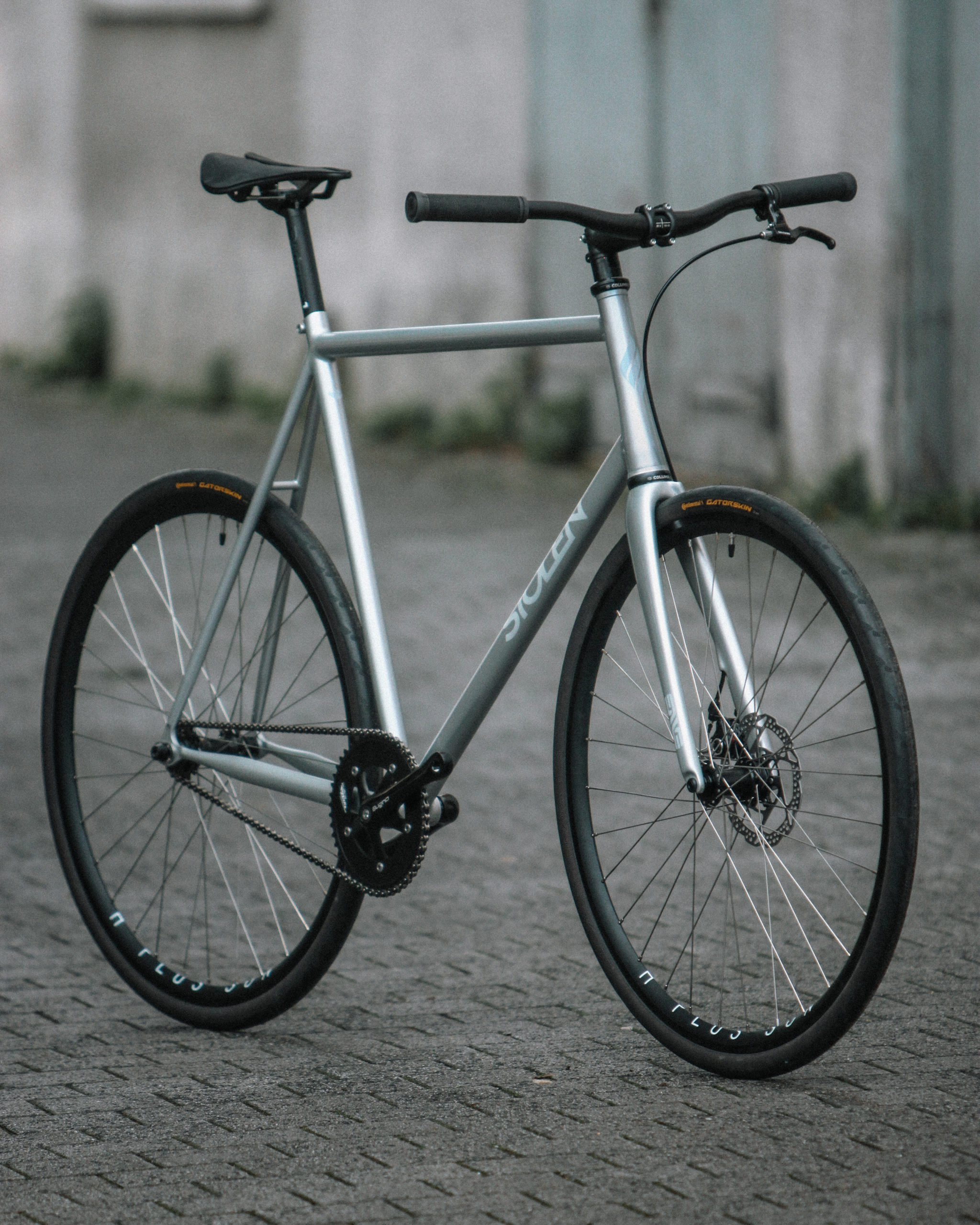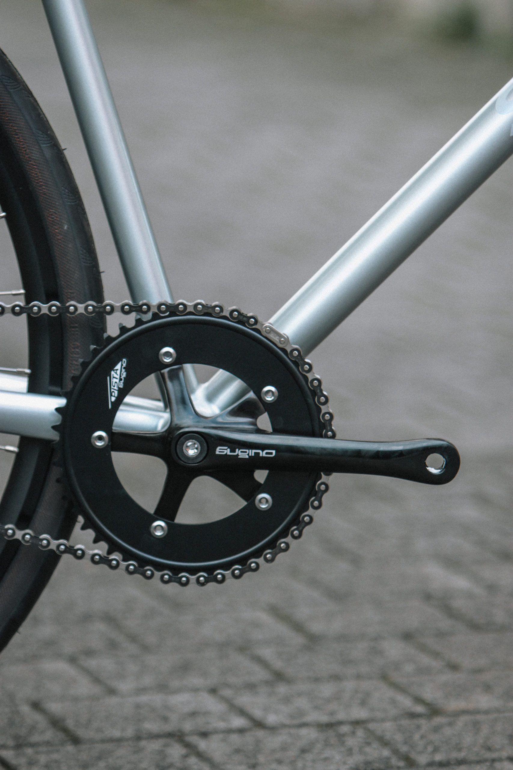 Le pignon fixe de Florent. Trompettiste, compositeur, professeur, directeur d’orchestre, Florent jongle avec toutes ses activités du spectacle dans Paris, et roulait depuis plusieurs années sur une conversion d’un vieux vélo de route en fixe. Il a souhaité se faire plaisir pour ses multiples trajets hebdomadaires, avec un vélo plus réactif, plus léger et avec frein à disque.